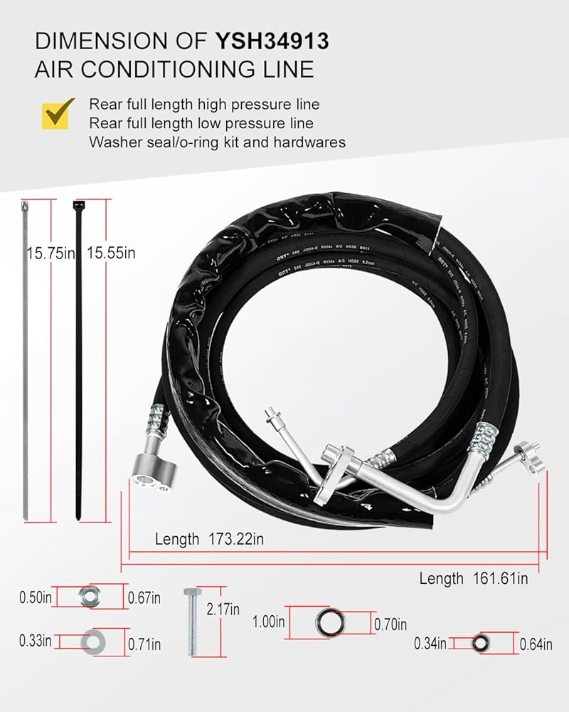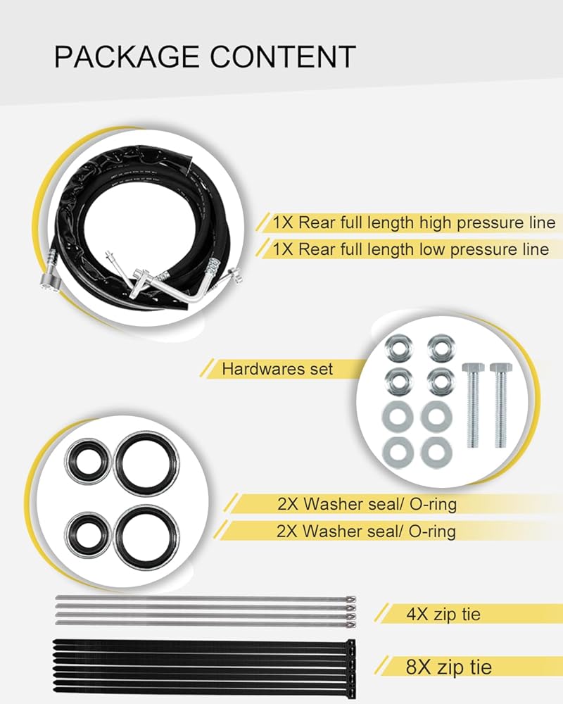 【PACKAGE INCLUDE】This AC Line Replacement includes Rear full length high pressure line, rear full length low pressure line, washer seal/o-ring kit and hardware kit.