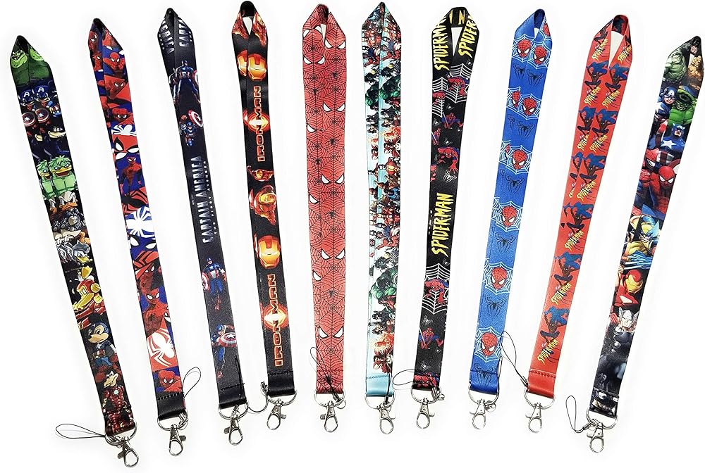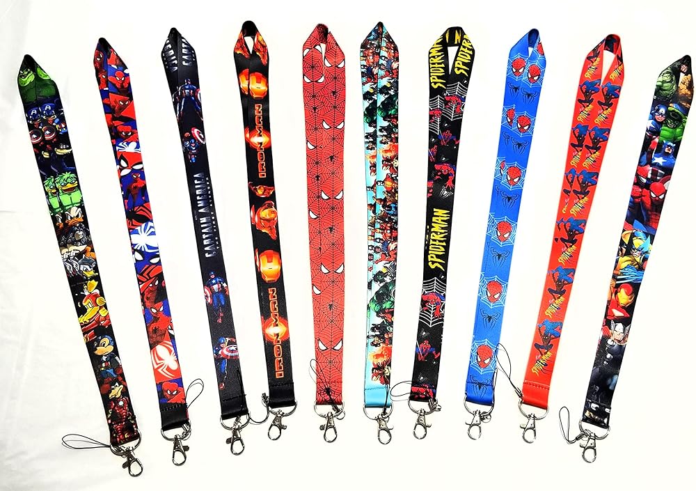 J & A Best Deals New 2019 Marvel Anime Characters Avengers-Spider Man- Captain America- Iron Man-Thor حامل معرف الهاتف المحمول وأشرطة الرقبة وسلسلة مفاتيح قصيرة مجموعة من 10 قطع