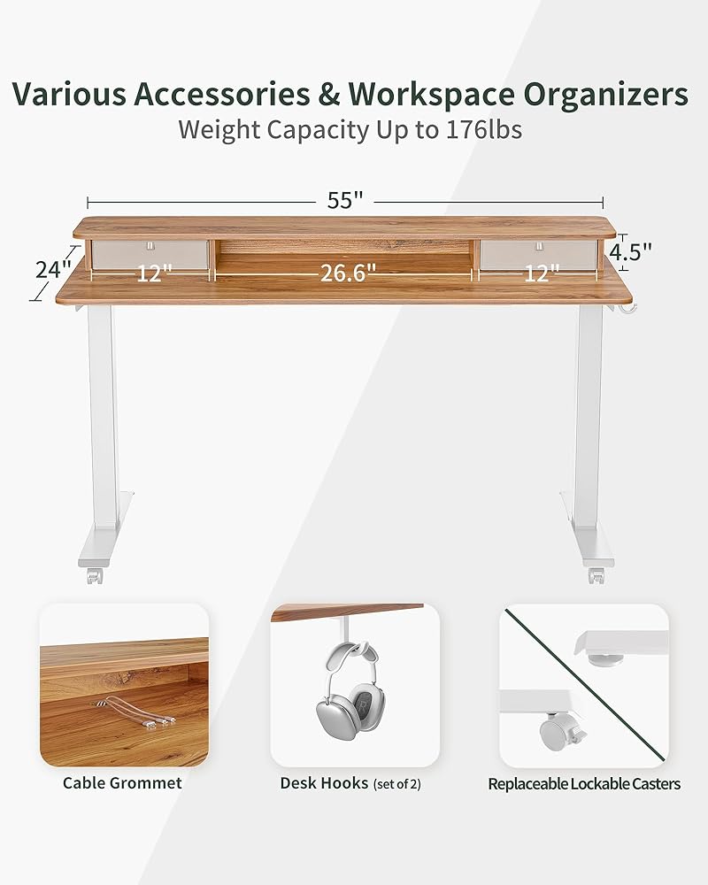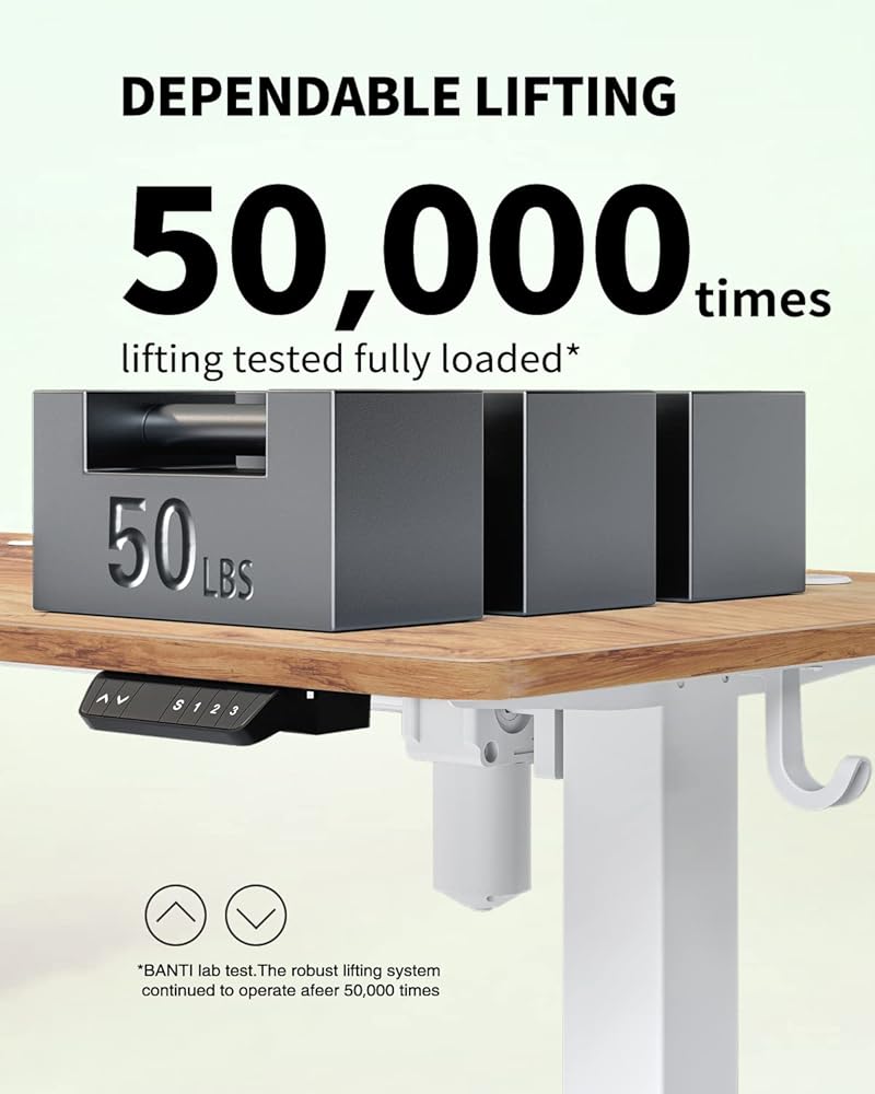 Sturdy Desk Frame: The desk frame is made of industrial-grade steel and can safely hold up to 176 lbs. Desktop lifting speed: 20mm/s, no-load noise ≤ 55db.