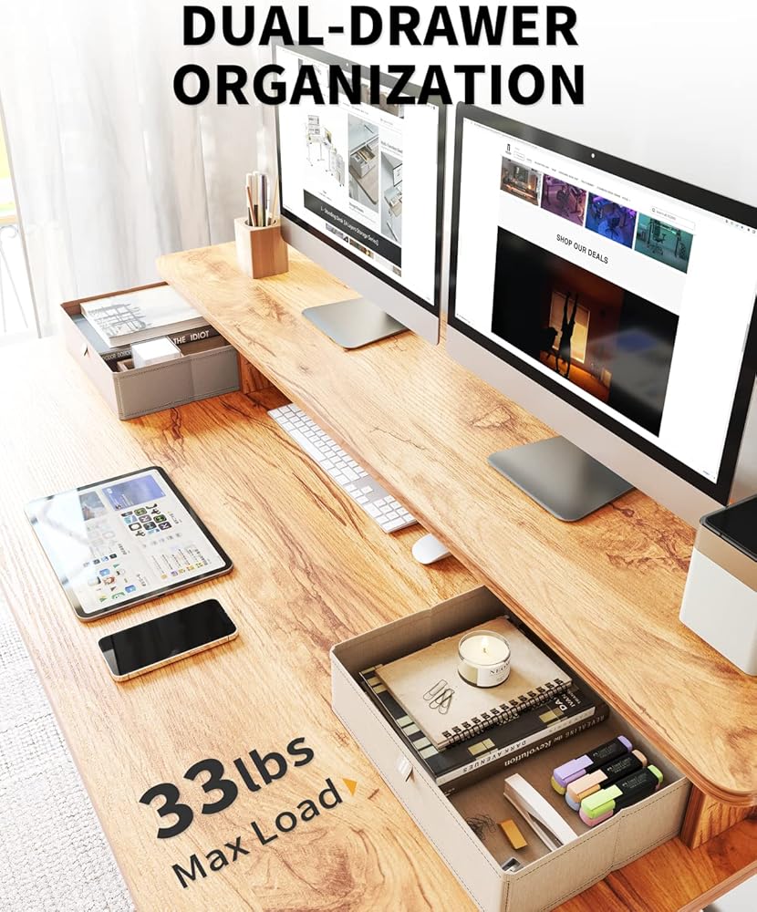 2 Large Capacity Drawers: The top shelf features a double drawer design that cleverly keeps the desktop tidy. These drawers do not need to be assembled, simply unfold and line the bottom with cardboard.