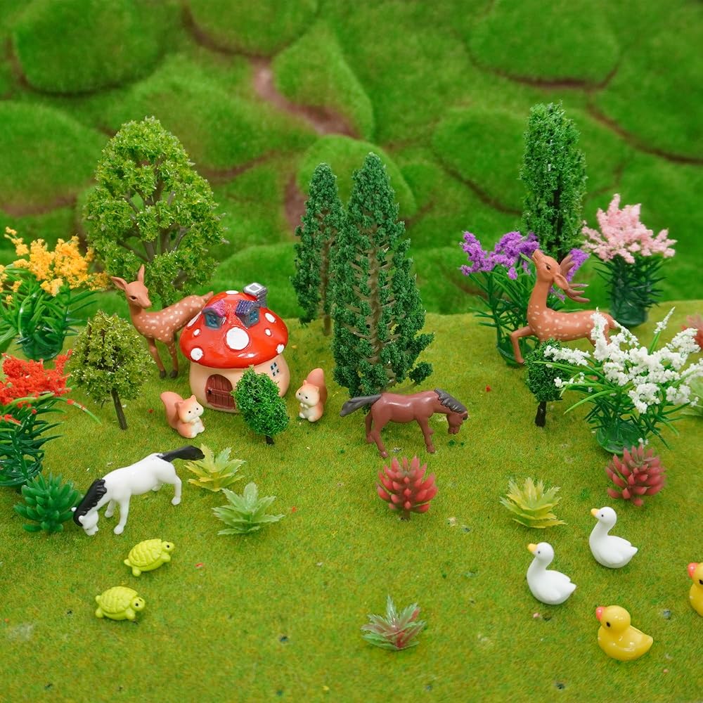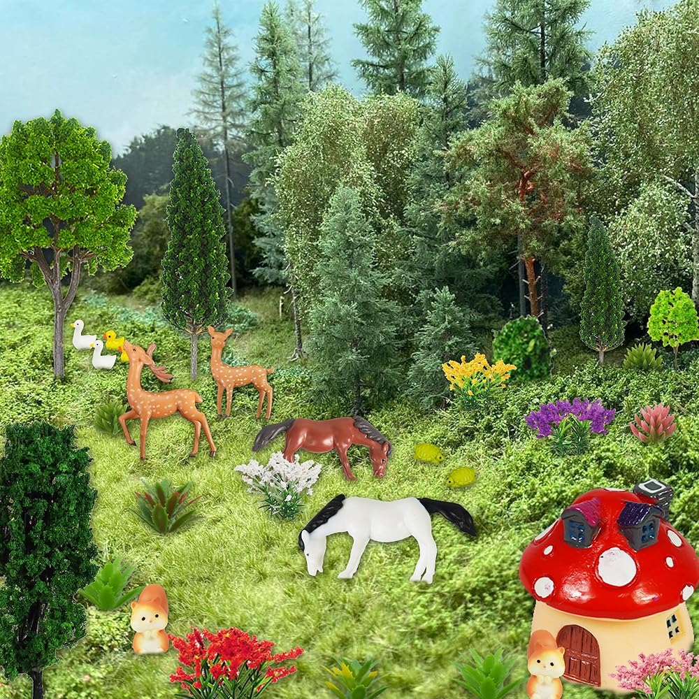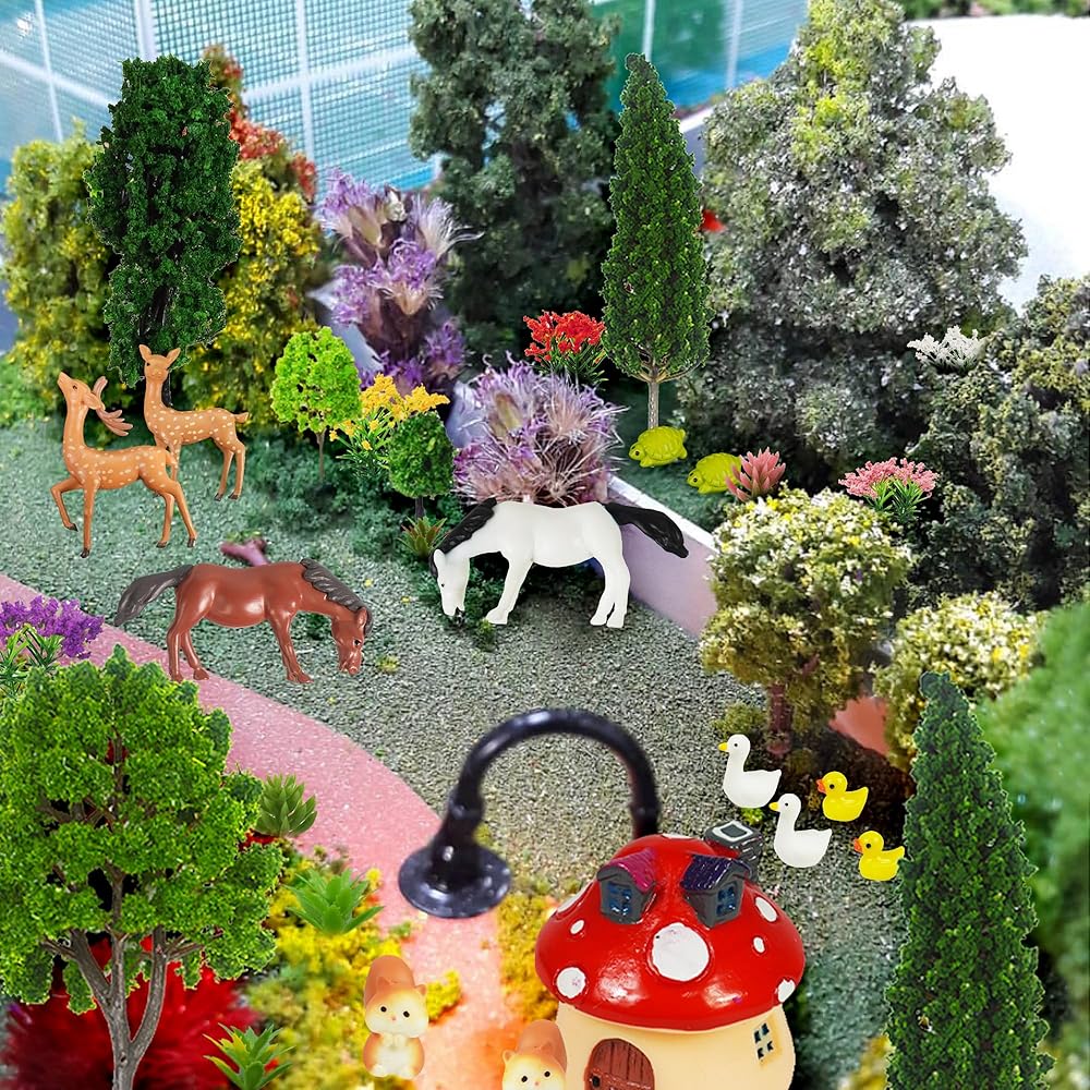 【Material】These model trees and flowers are made of plastic material, well workmanship, flexible for using. The mushroom house and animals are made of resin.