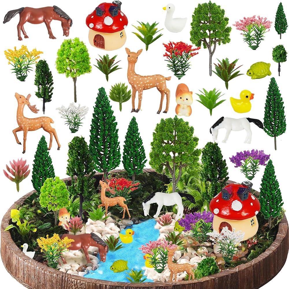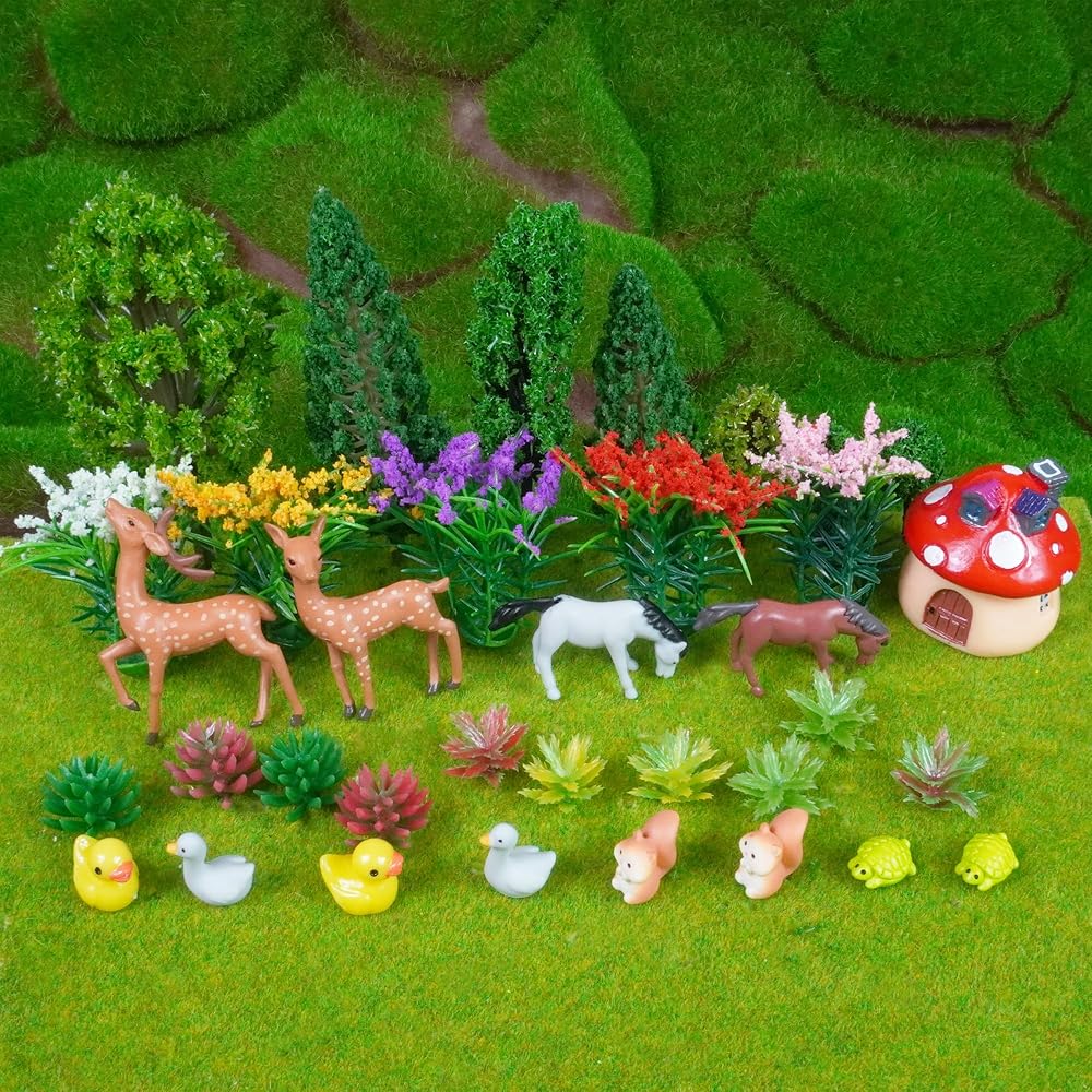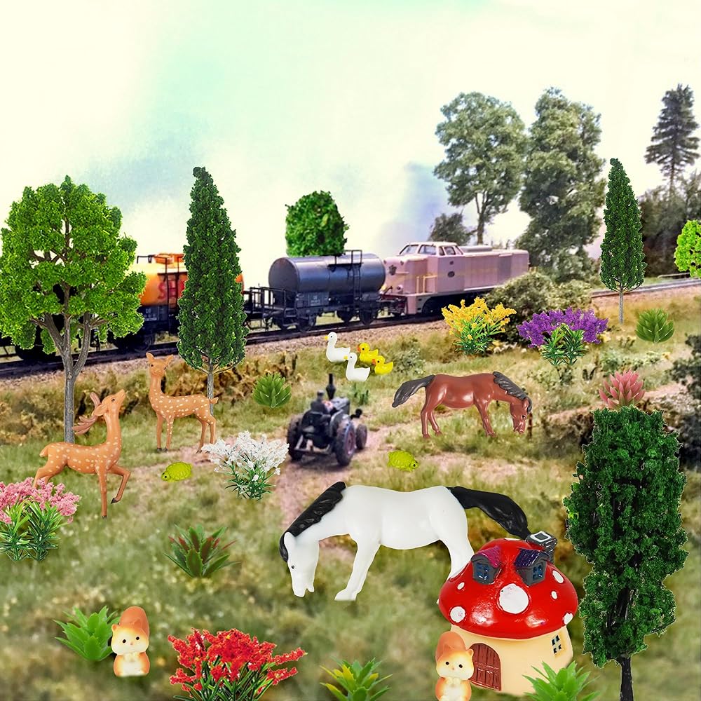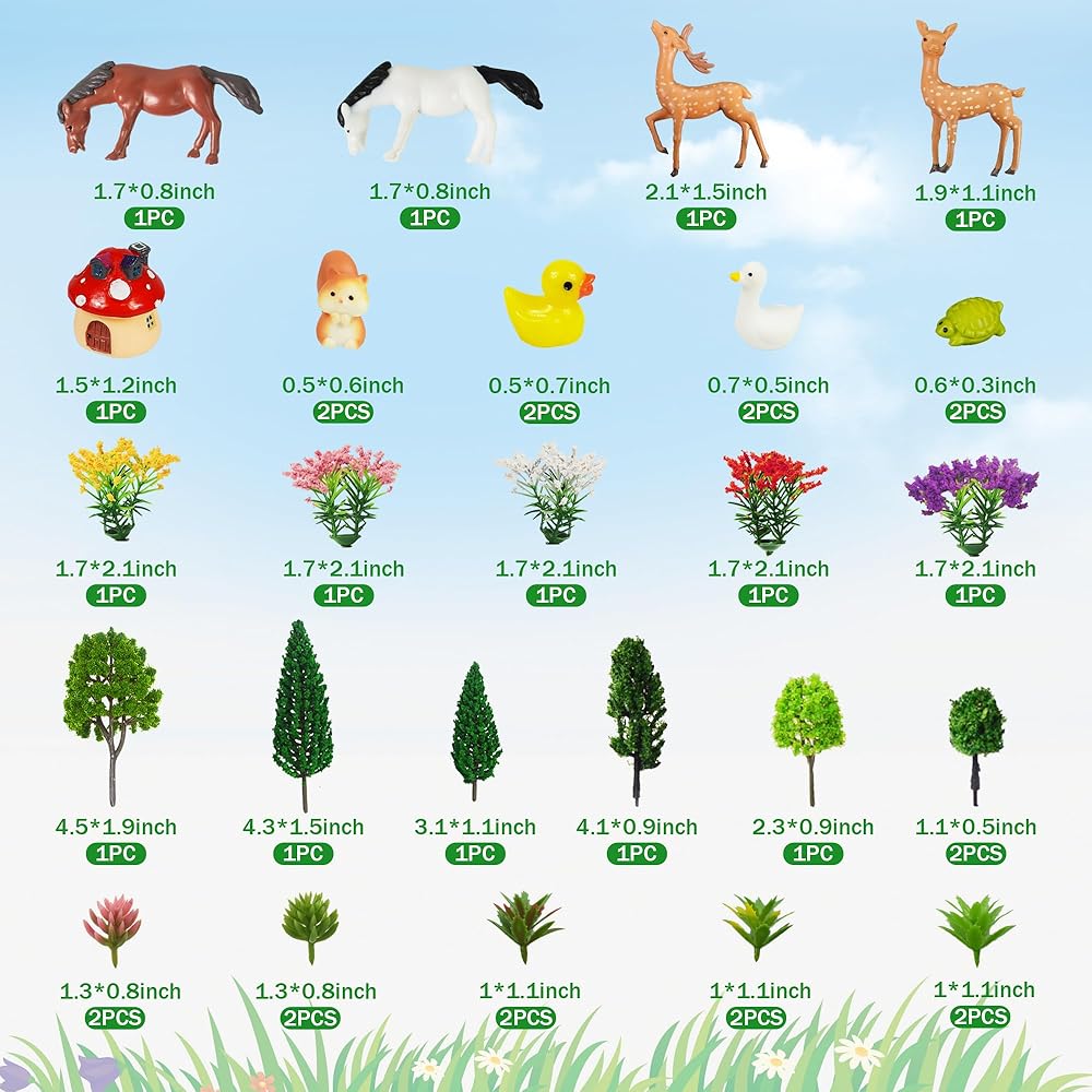 【Material】These model trees and flowers are made of plastic material, well workmanship, flexible for using. The mushroom house and animals are made of resin.