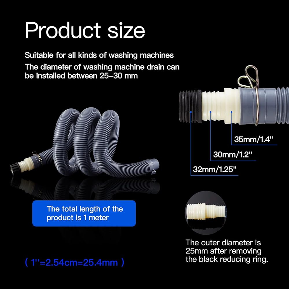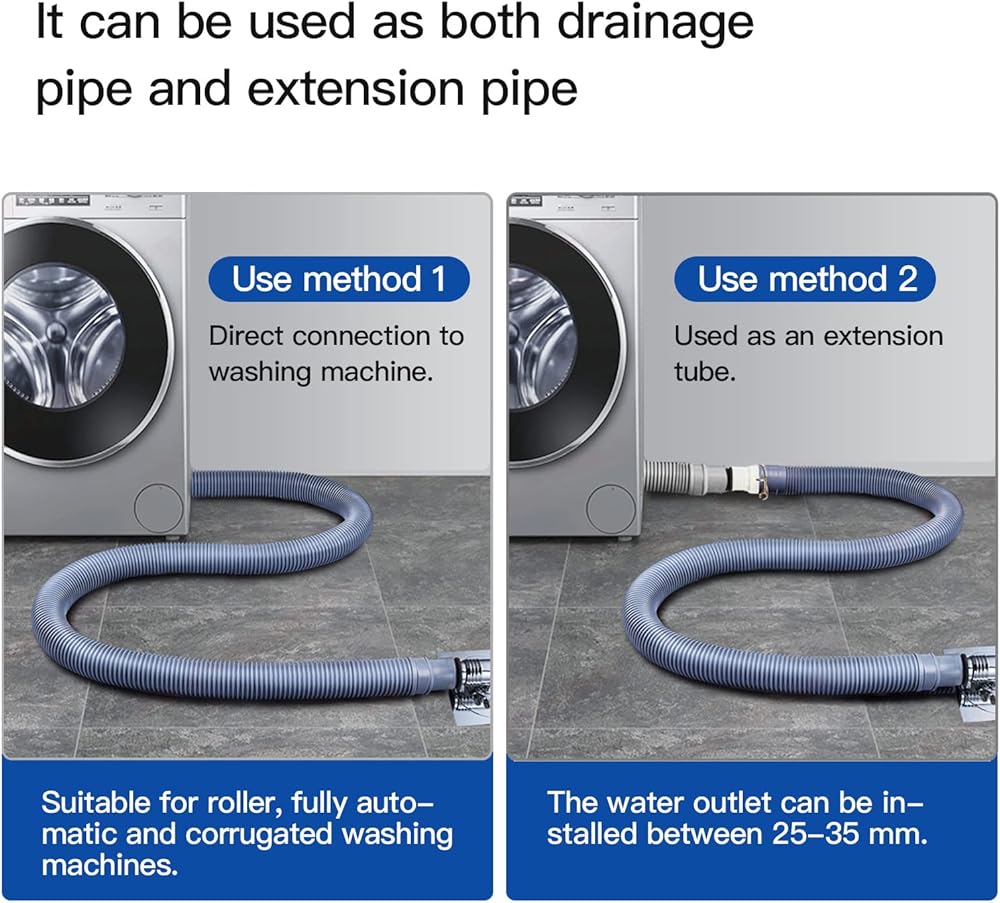 يتميز أنبوب الصرف الخاص بهذه الغسالة بتوافق قوي، وهو مناسب للعديد من الغسالات ذات الأسطوانة. تم تجهيز الواجهة بمحولات مناسبة لثلاثة أحجام من مصارف الغسالة. يبلغ طوله 39 بوصة (100 سم) ومجهز بمشابك لتثبيت الواجهة.