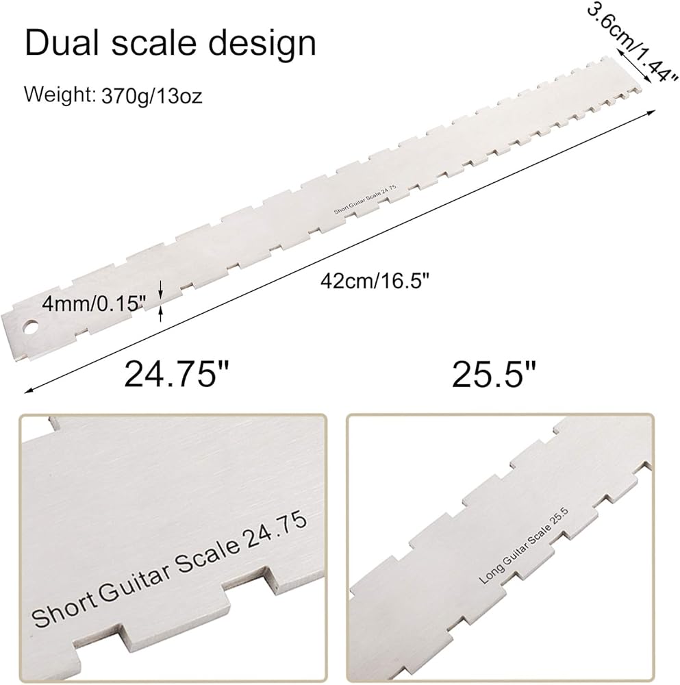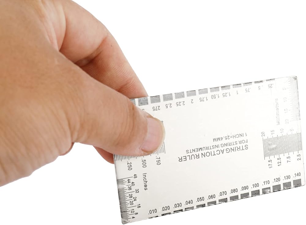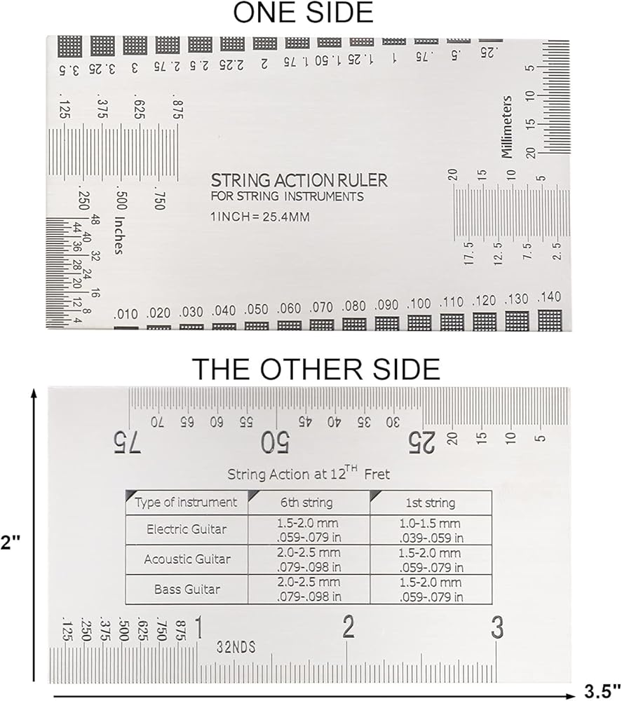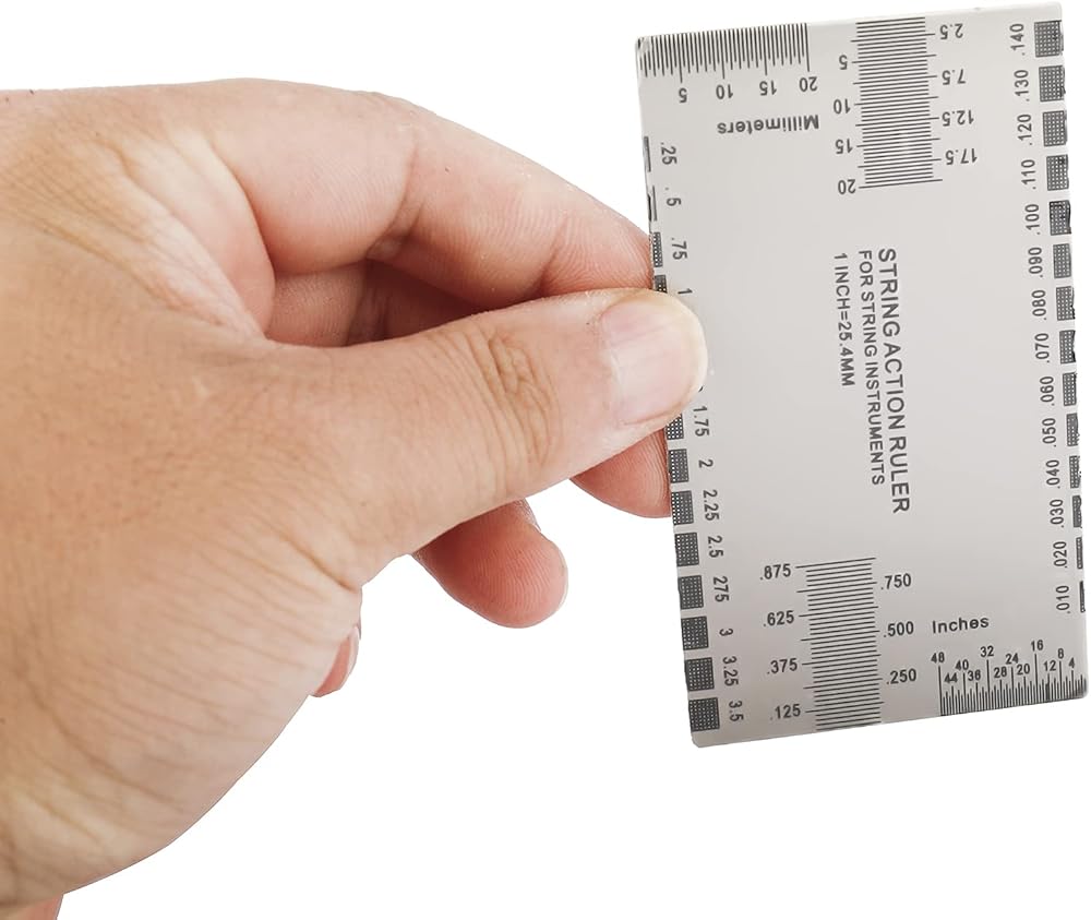 • مقاس 8.9*5.1 سم، متري وإمبراطوري، طباعة محفورة على الجانبين، لن تبهت، دقيقة وواضحة لقياس ارتفاع الخيط، ارتفاع الجسر، عمق فتحة الجوز، عمق فتحة الجسر وارتفاع الالتقاط