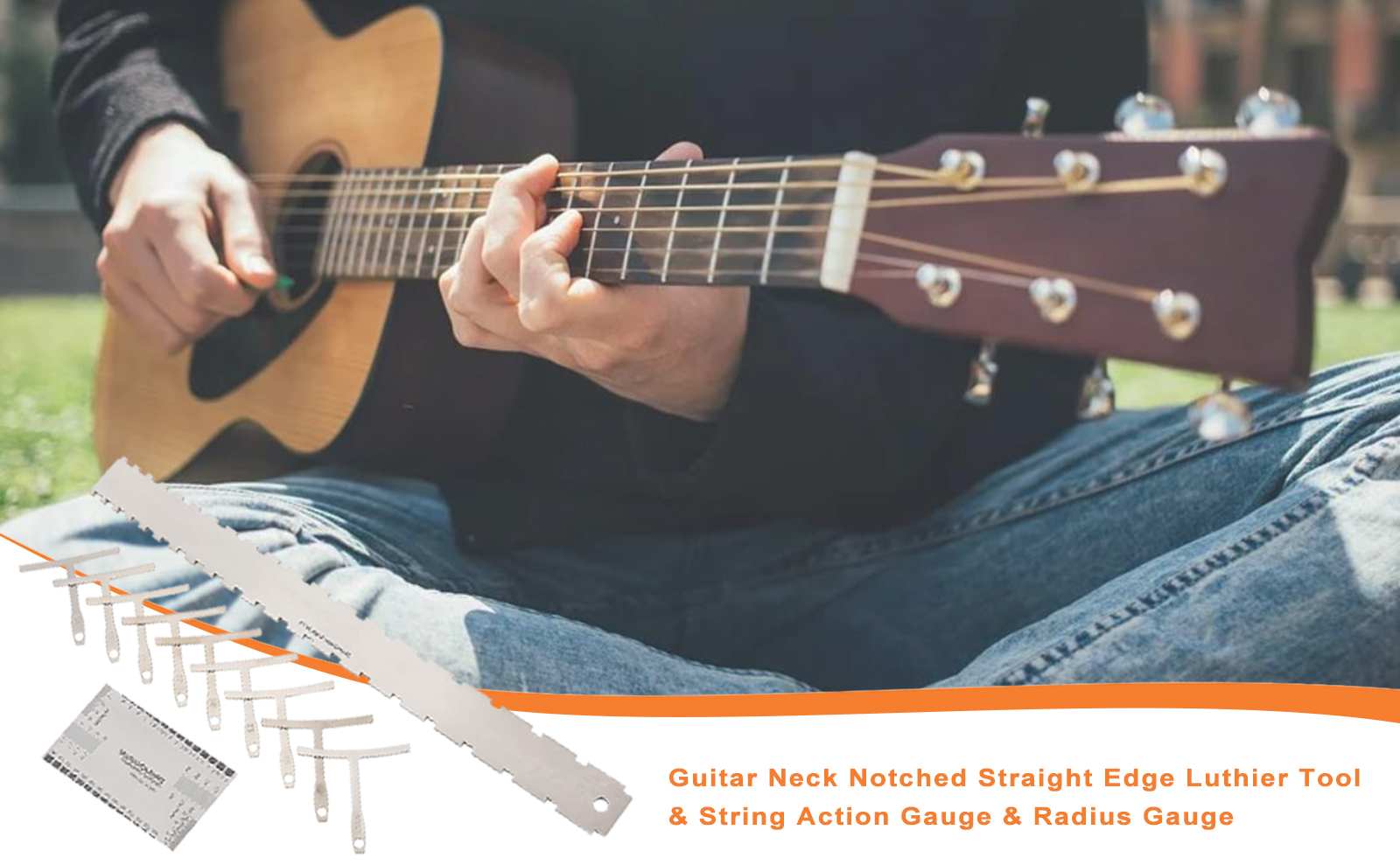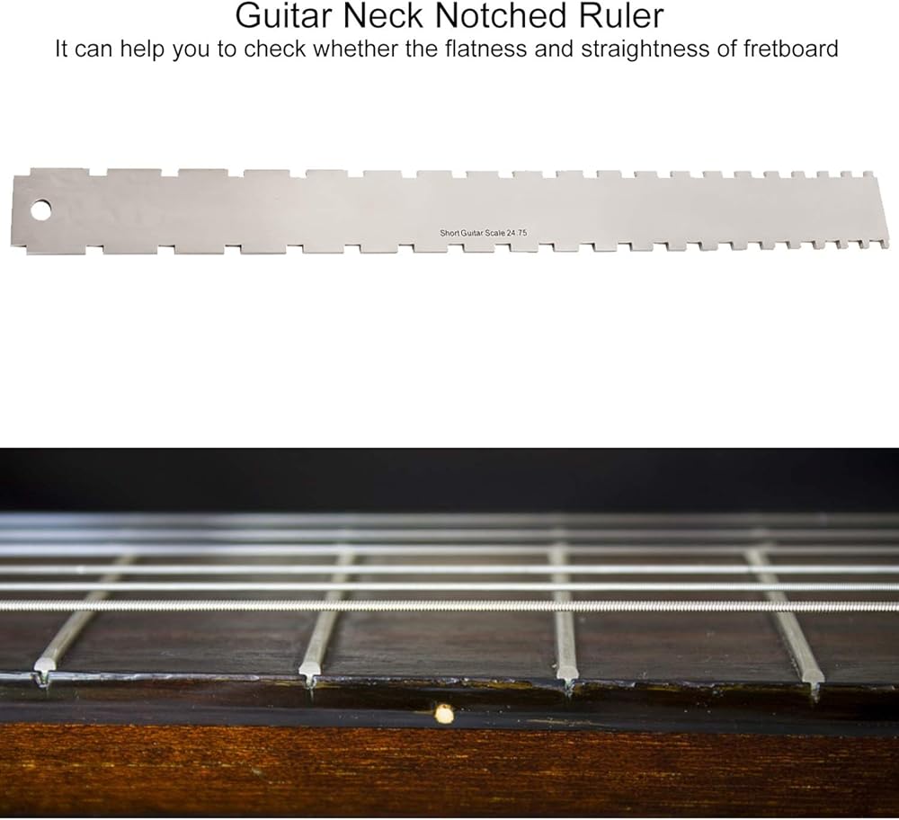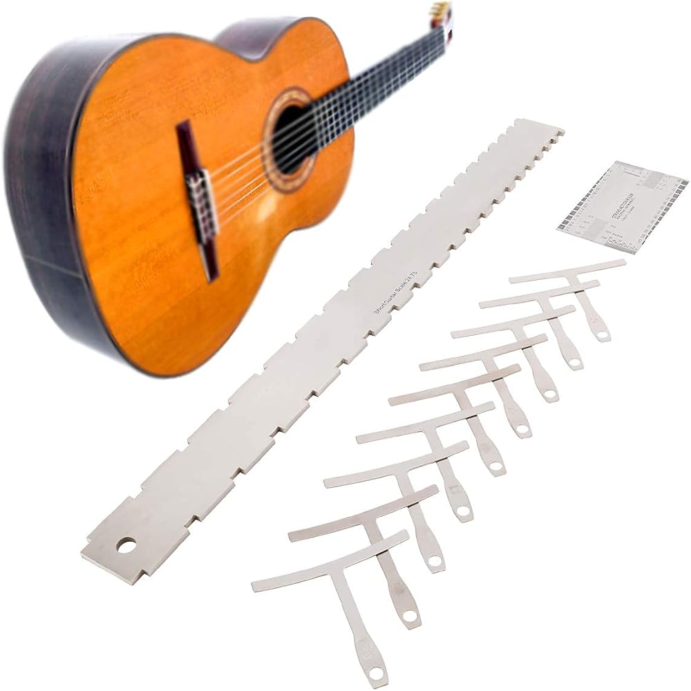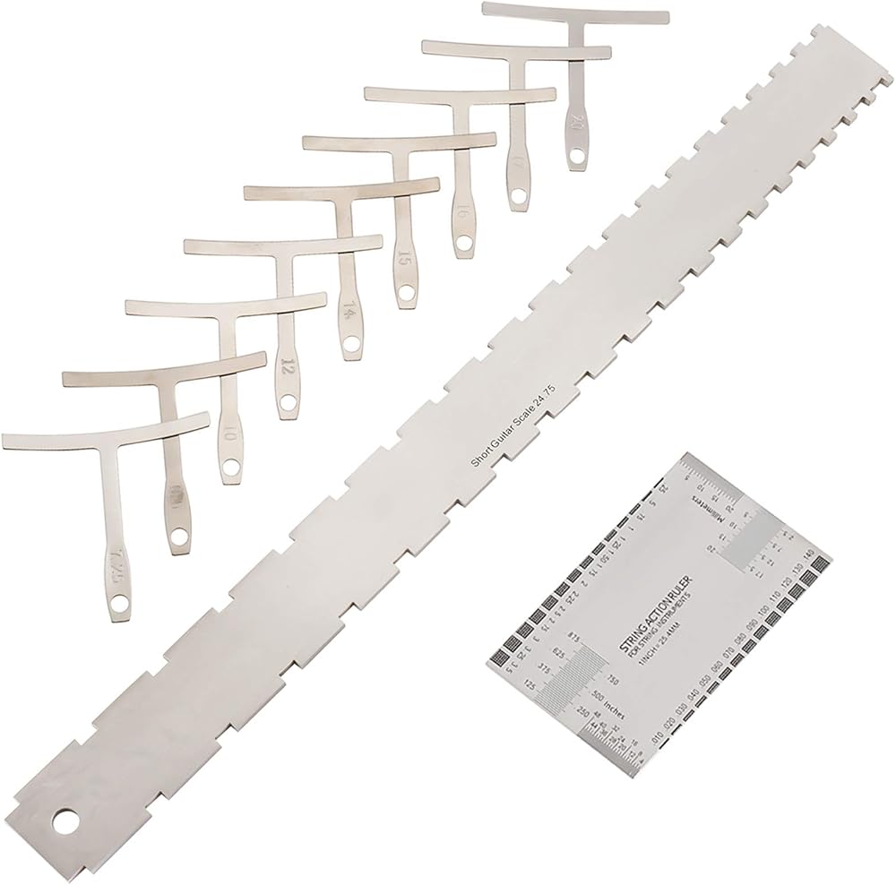 • مقاس 8.9*5.1 سم، متري وإمبراطوري، طباعة محفورة على الجانبين، لن تبهت، دقيقة وواضحة لقياس ارتفاع الخيط، ارتفاع الجسر، عمق فتحة الجوز، عمق فتحة الجسر وارتفاع الالتقاط