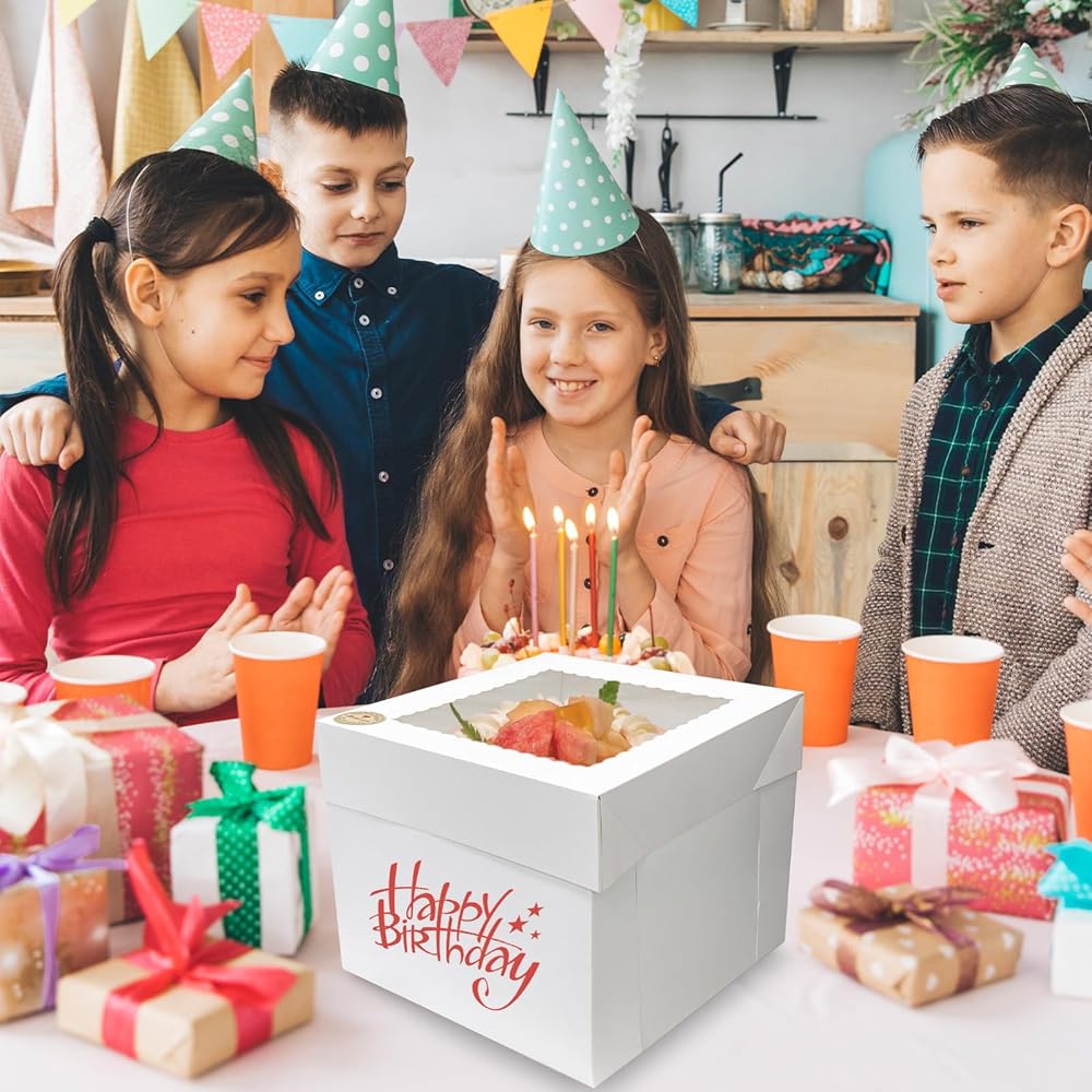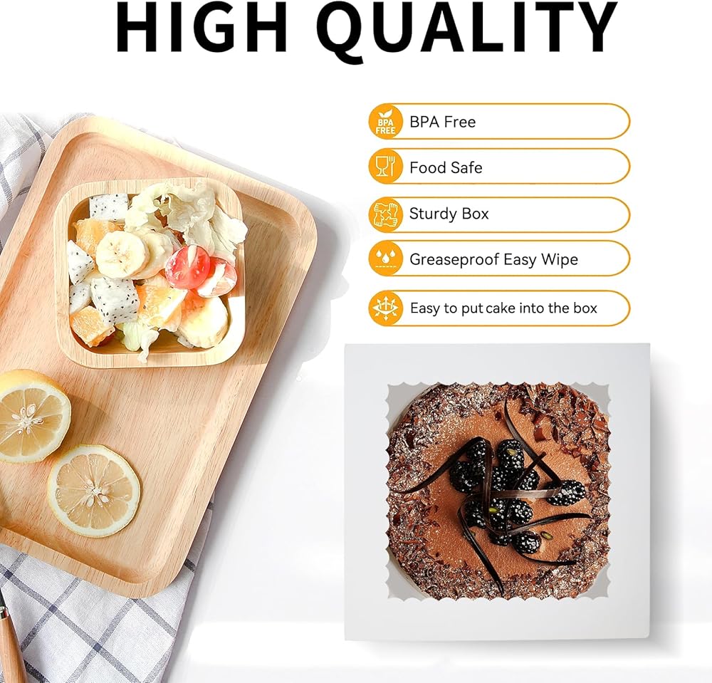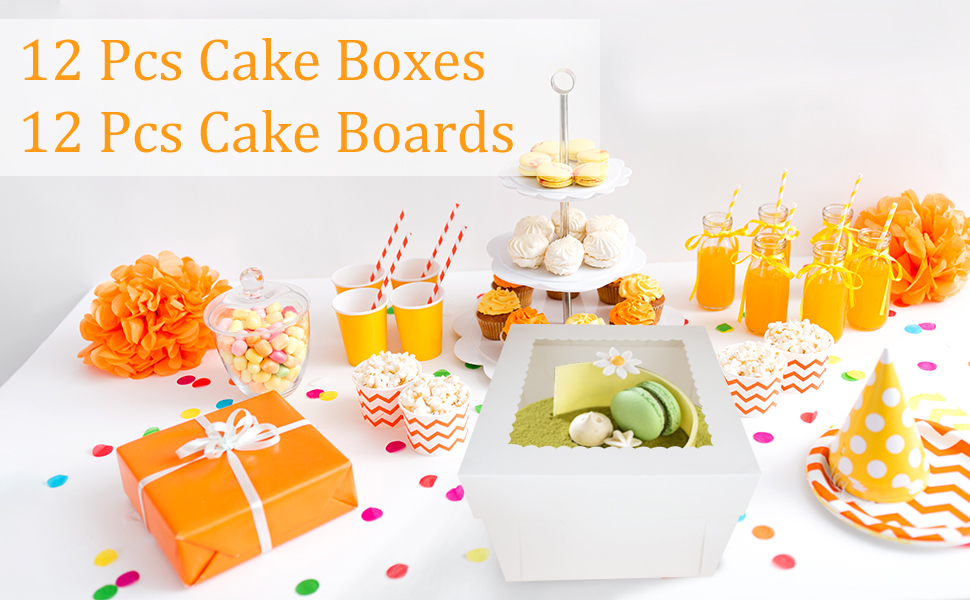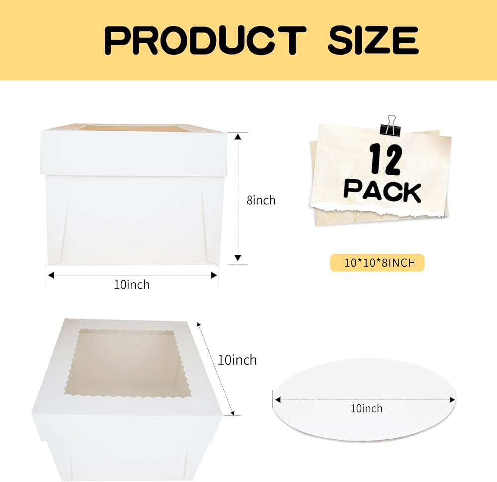 مجموعة علب الكيك: تتضمن 12 علبة كيك (10 × 10 × 8 بوصة) و12 لوح كيك و24 قطعة من الملصقات الجميلة. مصممة للكعكات التي يبلغ حجمها 8 بوصات، فهي تنزلق بسهولة من الأمام، مما يسهل عملية تجميع الصندوق.