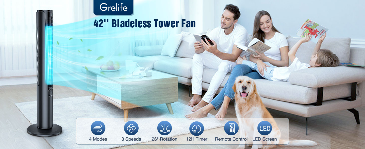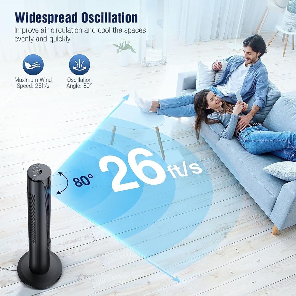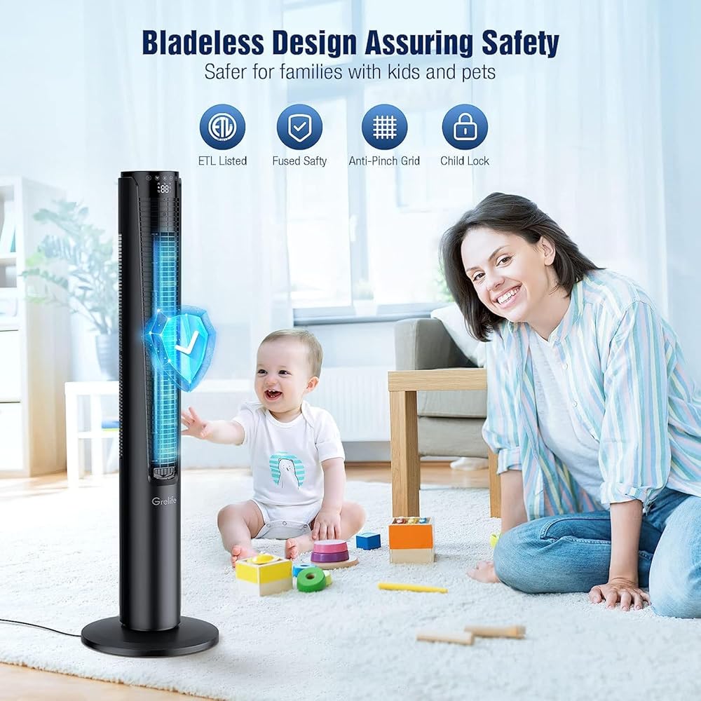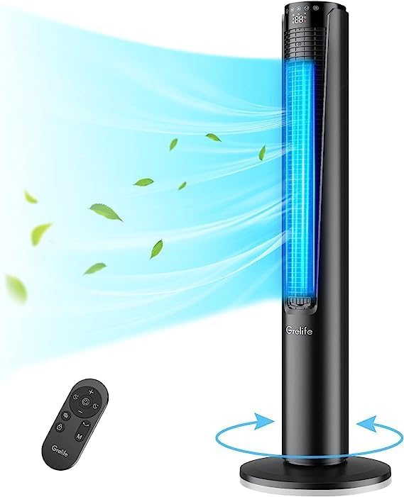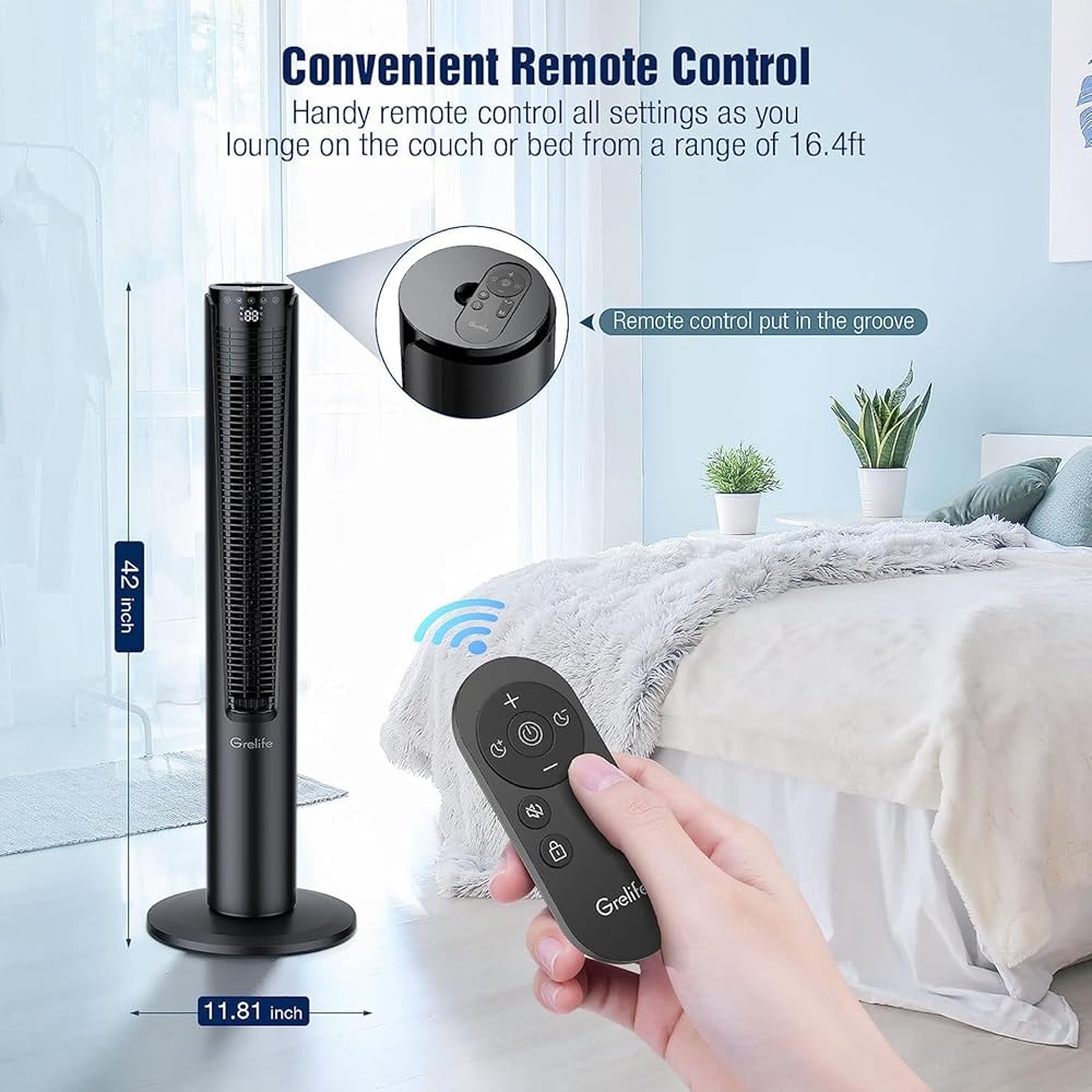 مروحة برج Grelife مقاس 42 بوصة لغرفة النوم، مروحة بدون شفرات متأرجحة بزاوية 80 درجة مع جهاز تحكم عن بعد، مروحة أرضية هادئة، 3 سرعات، 4 أوضاع، شاشة LED، مؤقت 12 ساعة، مروحة قائمة للمكتب المنزلي الداخلي