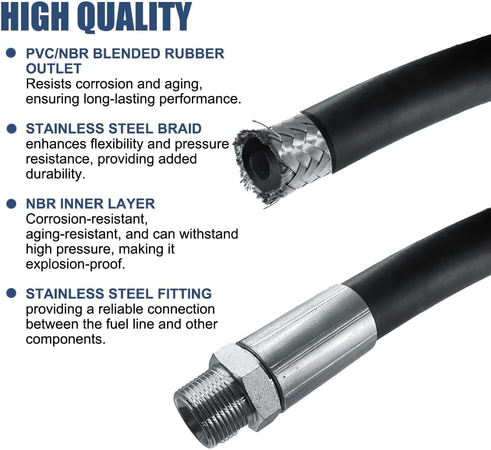 ✅متانة عالية - مع ضغط عمل يبلغ 1.6 ميجا باسكال/232 رطل لكل بوصة مربعة وضغط انفجار يبلغ 4.8 ميجا باسكال/696 رطل لكل بوصة مربعة، يمكن لخرطوم الوقود الذي ينقل 3/4 أن يتحمل الظروف الصعبة، مما يضمن أداء طويل الأمد.