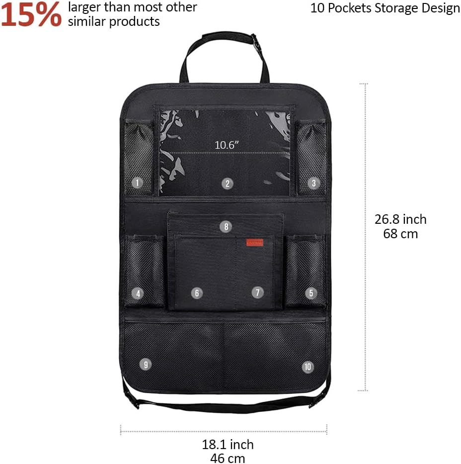 الكثير من الجيوب: يأتي منظم السيارة بالمقعد الخلفي Luckybay مع 10 مساحات تخزين مختلفة الحجم بما في ذلك حامل الكمبيوتر اللوحي الشفاف وجيوب للزجاجات وجيوب شبكية كبيرة للضروريات الأخرى.