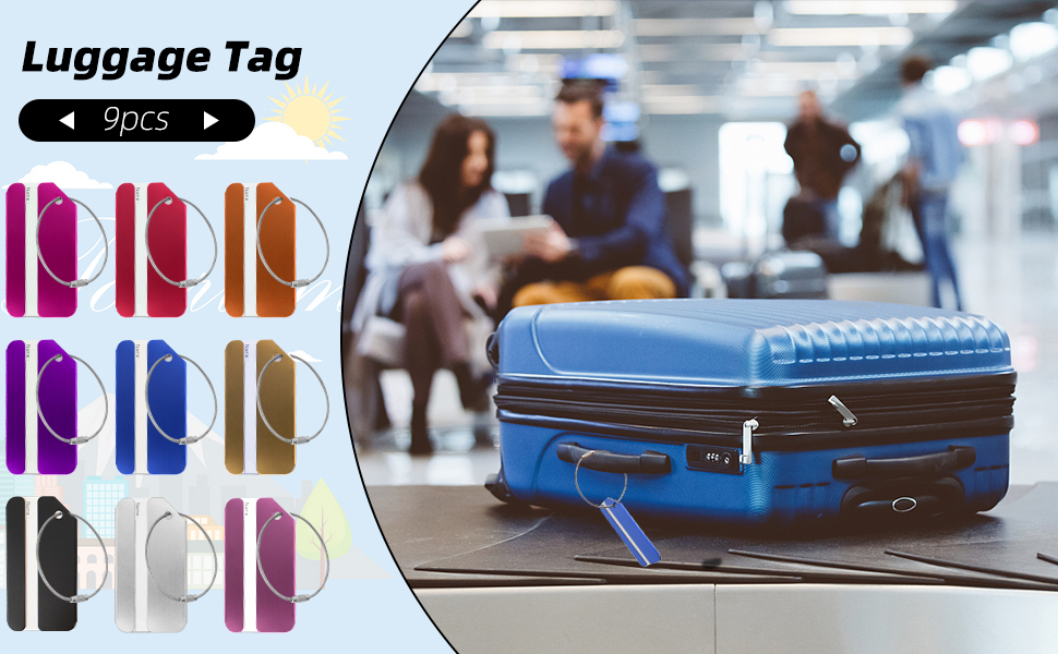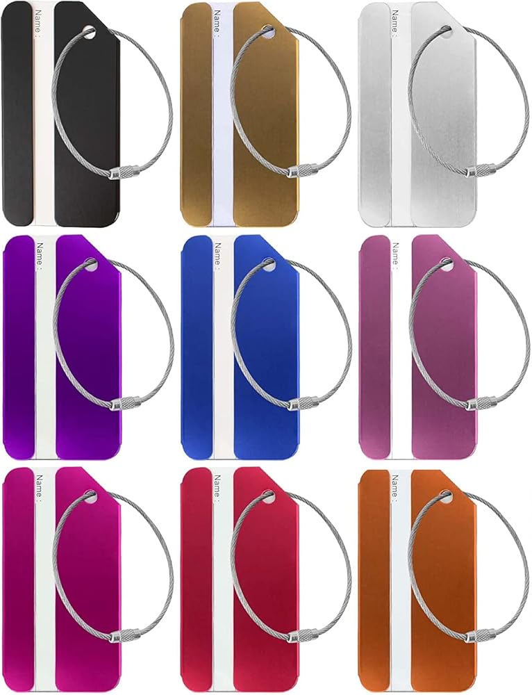 【يمكنك الحصول على: 9 قطع من بطاقات الأمتعة المصنوعة من سبائك الألومنيوم بألوان مختلفة. اللون أزرق، أسود، أحمر، بيربل، وردي، قهوة، ذهبي، وردي، فضي.