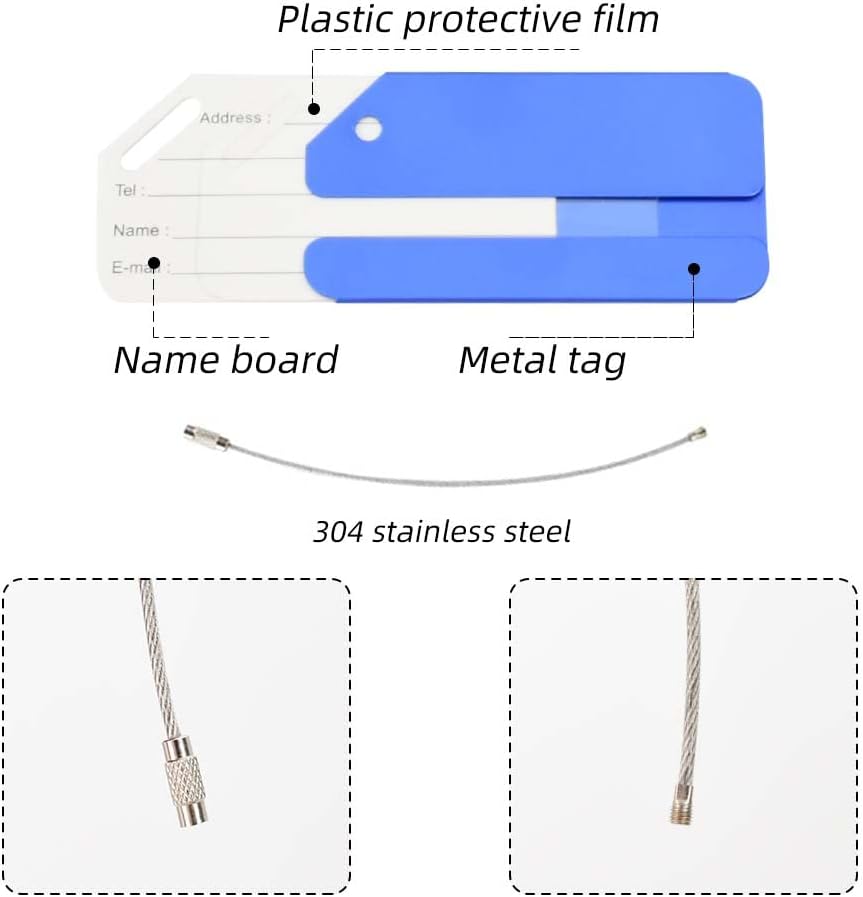 【الخامة: بطاقة الأمتعة المعدنية مصنوعة من سبائك الألومنيوم، ومتينة، وخفيفة الوزن، وألوان زاهية. إنها مجهزة بحلقة من الفولاذ المقاوم للصدأ ليس من السهل كسرها ومريحة للتثبيت على الأمتعة.