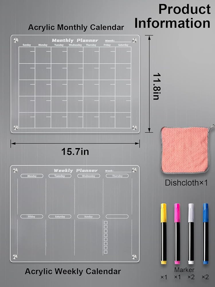 Our product contains 1 acrylic monthly calendar, 1 acrylic weekly calendar, 6 markers, and a wipe.