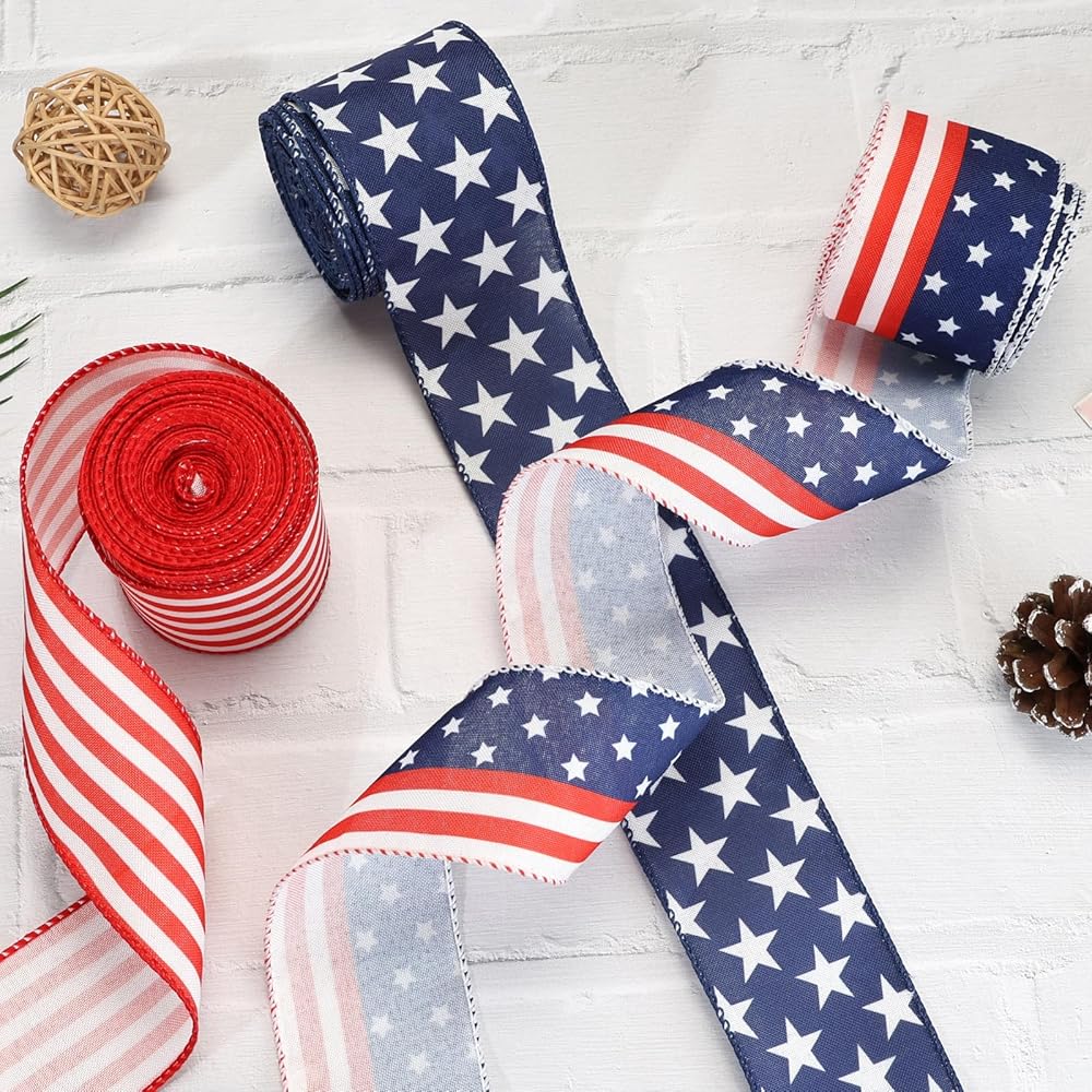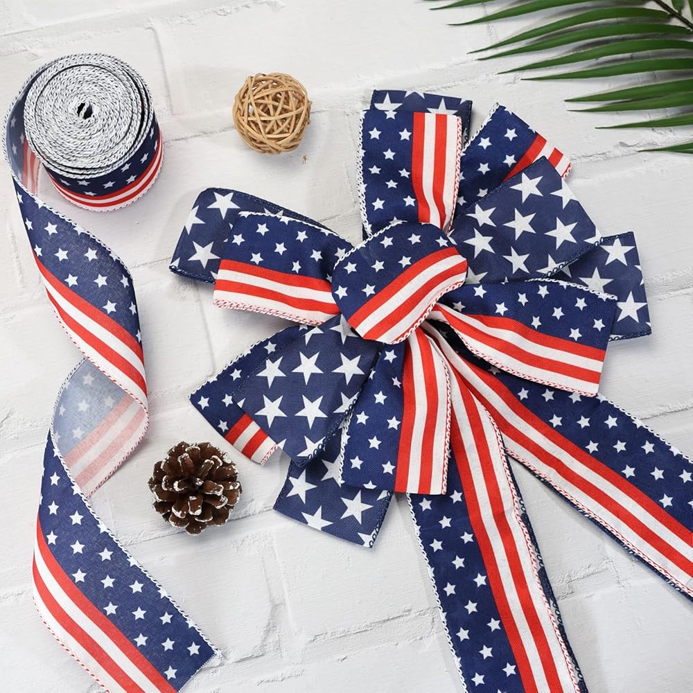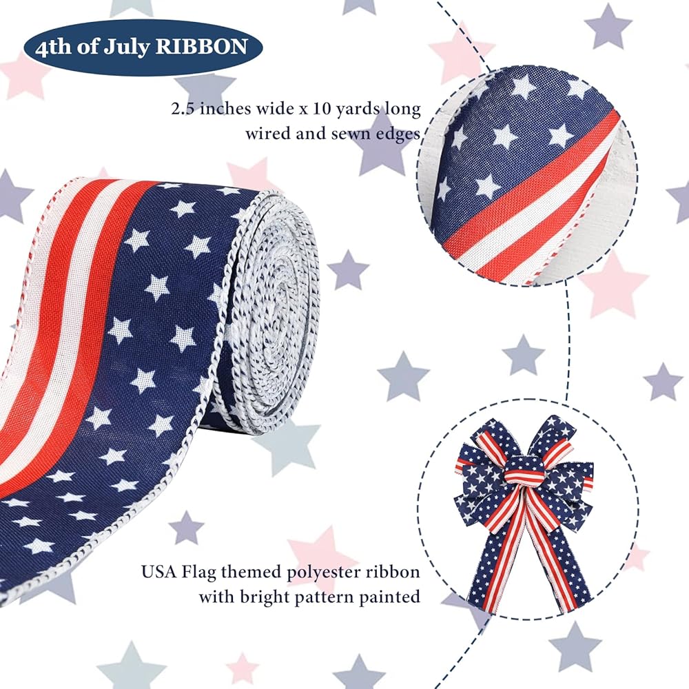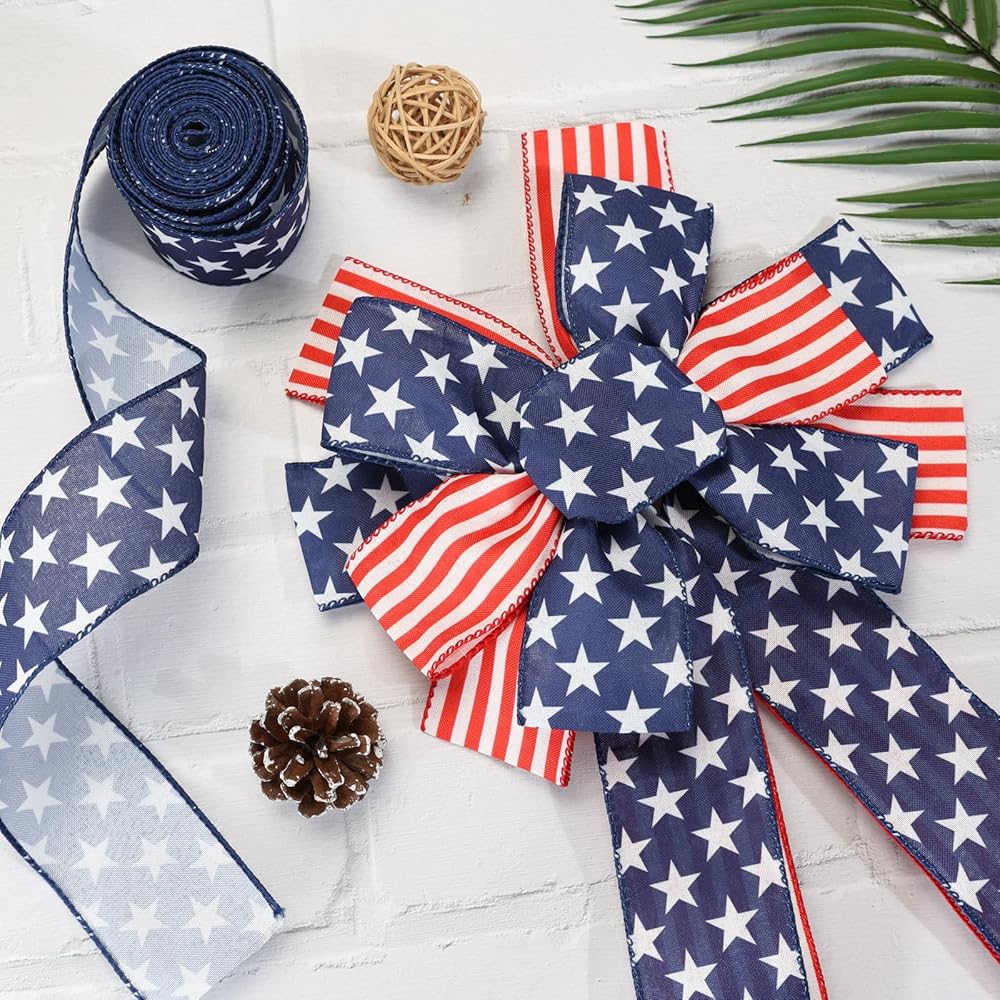 ❤️🤍💙Memorial Day Ribbon❤️🤍💙 This classic Decorative Ribbon is patterned with white star on a blue background. Wired edges festive ribbons with blue stitching, are dainty decorations to Independence Day Party or surprise gifts you prepared for your beloved ones.