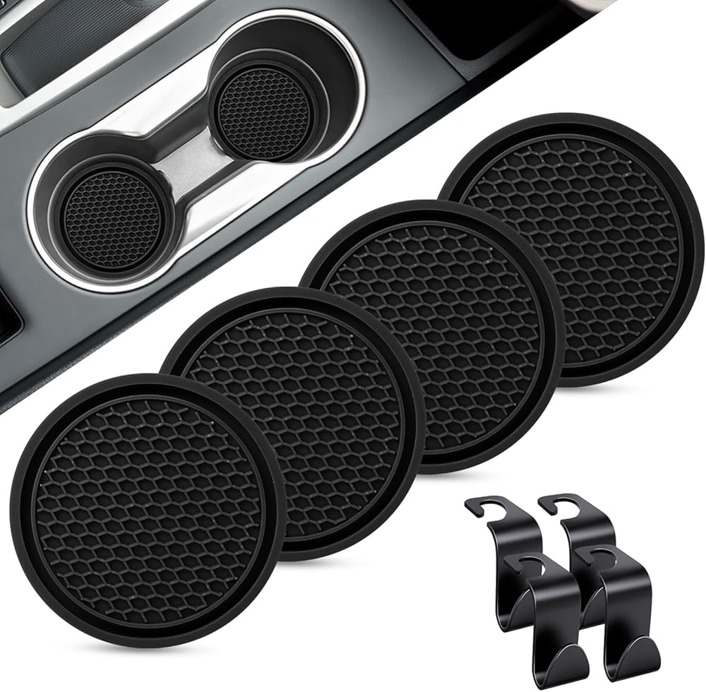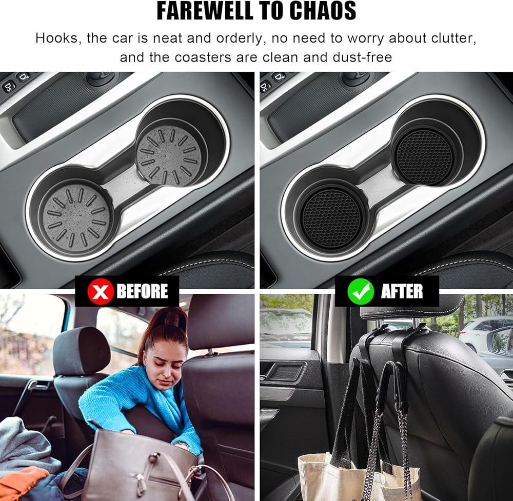 • Essential Car Interior Accessories--The package includes 4 pack of car cup holder coaster and 4 pack of hook for car.Our product are suitable for hanging purses and bags, converting the back of car seat into a convenient storage space.4 pack of car cup coaster are personalized design, stylish and versatile.