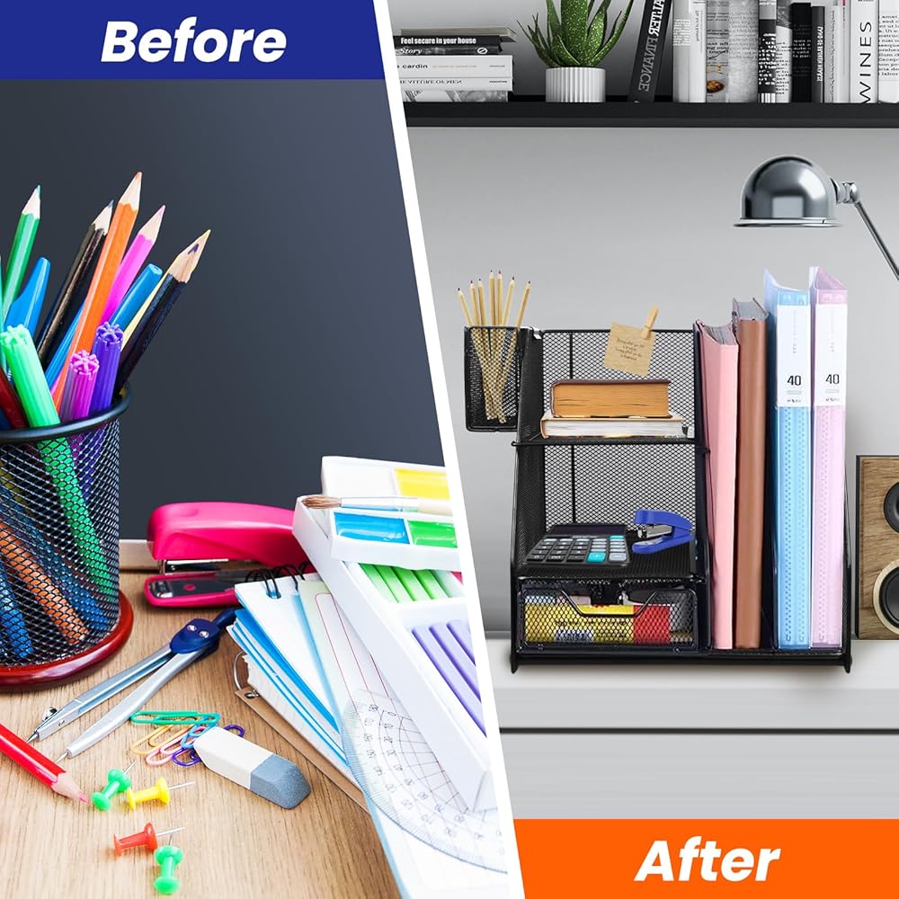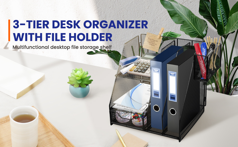 【وفر مساحة على سطح المكتب الخاص بك】يعد منظم المكتب ومساحة التخزين المكونة من 3 طبقات مثاليين لمكتبك. تتميز بأرفف للمجلات ومنظمات للأدراج وحاملات أقلام معلقة لزيادة مساحة التخزين المكتبية والمساحة القابلة للاستخدام.