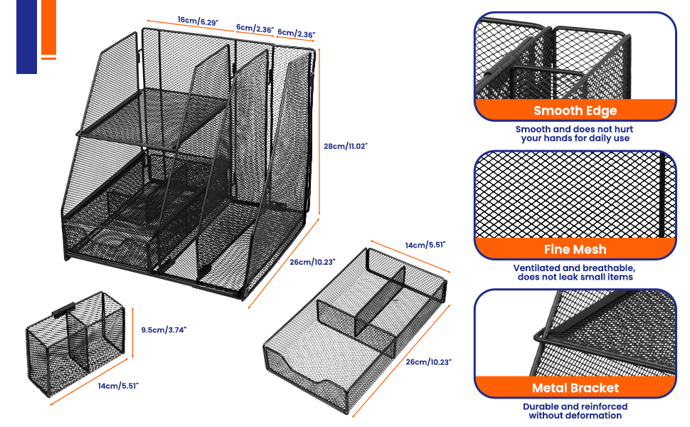 【مادة معدنية عالية الجودة】منظم مكتب اللوازم المكتبية مصنوع من شبكة معدنية خفيفة الوزن ومتينة. الهيكل مستقر، وليس من السهل تشويهه أو اهتزازه، وله قوة طويلة الأمد وأداء موثوق.