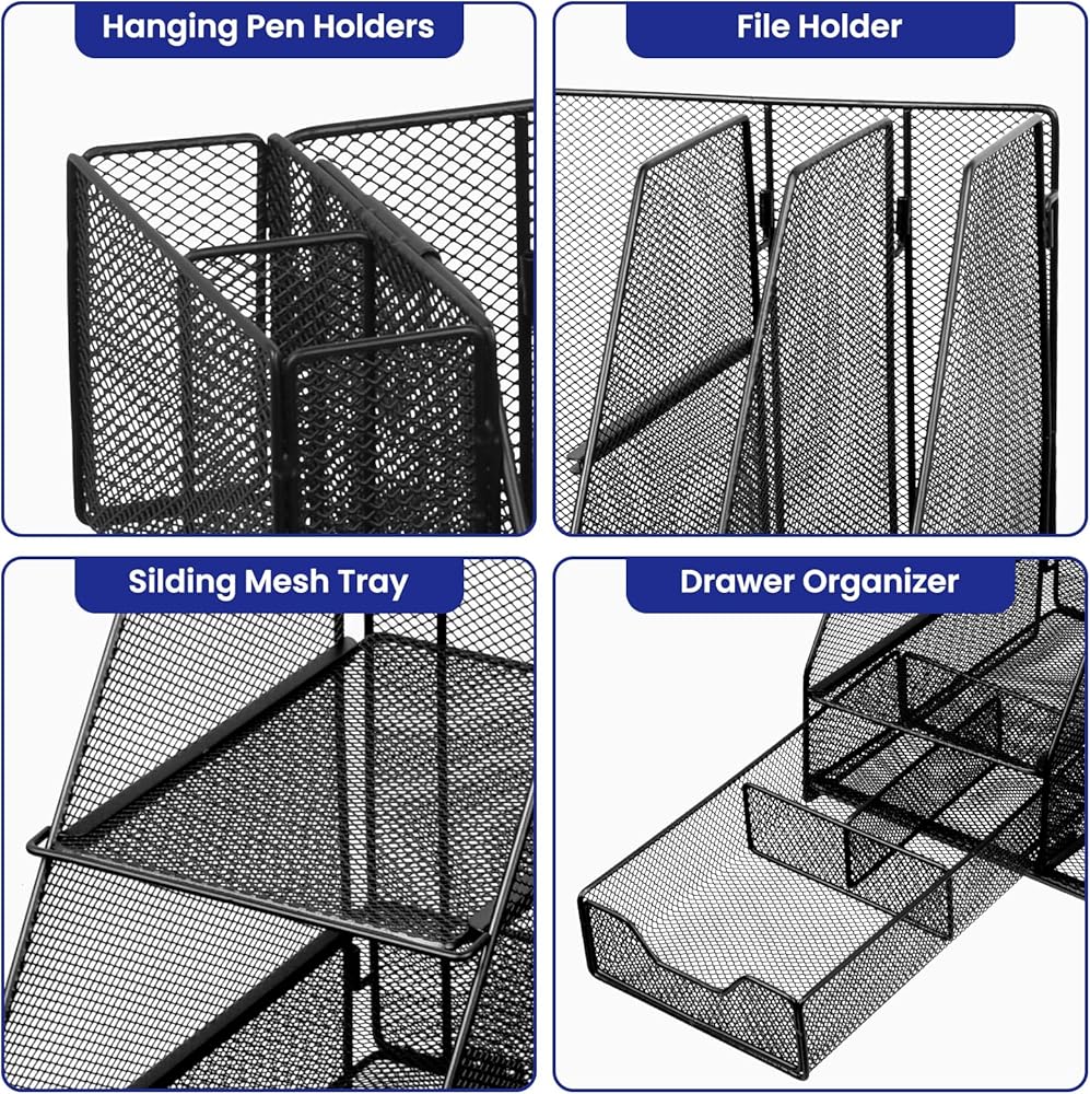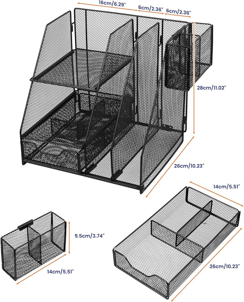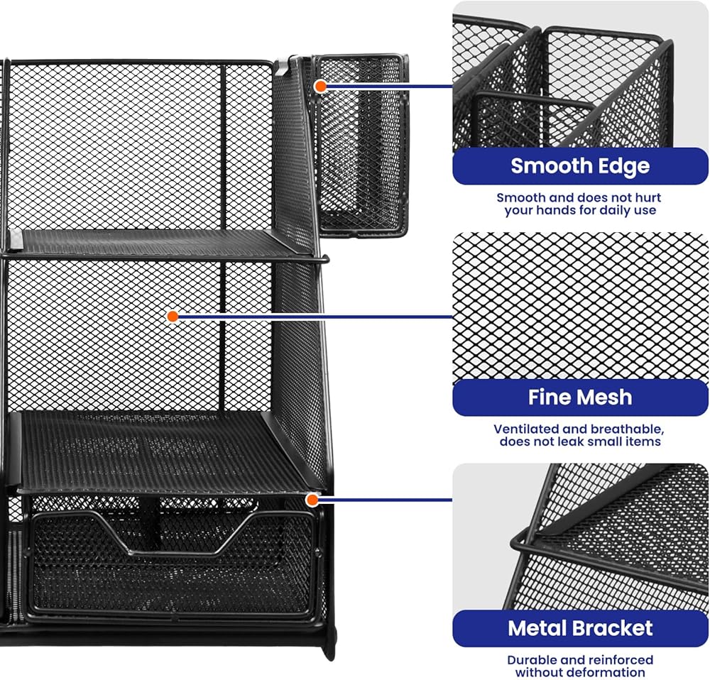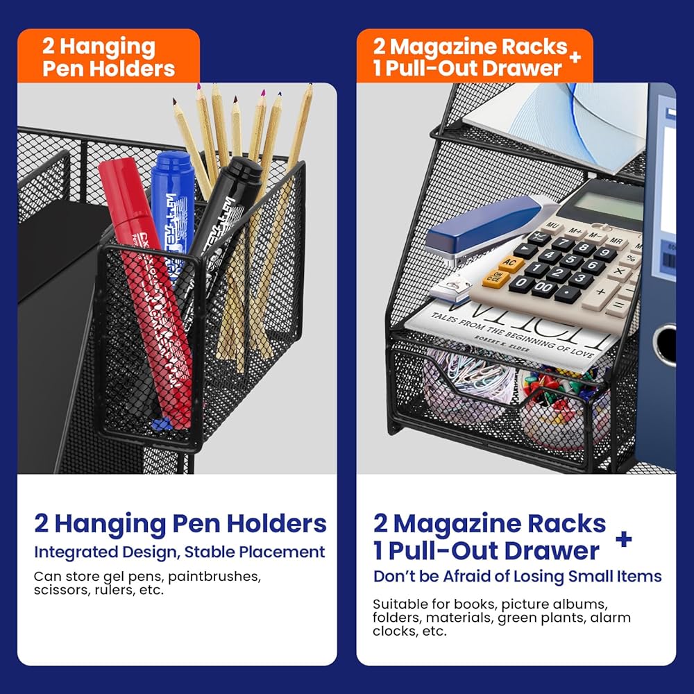 【منظم مكتبي】يحتوي رف الملفات الشبكي الخاص بنا على 2 صينية منزلقة + 2 رفوف للمجلات + 2 حامل أقلام معلق + 1 درج قابل للسحب. تصميم تخزين مكتبي متوافق مع البشر، ملخص وتصنيف مثالي لجميع المعدات المكتبية، مما يخلق أفضل بيئة لعملك أو دراستك.