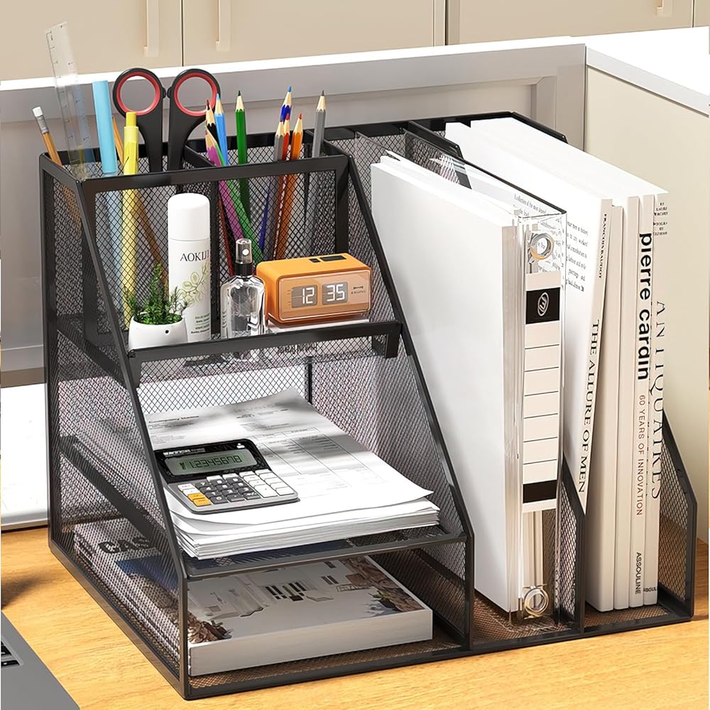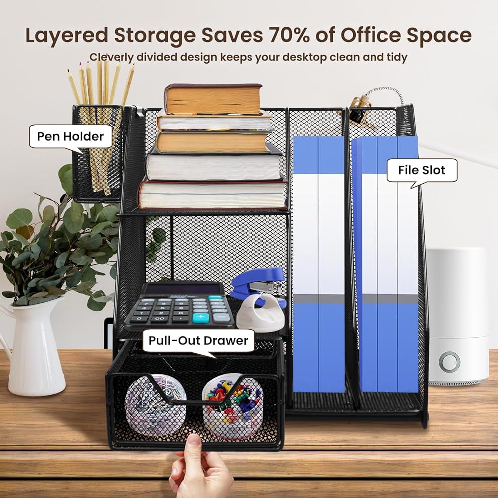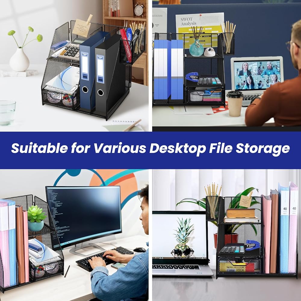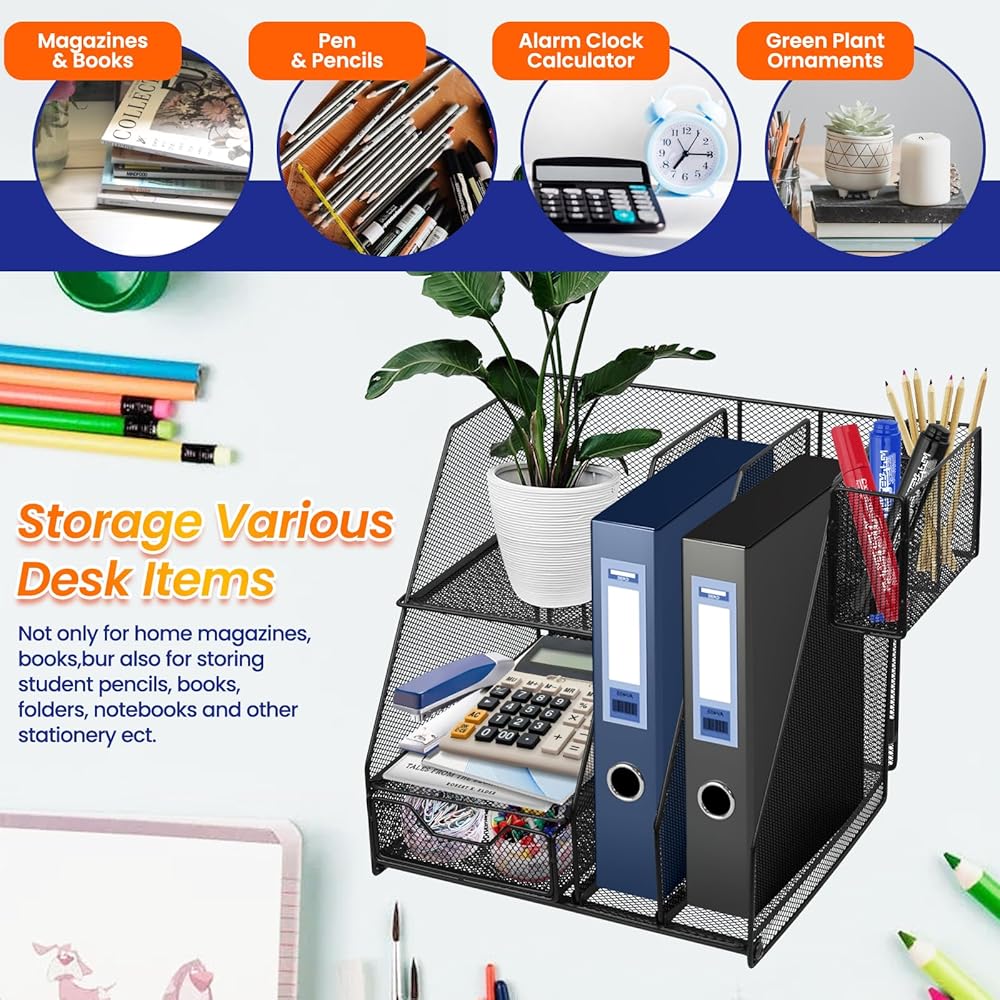 【منظم مكتبي】يحتوي رف الملفات الشبكي الخاص بنا على 2 صينية منزلقة + 2 رفوف للمجلات + 2 حامل أقلام معلق + 1 درج قابل للسحب. تصميم تخزين مكتبي متوافق مع البشر، ملخص وتصنيف مثالي لجميع المعدات المكتبية، مما يخلق أفضل بيئة لعملك أو دراستك.