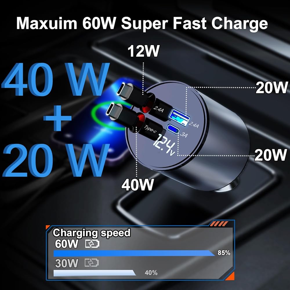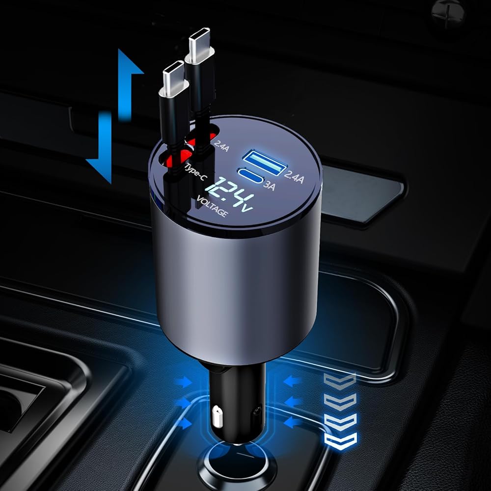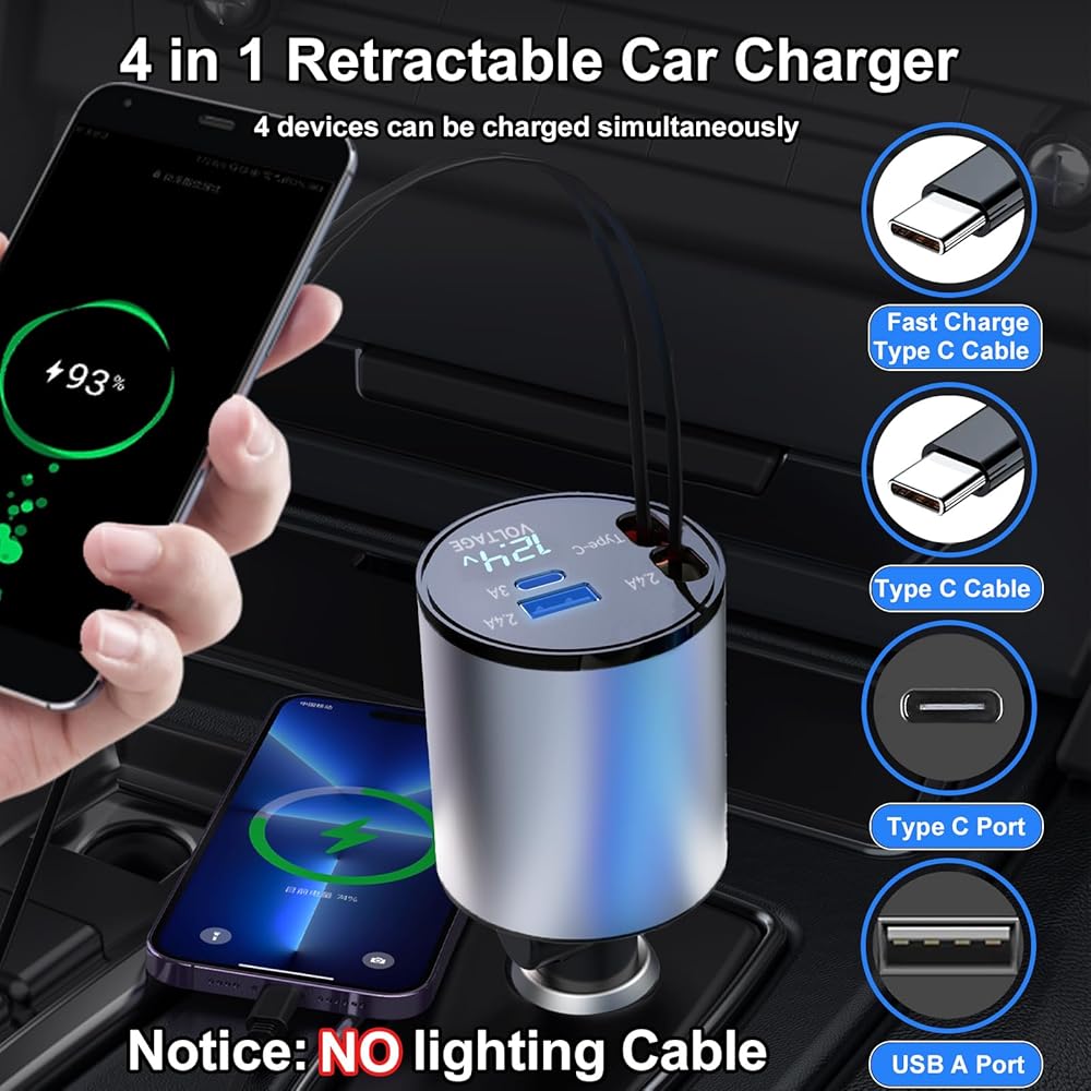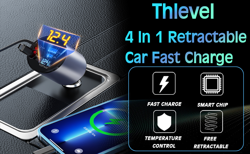 شاحن سيارة Thlevel قابل للسحب 4 في 1 شاحن سريع مع كابلات مزدوجة قابلة للسحب من النوع C (31.5 بوصة) ومنفذي شحن مع عرض الجهد الكهربائي متوافق مع iPhone 15/15 Pro Max Samsung Galaxy Note