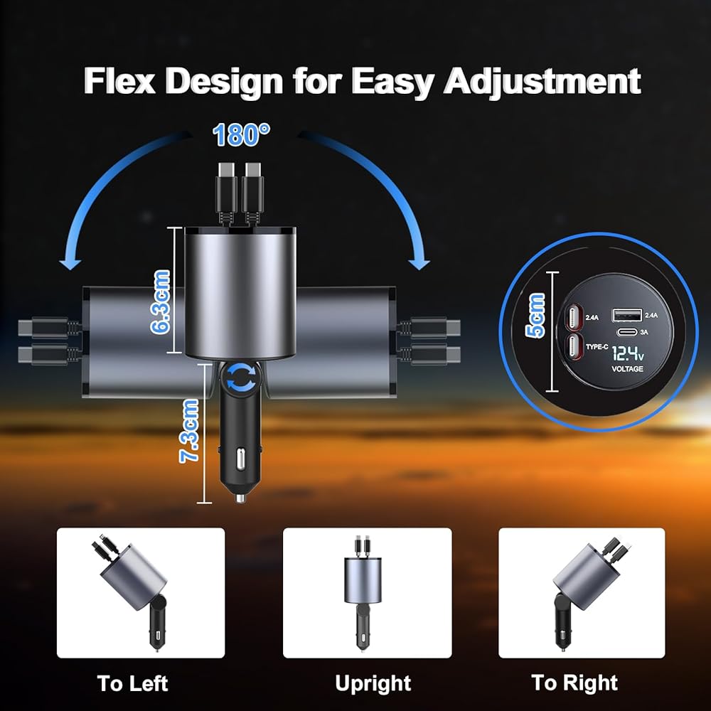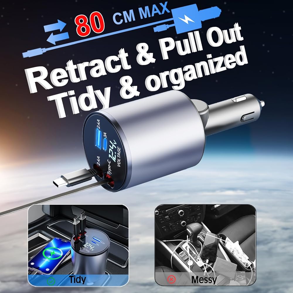 • 【تصميم مرن قابل للسحب】يقوم شاحن السيارة القابل للسحب بسحب الكابل ضمن نطاق 80 سم (31.5 بوصة)، ويتميز بتصميم كابل قابل للسحب مبتكر خالٍ من التشابك يحافظ على تنظيم كابلات الشحن الخاصة بك وجاهزة للاستخدام، ويمكن سحبها تلقائيًا عندما غير مستخدم.