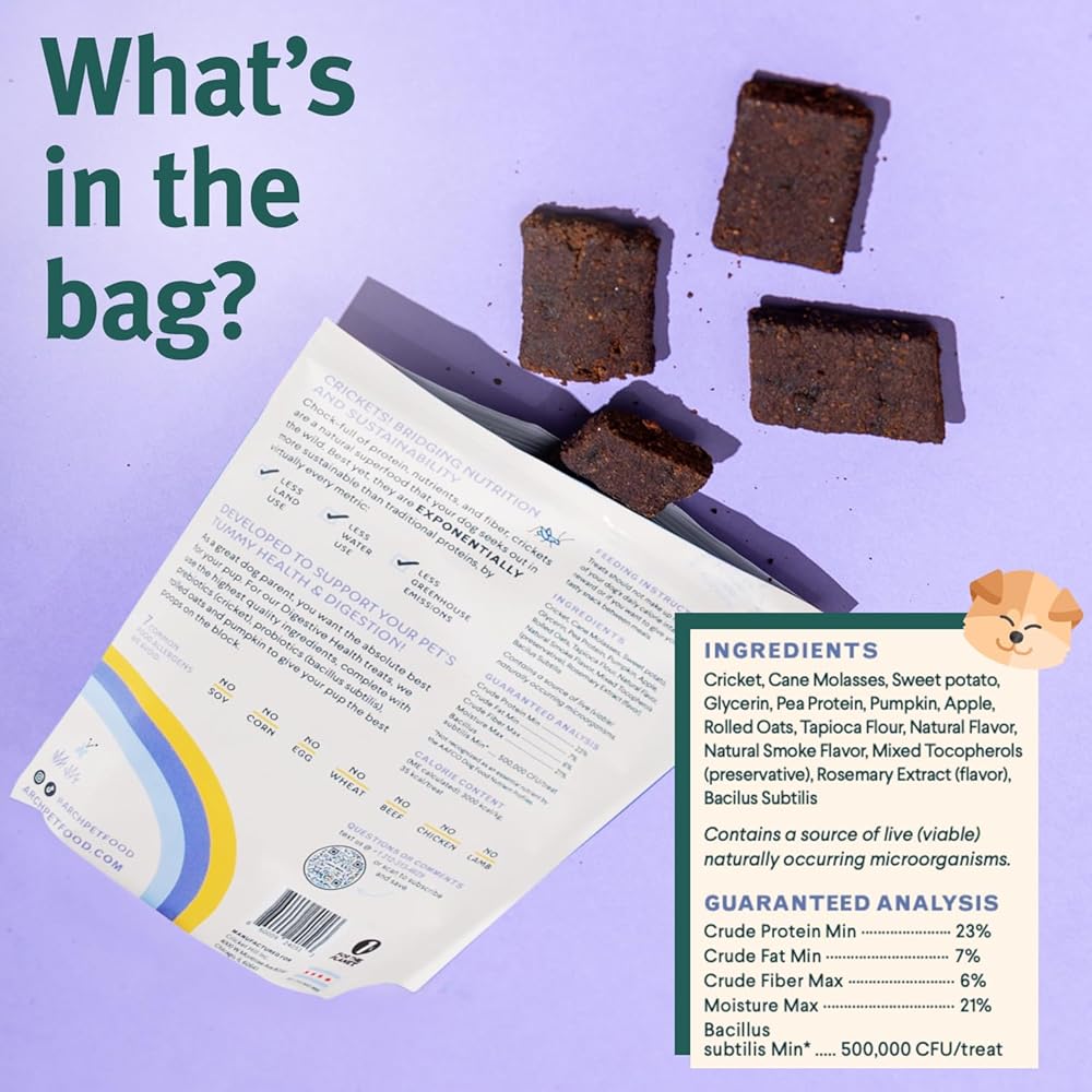 • Better Treats, Better Value - With 60%+ more treats per bag than our close competitors, we've created a DELICIOUS treat that your dog AND your wallet will love. Besides cricket and pea protein, our other main ingredients (molasses, sweet potato, pumpkin, apple and natural smoke flavor) will keep your dog coming back for more