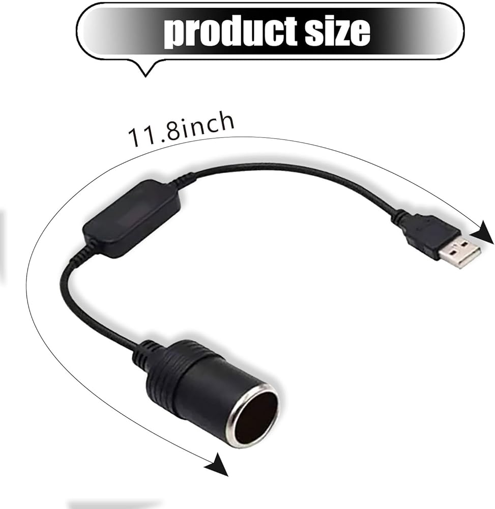 Product Specifications: Package includes 1 x USB cigarette lighter female socket. Input interface USB, output interface cigarette lighter socket, input voltage 5V, input current 2.1A, output voltage 12V, output current 1A. The product line is 13.7" long. The product is small, simple and beautiful, and convenient for travel.