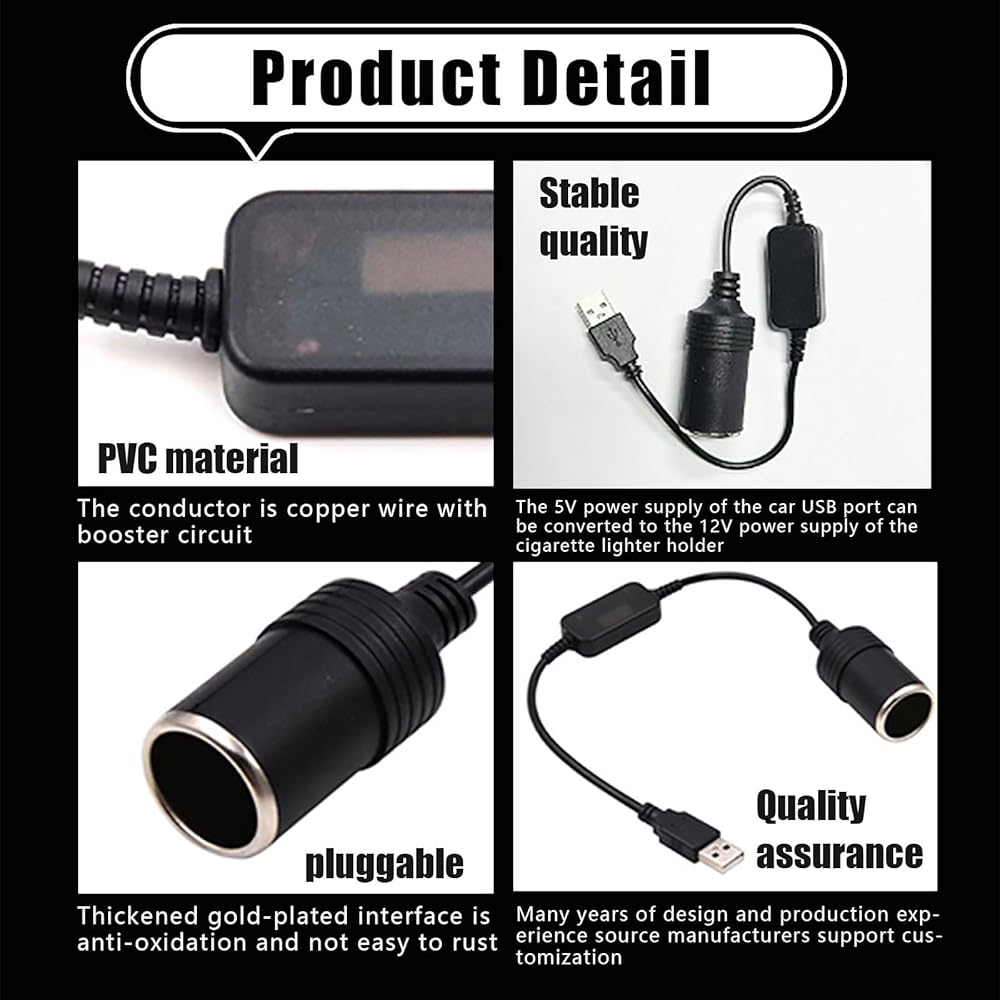 5V to 12V Cigarette Lighter Female: This booster cable can convert the 5V power supply of the car USB port into 12V cigarette lighter holder power supply. With boost conversion circuit, stable quality. The power supply can be converted from the USB port to the 12V car cigarette lighter socket to easily enable the parking monitoring function of the dash cam.