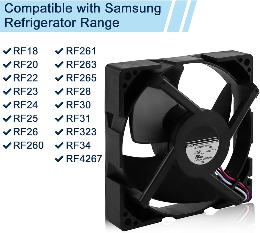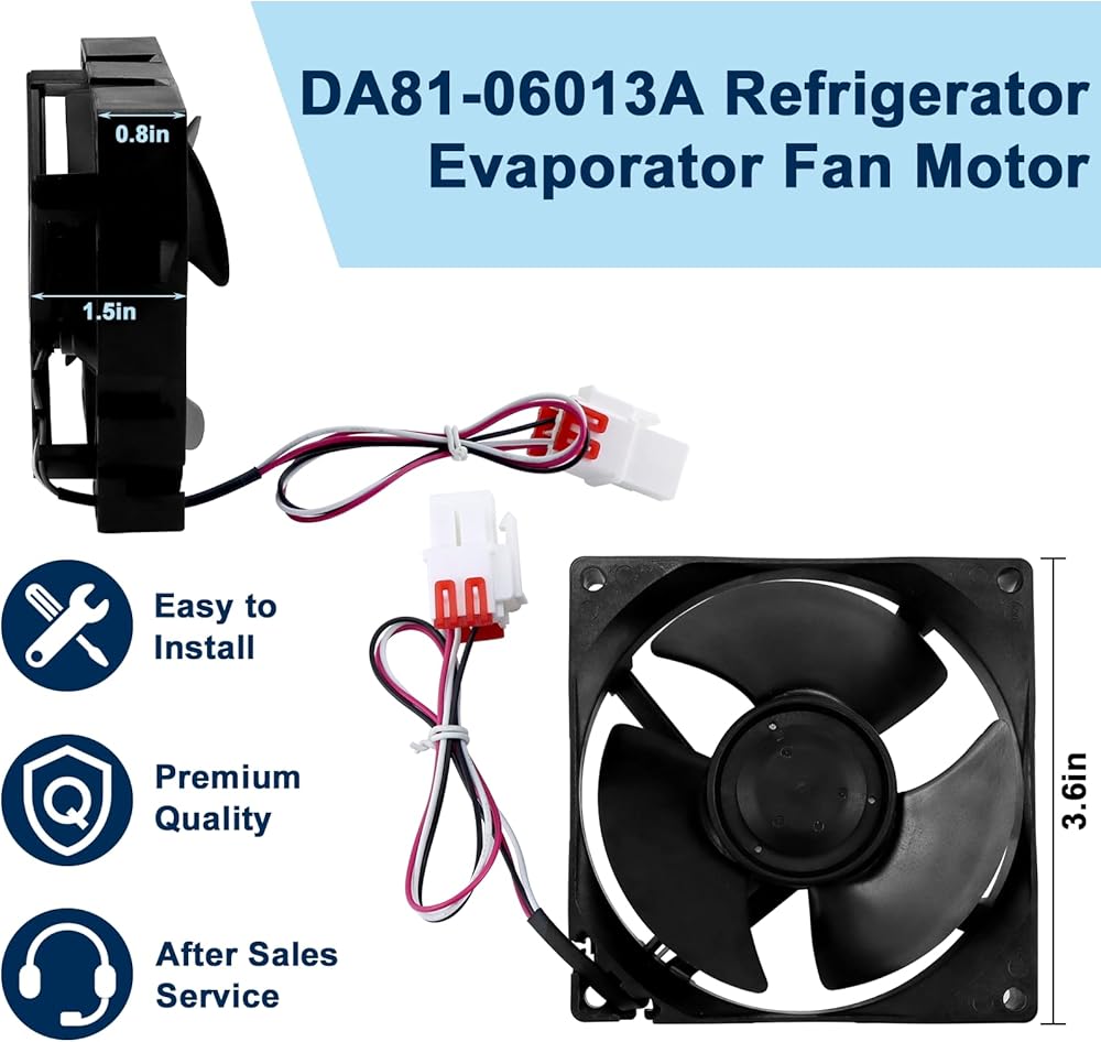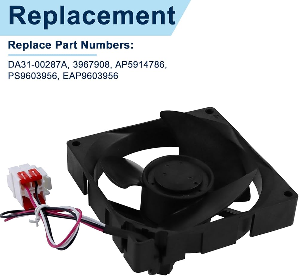 Compatible Models - DA81-06013A evaporator fan motor replaces DA31-00287A, U92C12MS1B3-52, 3612JL-04W-S49, 3967908, AP5914786, EAP9603956, PD00031112, PS9603956. Compatible with SamIsung RF28HFEDBWWAA0000, RF263BEAESG/AA-series, RF263BEAESR/AA-series, RF263BEAEBC/AA-series, RF260BEAESR/AA-series, RF261BEAESP/AA-series, RF25HMEDBWW/AA-series, RF28HMEDBWW/AA-series, RF263TEAESG/AA-series, RF28HDEDBSR/AA-series, RF263TEAESR/AA-series, RF263TEAESR/AA-series and more