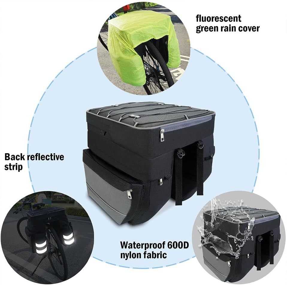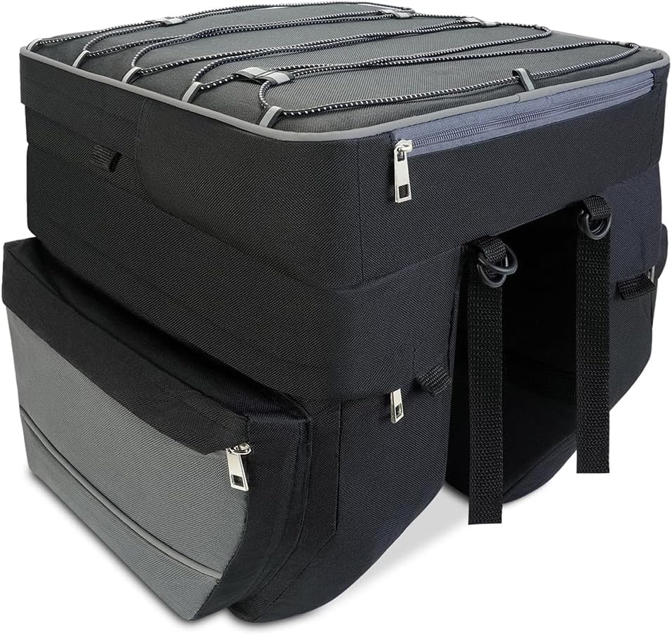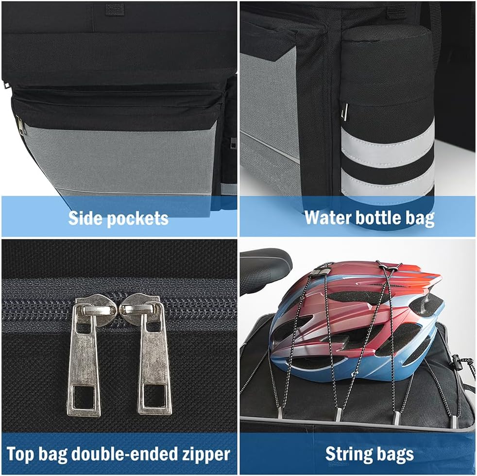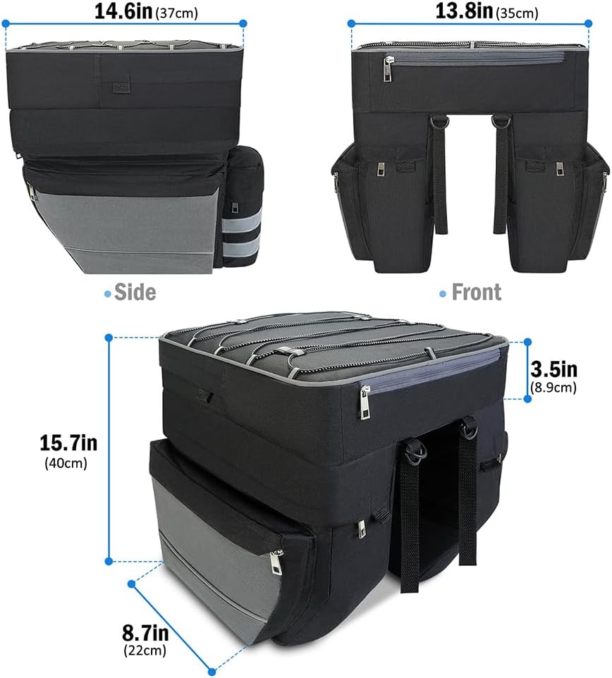 【سعة كبيرة】: الحجم الإجمالي لحقيبة السلة أكبر. تصميم معياري 3 في 1 - حقيبتان جانبيتان كبيرتان مع حقيبة زجاجات مياه (13.8 بوصة * 10.2 بوصة * 5.5 بوصة) + حقيبة علوية مع أكياس خيط (16.5 بوصة * 12.6 بوصة * 9.1 بوصة)، يمكن للحقائب ذات الخيط حمل خوذتك. حقيبة صندوق الدراجة كبيرة بما يكفي لحمل البقالة أو الوجبات الخفيفة أو الأدوات أو غيرها من الأشياء. مثالية للتنقل اليومي أو ركوب الدراجة العائلية أو الرحلات القصيرة أو الرحلات الطويلة.