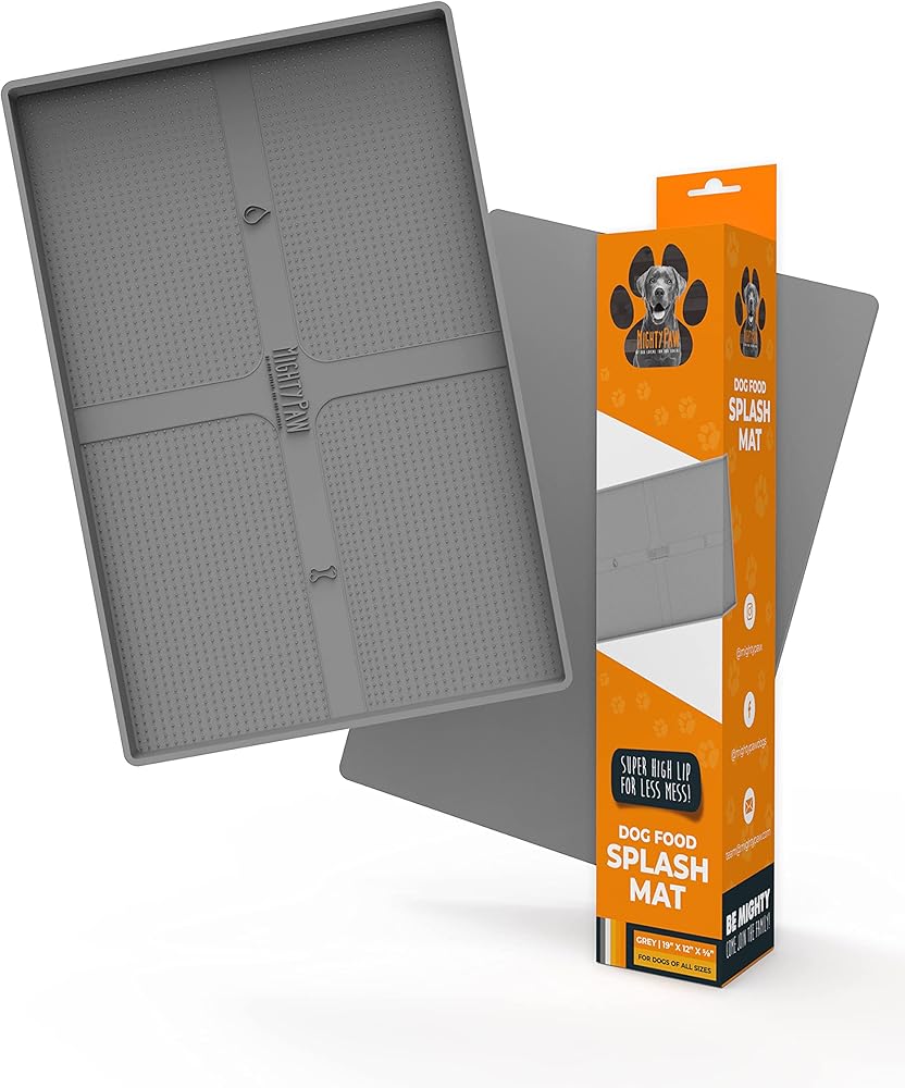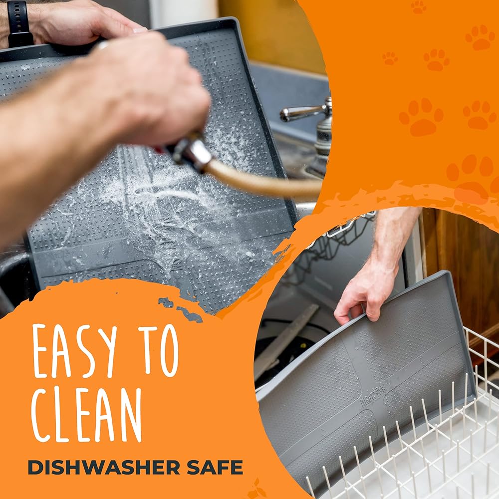 آمنة لأصدقائك ذوي الفراء: تضمن بساط رش طعام الكلاب مايتي باو، المعروف أيضًا باسم بساط وعاء الكلاب، سلامة حيواناتك الأليفة. مقاس 48.26 سم × 30.48 سم × ⅝"، بساط تغذية الكلاب هذا مصنوع من سيليكون صالح للطعام وخالي من مادة BPA بنسبة 100%. التصميم الرمادي الأنيق لبساط طعام الحيوانات الأليفة هذا يكمل معظم الديكورات الداخلية