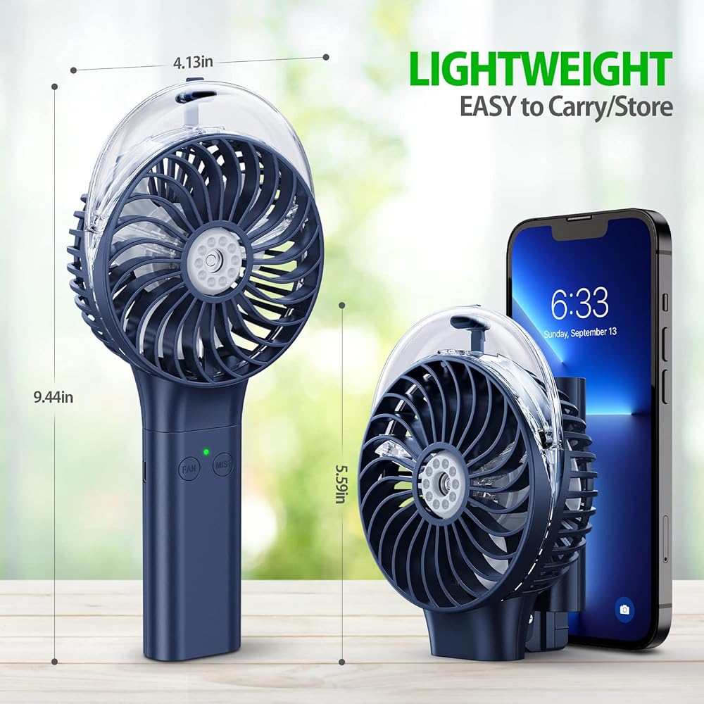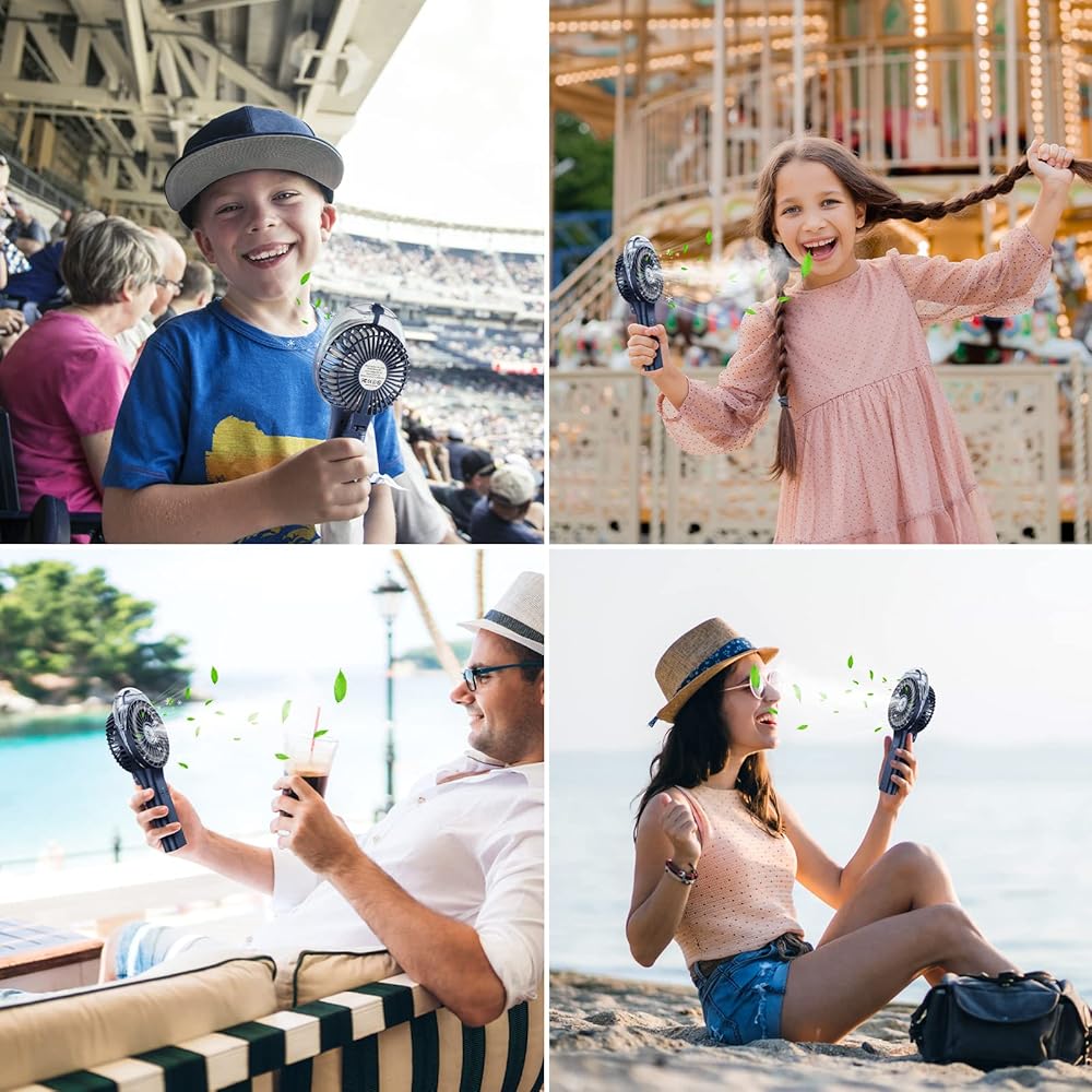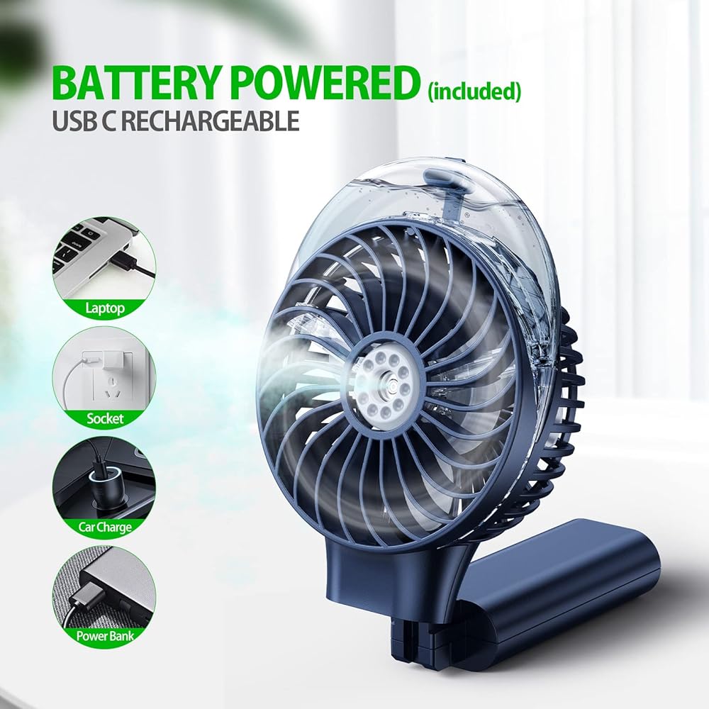 محمولة، محمولة باليد وحامل: مروحة صغيرة خفيفة الوزن بوزن 8 أونصة، مقبض قابل للطي لإمالة 180 درجة، سهلة الحمل والتخزين؛ يمكنك حملها باليد أثناء المشي أو الجلوس أو الوقوف على مكتبك أثناء العمل...مثالية للاستخدام في الهواء الطلق وفي الداخل: السفر، عالم ديزني، ألعاب الكرة، التخييم...