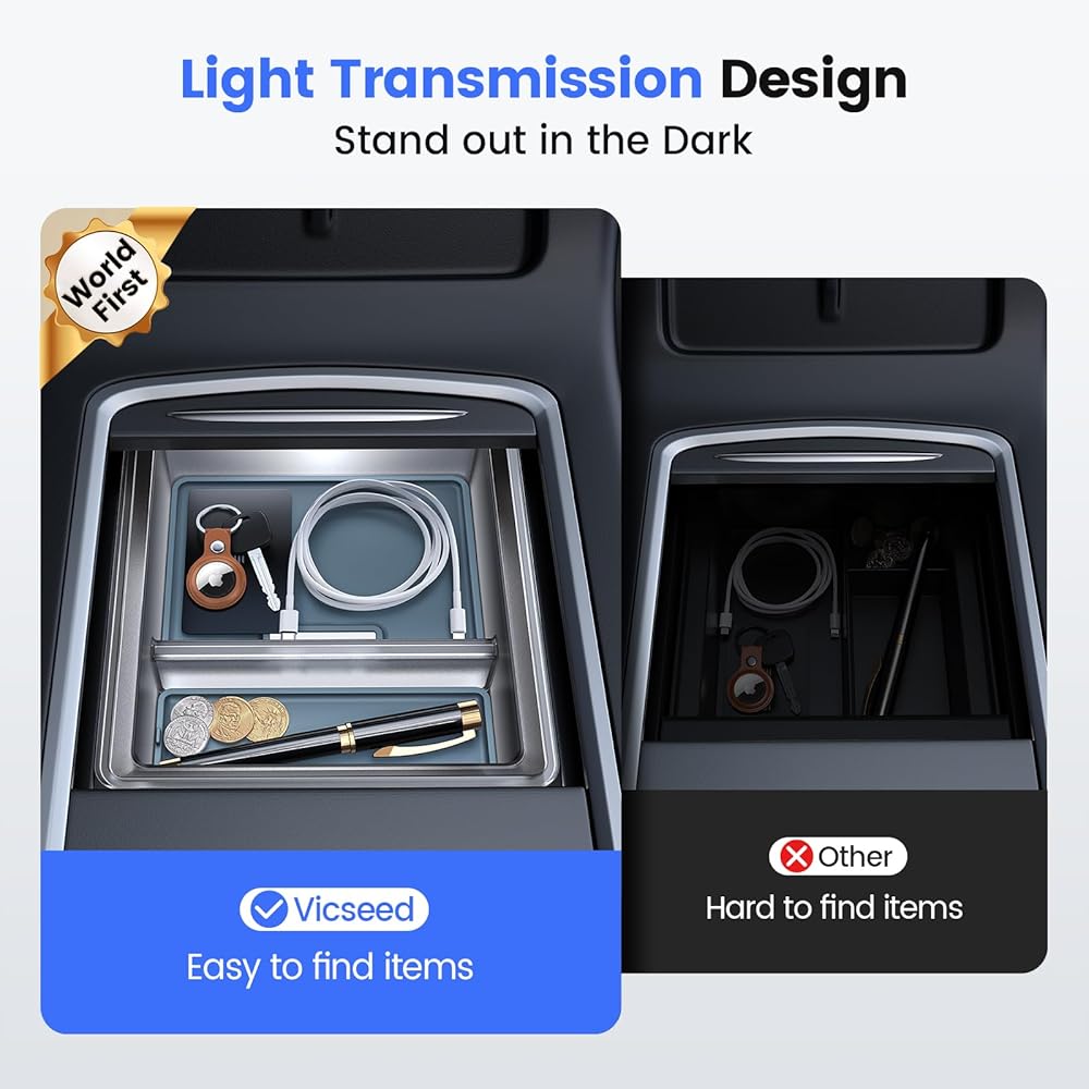‹‹قل وداعًا للحظة المحرجة المتمثلة في عدم القدرة للعثور على الأشياء في بيئة حالكة السواد! تستخدم صينية تنظيم وحدة التحكم المركزية من تيسلا مادة أكريليك شفافة فريدة من نوعها، مما يجعلها مميزة في الظلام. على عكس المنتجات السوداء الأخرى، يمكن للضوء أن يمر بسهولة من خلال منتجاتنا لإضاءة منظم Tesla Model 3/Y بالكامل، مما يسمح لك بالعثور بسهولة على العناصر التي تحتاجها في الظلام.