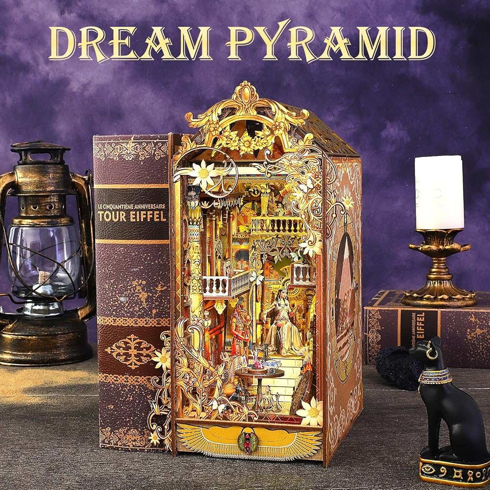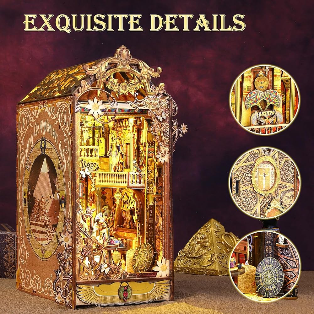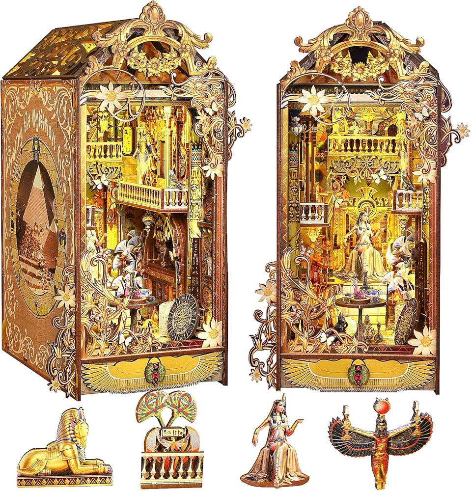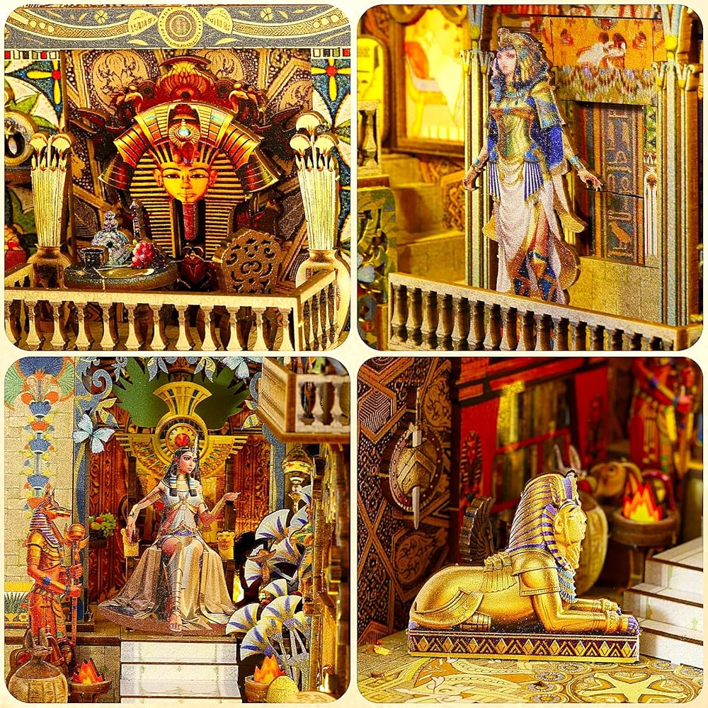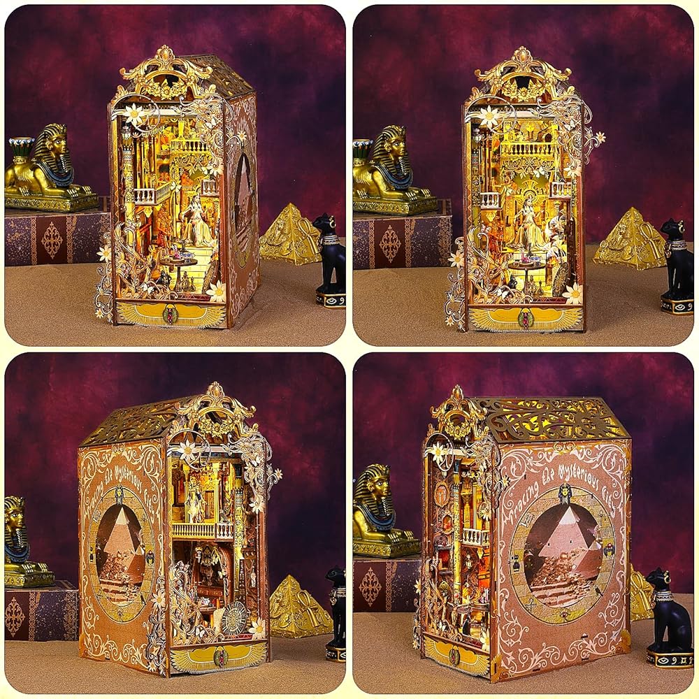 DIY Book Nook Kit: Tracing the mysterious city, marvel at the splendid palaces and mysterious elegance of ancient Egyptian queens, exploring the unique beauty of Egypt. Wooden Assembled book nook with touch-sensor LED light and music box, 3D miniature book nook kit combines a 3D diorama, book coner and decoaration in one. Designed for DIY enthusiasts and creative minds.