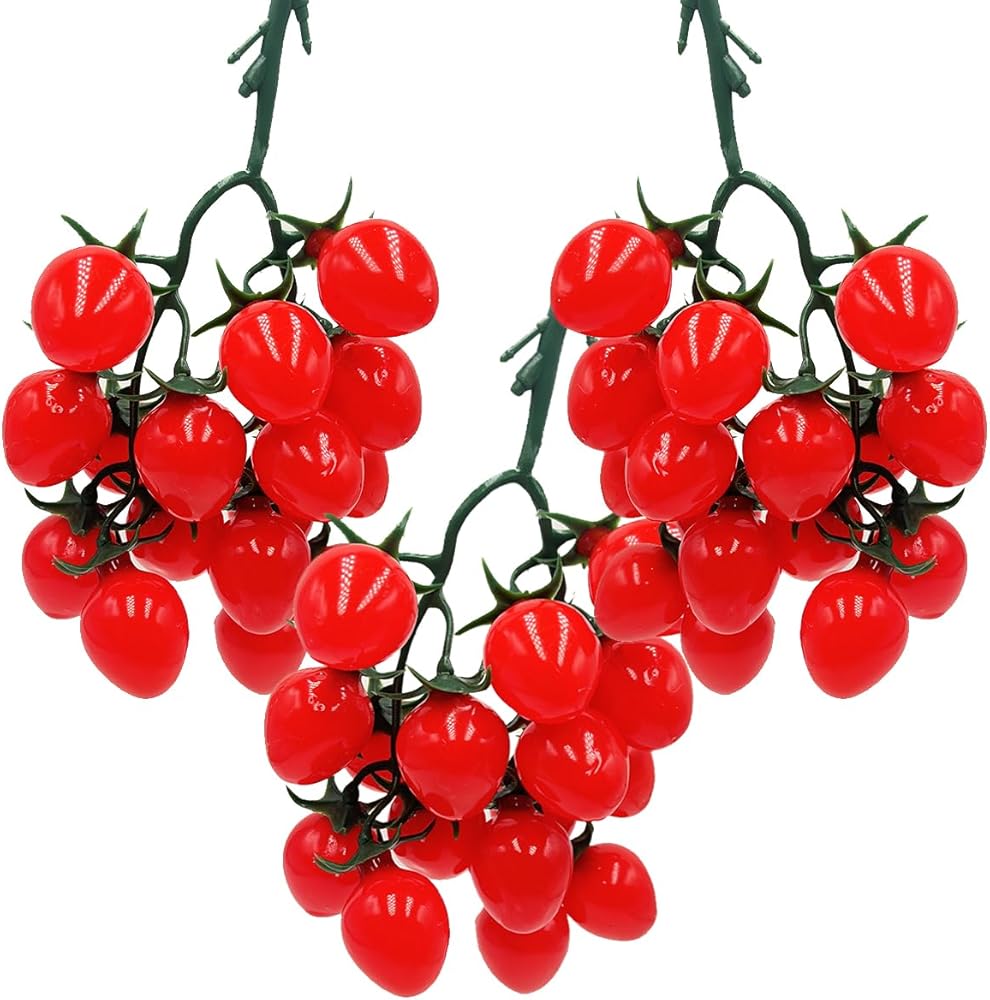 Size: Artificial red cherry tomatoes Length: 7 inches, individual fruit width: 1.57 inches.