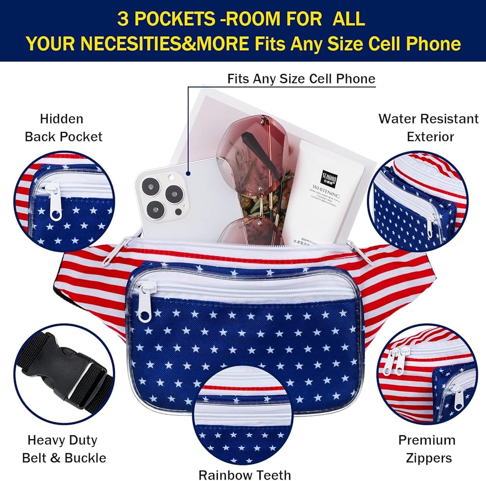 تصميم كلاسيكي وغير تقليدي: تتم طباعة حقيبة فاني الوطنية بتصميم العلم الأمريكي، وهي كلاسيكية جدًا وتتماشى إلى حد كبير مع موضوع يوم الاستقلال الأمريكي؛ يمكنك ارتداء هذه الحقيبة بسهولة أسفل الجزء العلوي من ملابسك للحصول على مظهر سري، وهي اختيار جيد للإكسسوارات