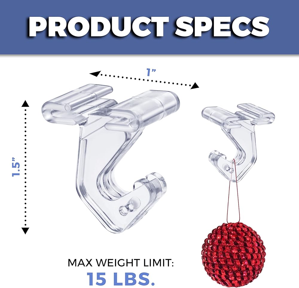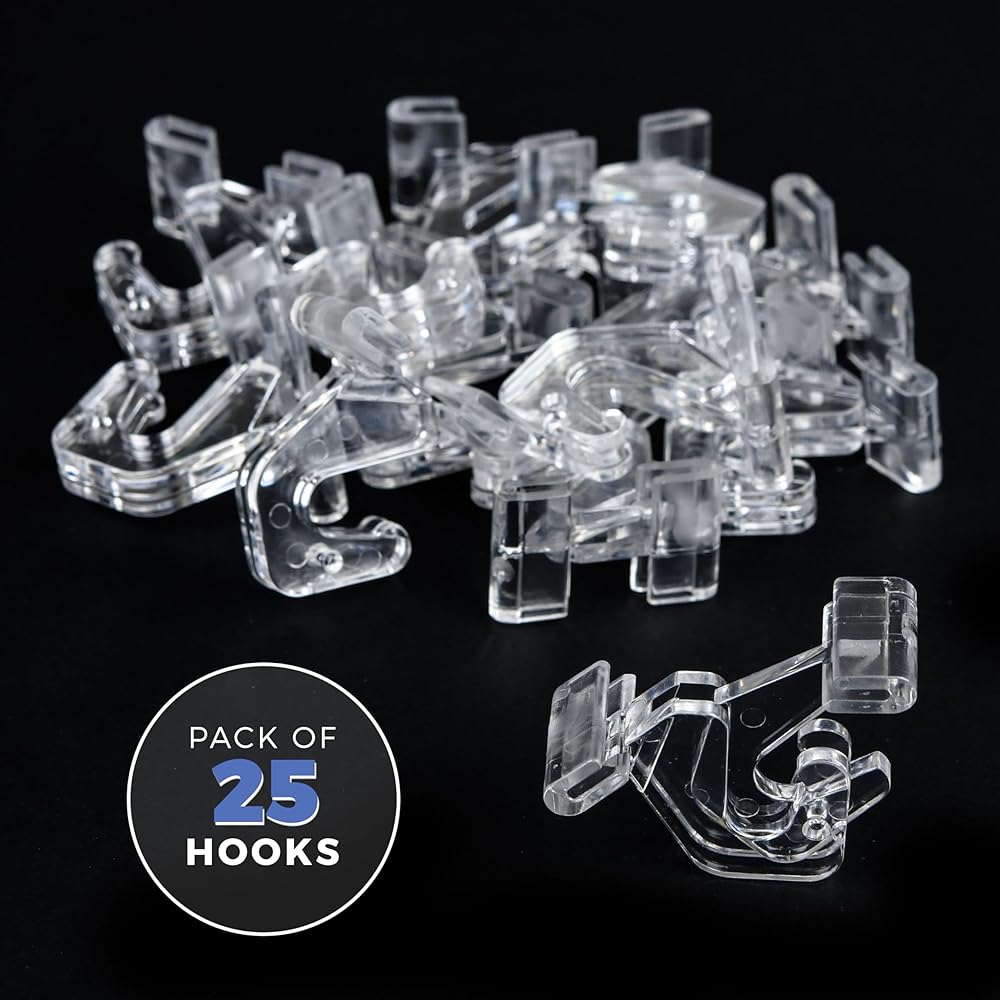 حزمة من 25 - خطافات سقف من البولي كربونات بمفصلات شفافة كريستالية لقضبان السقف المتدلية، تحمل ما يصل إلى 15 رطلاً. 1 بوصة عرض × 1 ½ بوصة ارتفاع