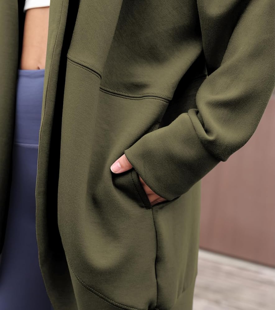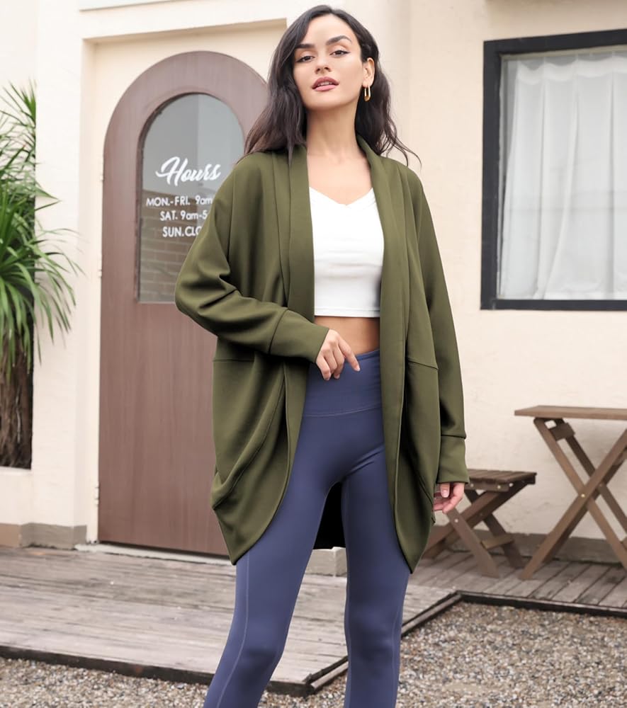 أكتاف منسدلة بسلاسة، وأكمام جناح الخفاش، وجيوب عملية، وطول متوسط