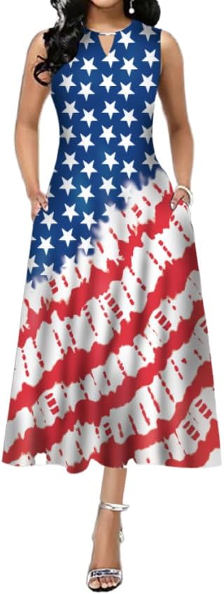 فستان طويل للسيدات بدون أكمام بعلم أمريكا الرابع من يوليو بدون أكمام مع جيب