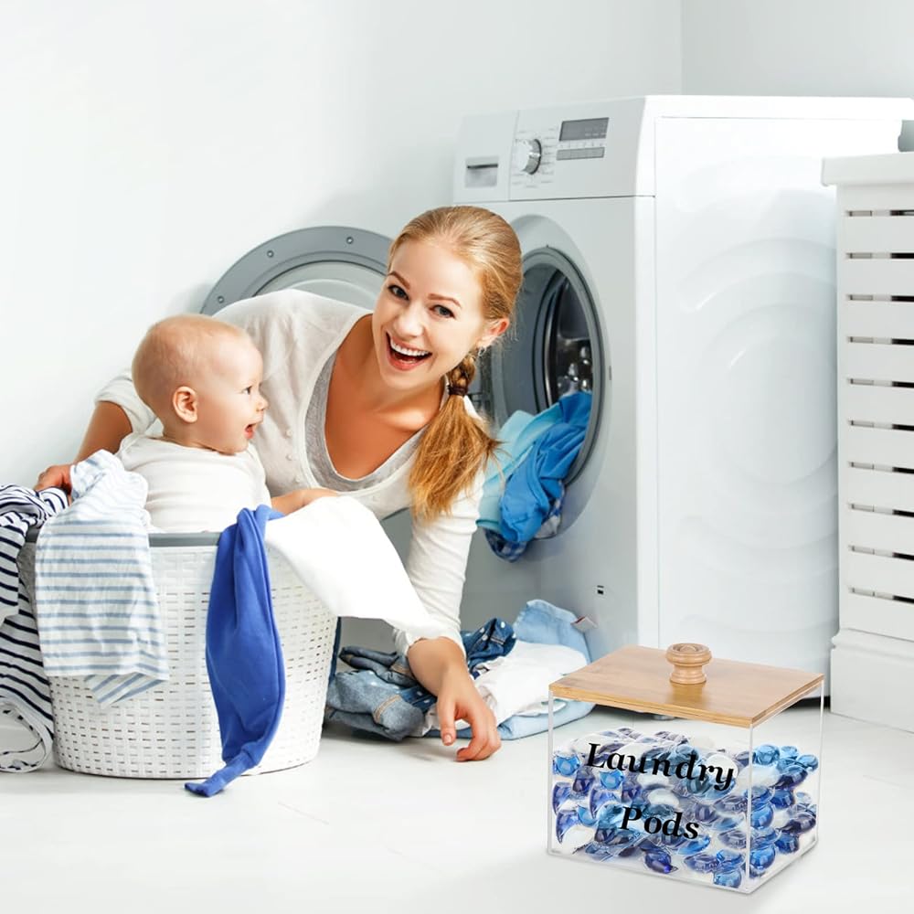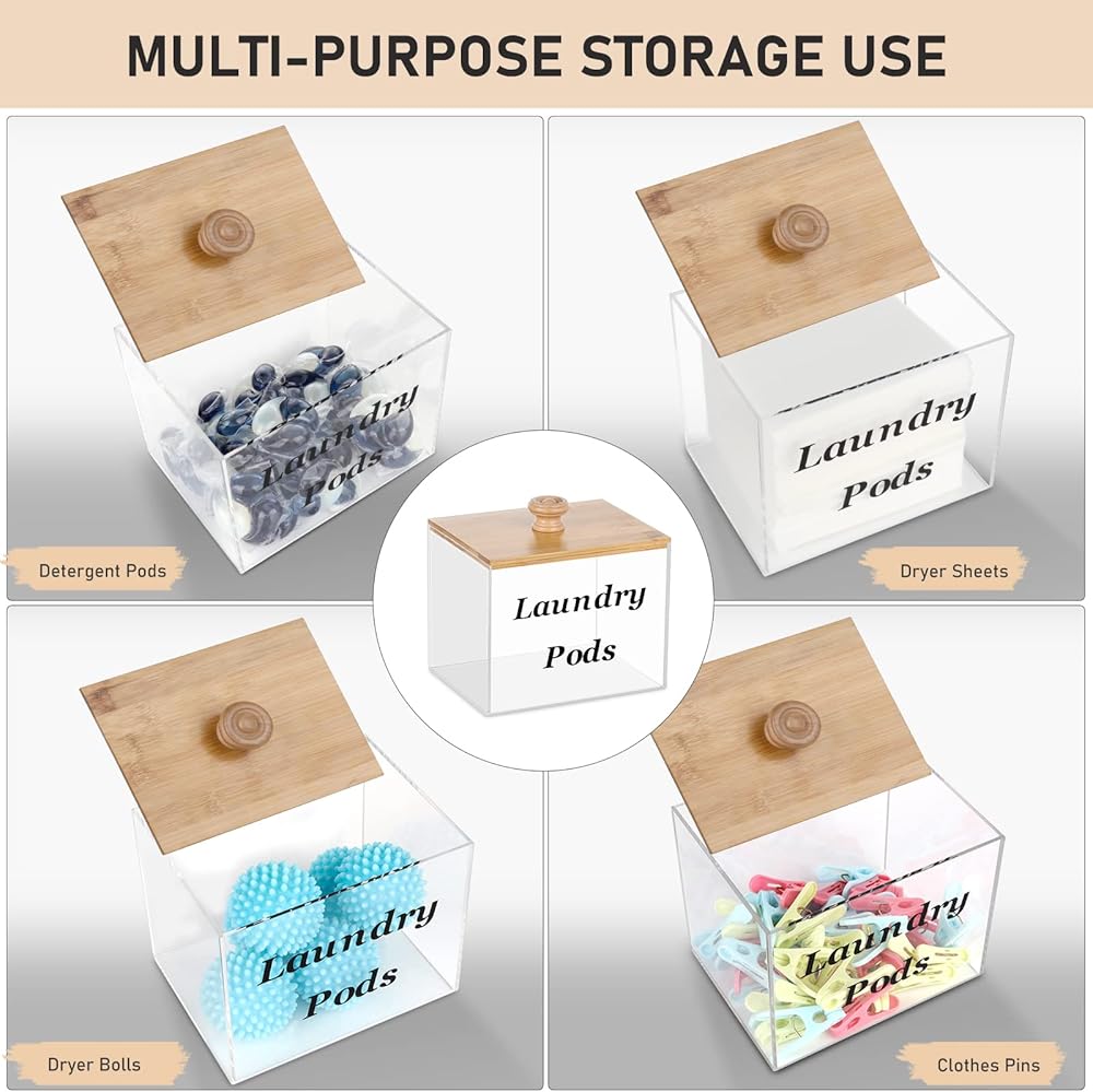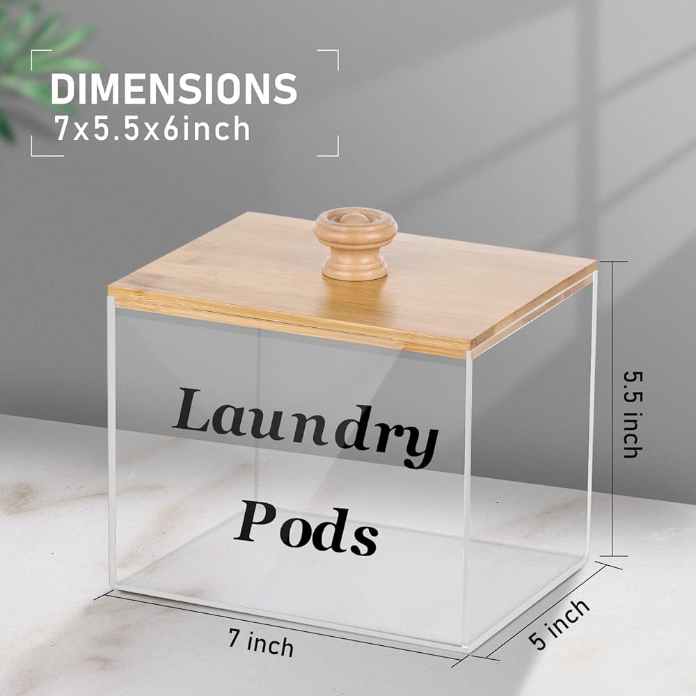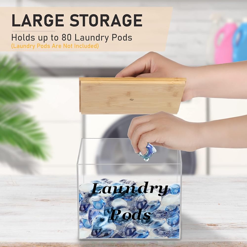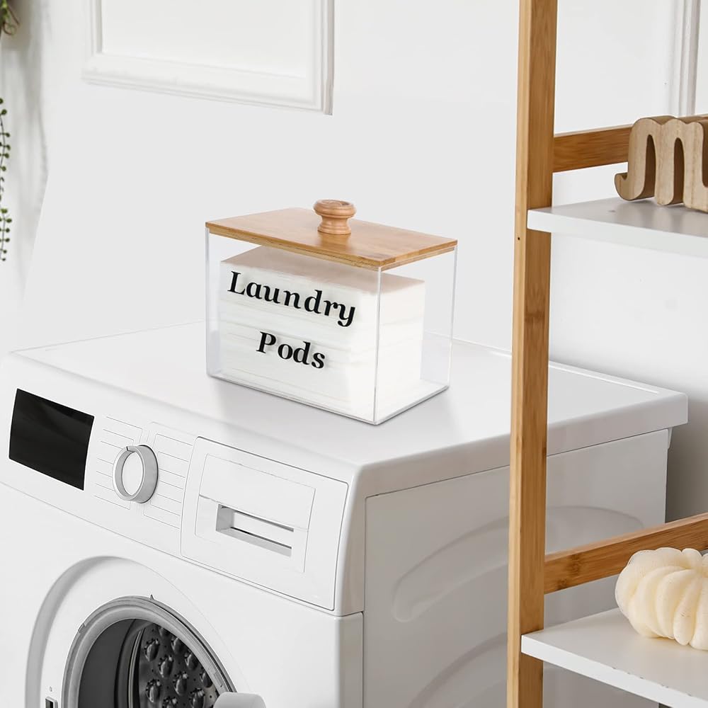 حاوية حفظ الغسيل الاكريليك مع غطاء من الخيزران، حامل كبسولات الغسيل الشفاف لغرفة الغسيل، حاويات تخزين ديكورية، مناسبة لاغطية المجفف، حبوب الغسيل، منعم الاقمشة