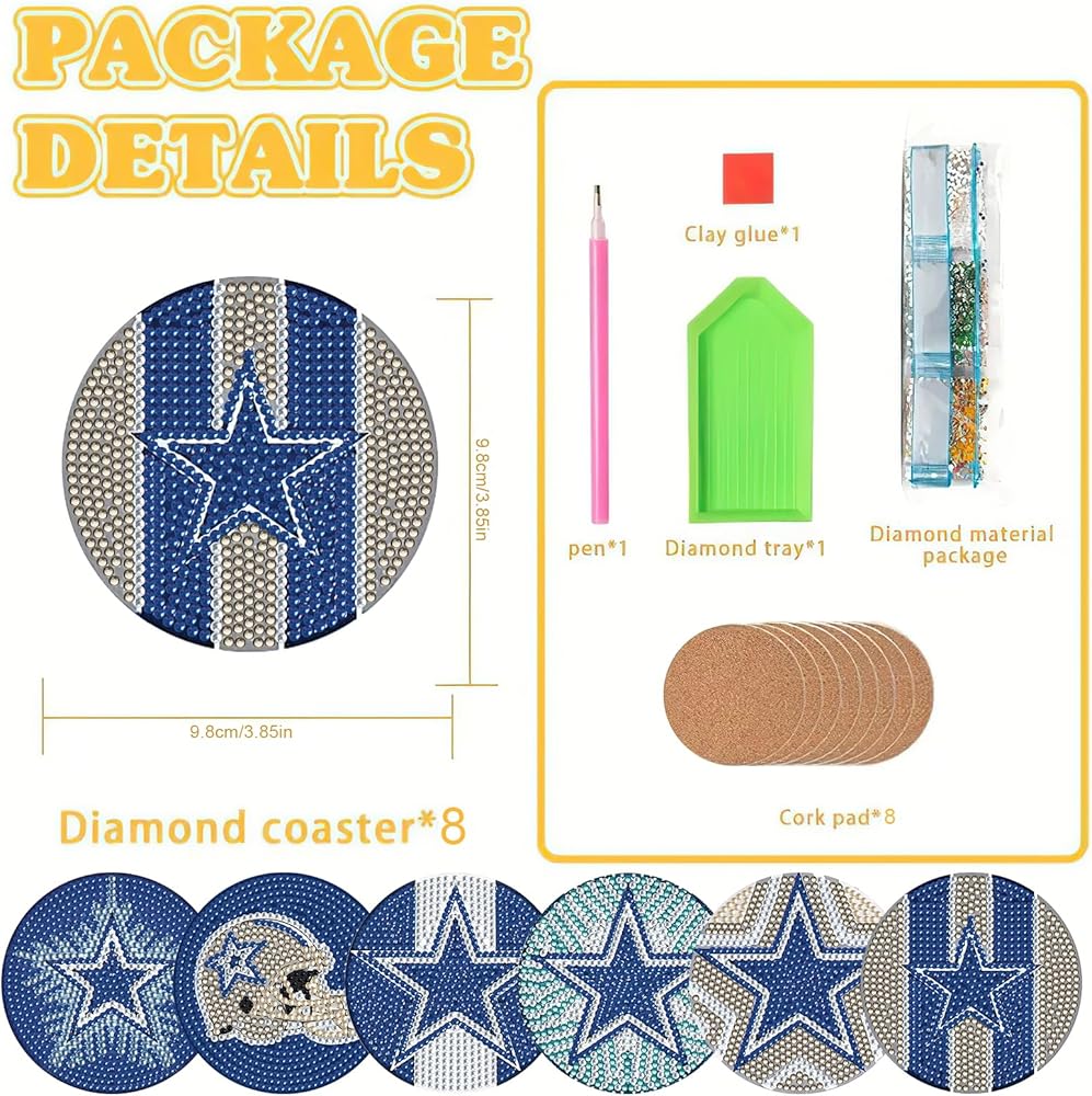 COASTERS PACKAGE COME WITHS - Fooball Diamond Painting Coaster x 8, Cork Pad x 8, Coaster Holder x 1, Colorful Diamonds Beads, Clay Glue x 1, Pen x 1, Diamond Tray x 1