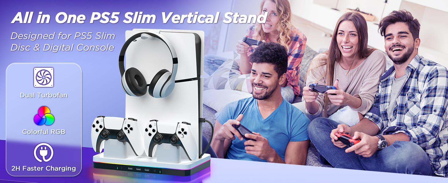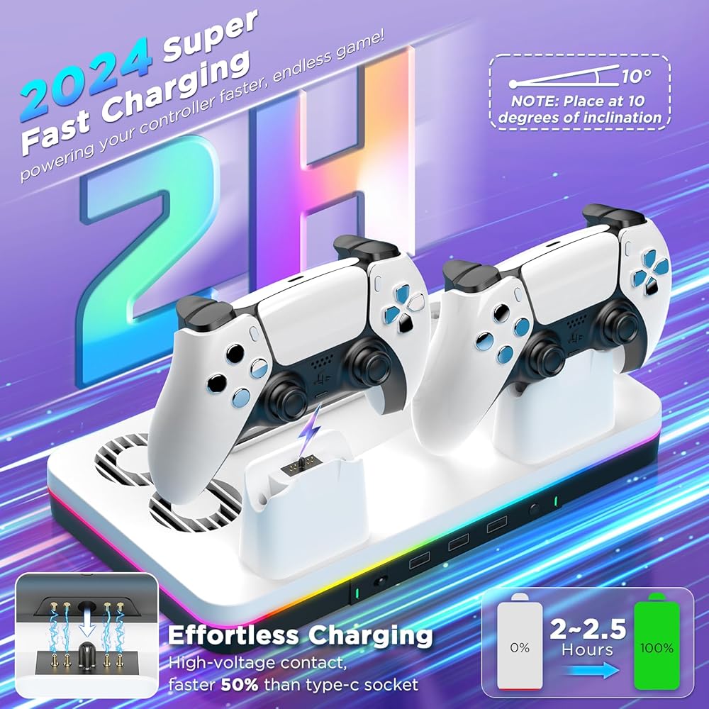🥇【حامل رأسي الكل في واحد سهل الاستخدام】يجمع الحامل الرأسي النحيف متعدد الوظائف لجهاز PS5 بين الشحن السريع والتبريد والتخزين في جهاز واحد، ويستوعب سماعة الرأس النحيفة PS5 ووحدات التحكم DualSense ووحدة التحكم ويحتوي على 3 محاور USB لنقل البيانات . وهذا يوفر المساحة ويحافظ على تنظيم جميع ملحقات جهاز PS5 النحيف بشكل جيد. إنه خيار هدية ممتاز يوفر فترة ضمان ممتدة تبلغ 365 يومًا. سيقوم فريق ما بعد البيع المحترف لدينا بالرد على مشكلات الاستخدام الخاصة بك وحلها في غضون 12 ساعة!