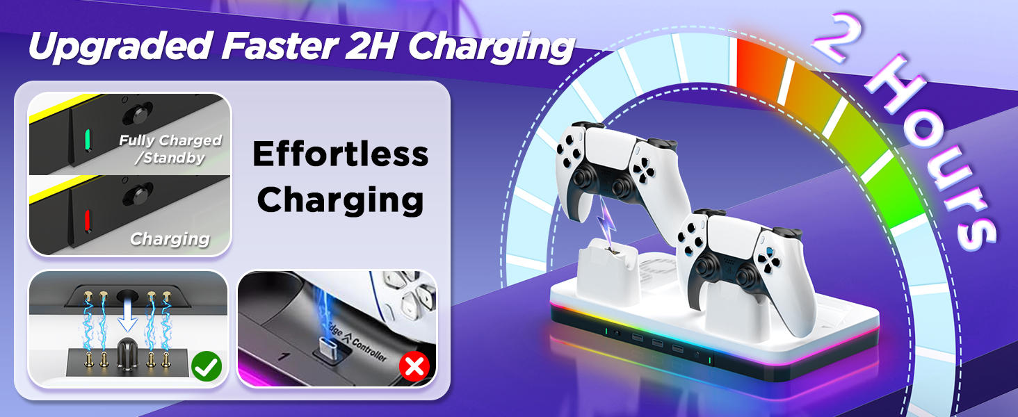 🥇【شحن فائق السرعة لمدة ساعتين لوحدة التحكم المزدوجة】بمجرد توصيلها بوحدة تحكم Playstation5 النحيفة أو محول 5 فولت/3 أمبير، يمكن لمحطة التبريد PS5 Slim هذه شحن وحدتي تحكم في وقت واحد، دون أي كابلات شحن إضافية ولا مزيد من الفوضى. ما عليك سوى وضع وحدات التحكم عموديًا وإمالتها للخلف حوالي 10 درجات للاتصال. يتحول مؤشر LED إلى اللون الأحمر عند الشحن والأخضر عند الشحن بالكامل. تتوقف الرقائق المدمجة عن الشحن عند اكتمالها بذكاء لحماية بطارية وحدة التحكم PS5 Slim. يستخدم هذا الحامل نقطة لمس عالية الطاقة للشحن بشكل أسرع من غيره باستخدام منفذ C. في غضون ساعتين ونصف، سيتم شحن وحدات التحكم Sense الخاصة بك بالكامل، مما يضمن اللعب دون انقطاع ومتعة لا نهاية لها!