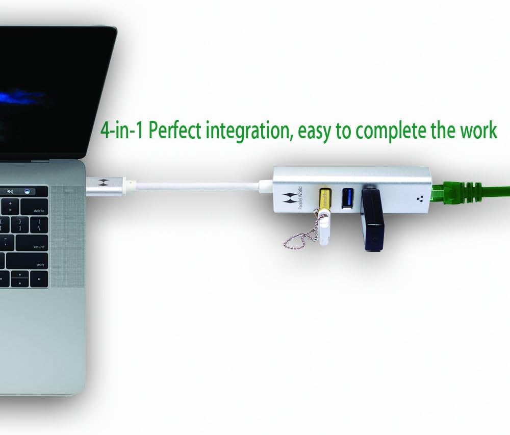 Parallel World USB-C to 3-Port USB 3.0 Hub with Ethernet Adapter The product design: