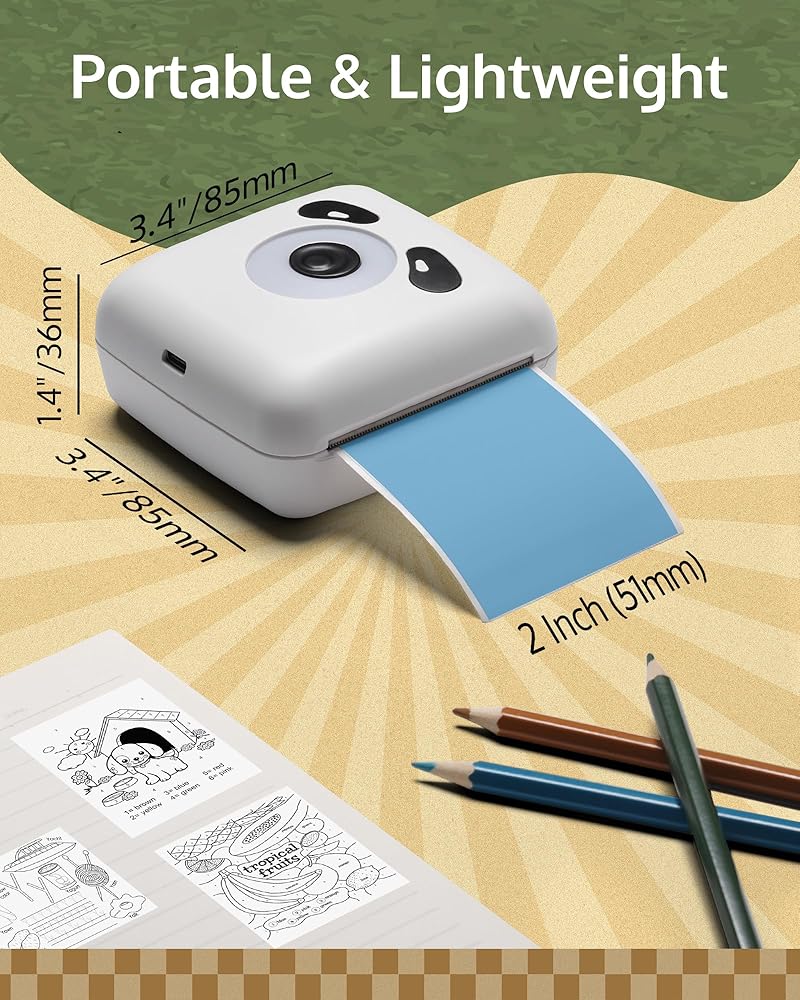 𝐂𝐨𝐦𝐩𝐚𝐜𝐭 𝐚𝐧𝐝 𝐏𝐨𝐫𝐭𝐚𝐛𝐥𝐞: صغير الحجم وخفيف الوزن بوزن 0.42 رطل، بأبعاد 3.15 × 1.4 × 3.15 بوصة. مجهزة ببطارية قابلة لإعادة الشحن بسعة 1000 مللي أمبير في الساعة لمدة تصل إلى 8 ساعات من الطباعة. مثالية للاستخدام أثناء التنقل، ومثالية لتسجيل القصاصات وطباعة ملاحظات الطلاب.