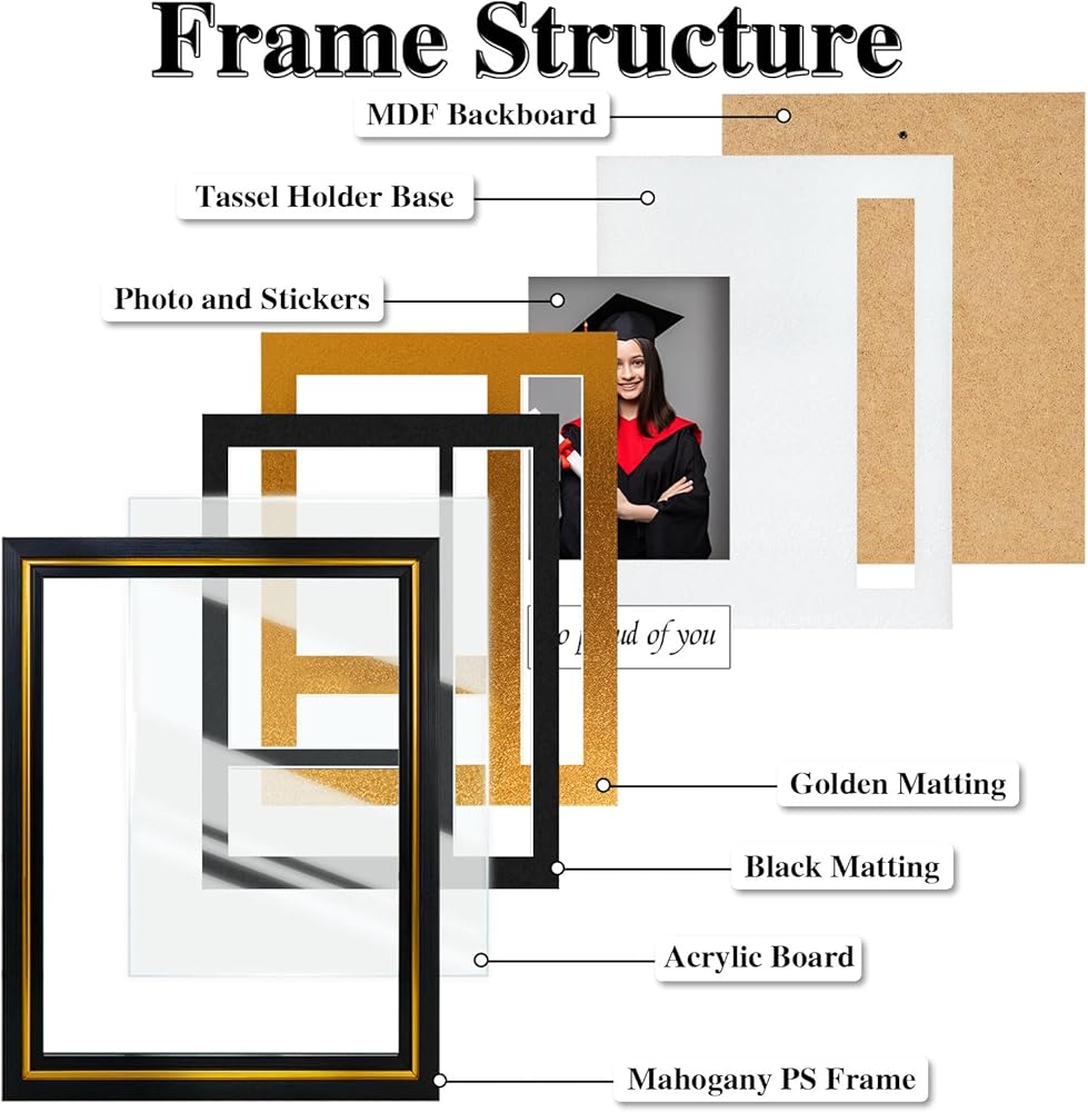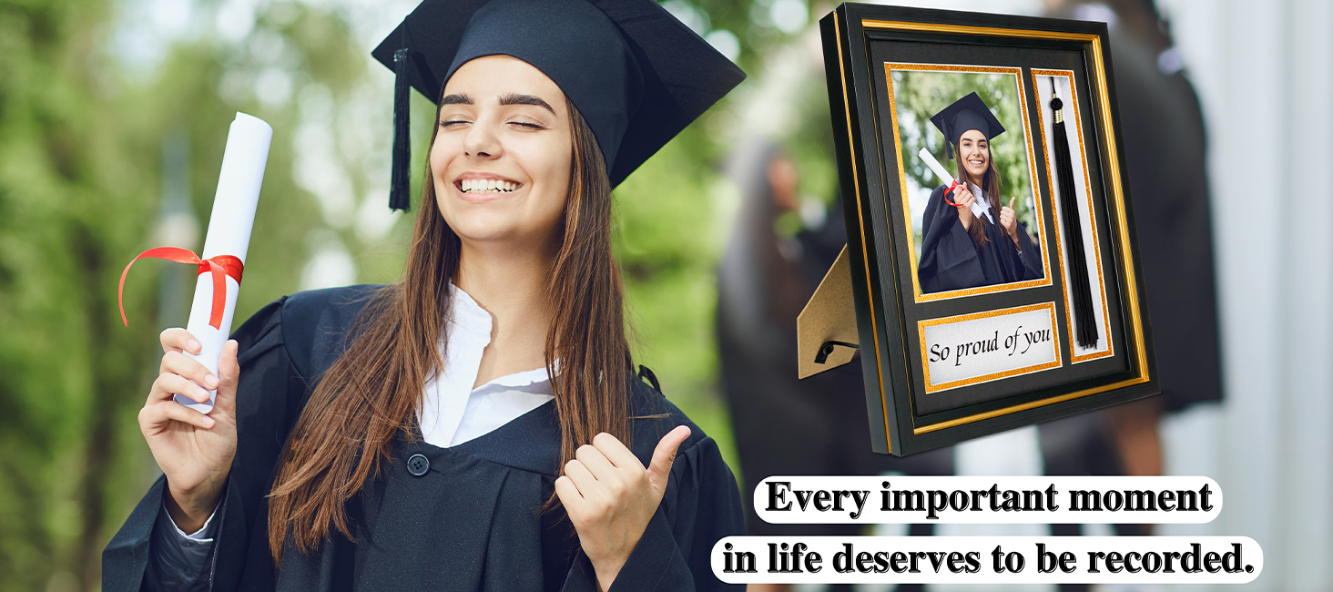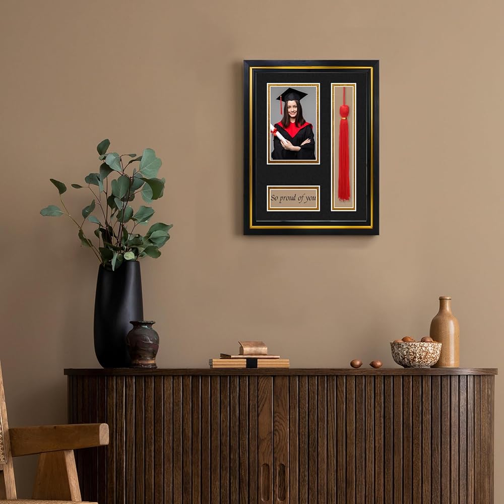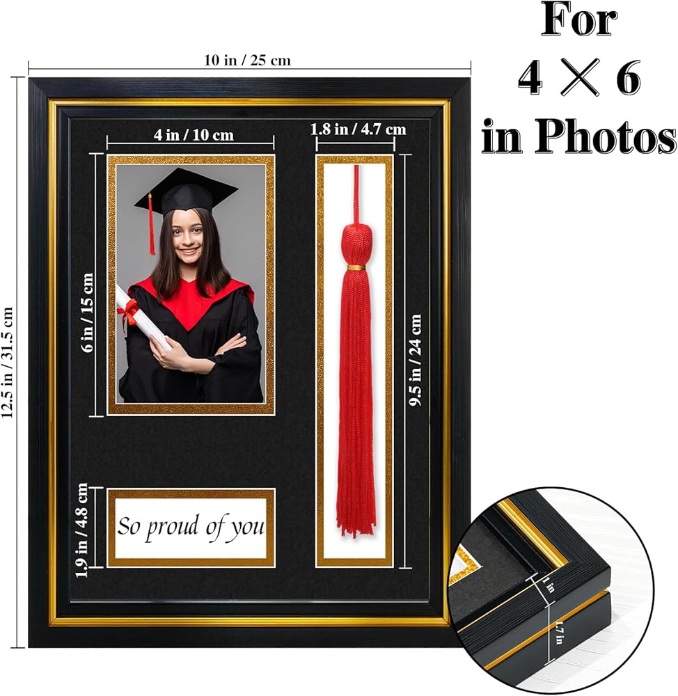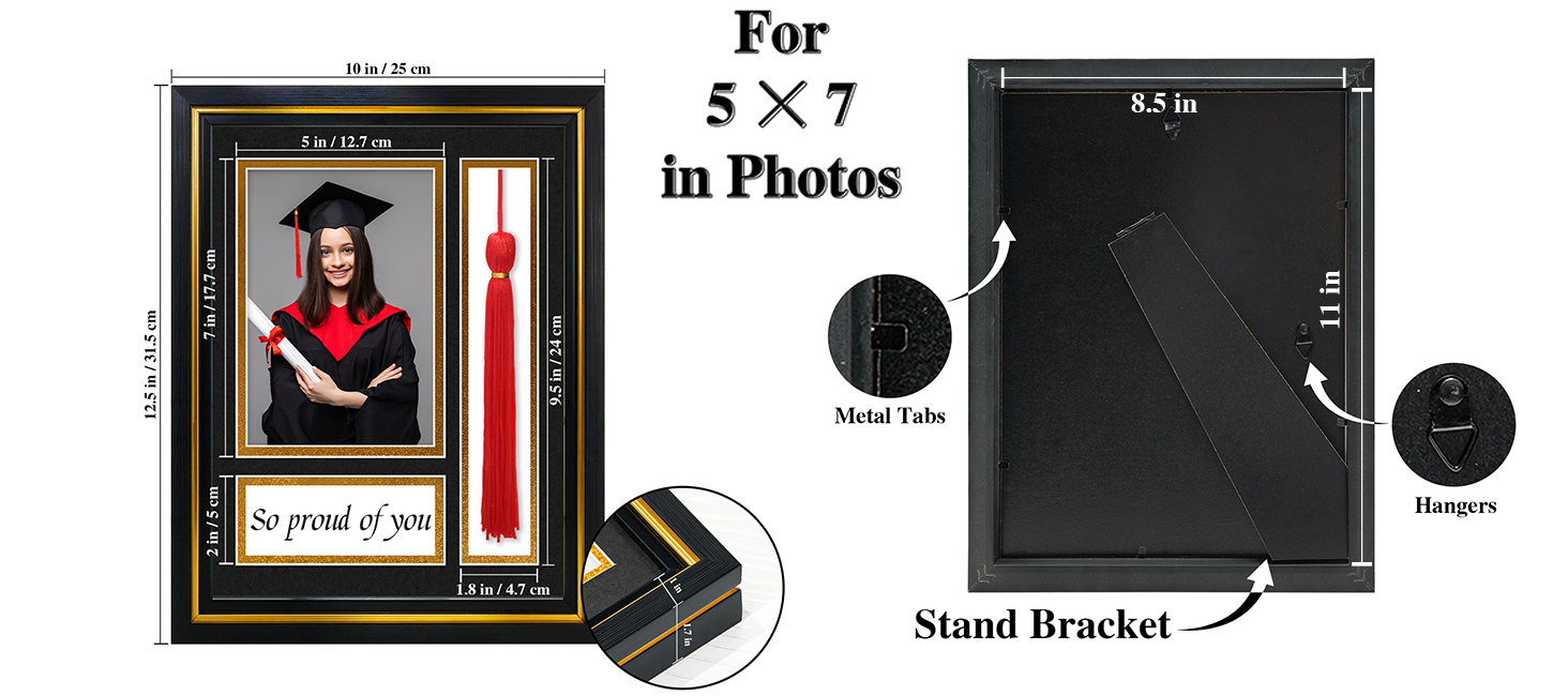 الحجم: مصنوع لعرض صور مقاس 5 × 7 بوصة وشرابات تقليدية مقاس 9 بوصة مع حصيرة مزدوجة سوداء فوق ذهبية. ملصق مقاس 2 × 5 بوصة قابل للإزالة. الحجم الإجمالي للإطار هو 10 بوصة × 12.5 بوصة × 1 بوصة.
