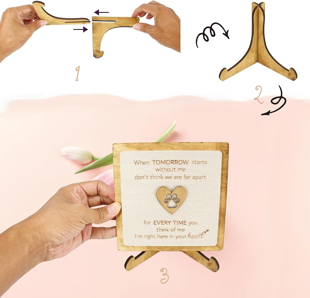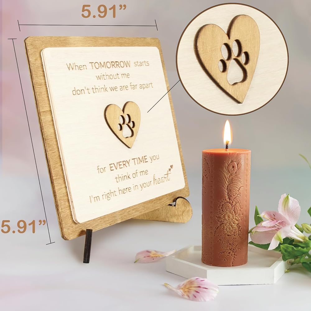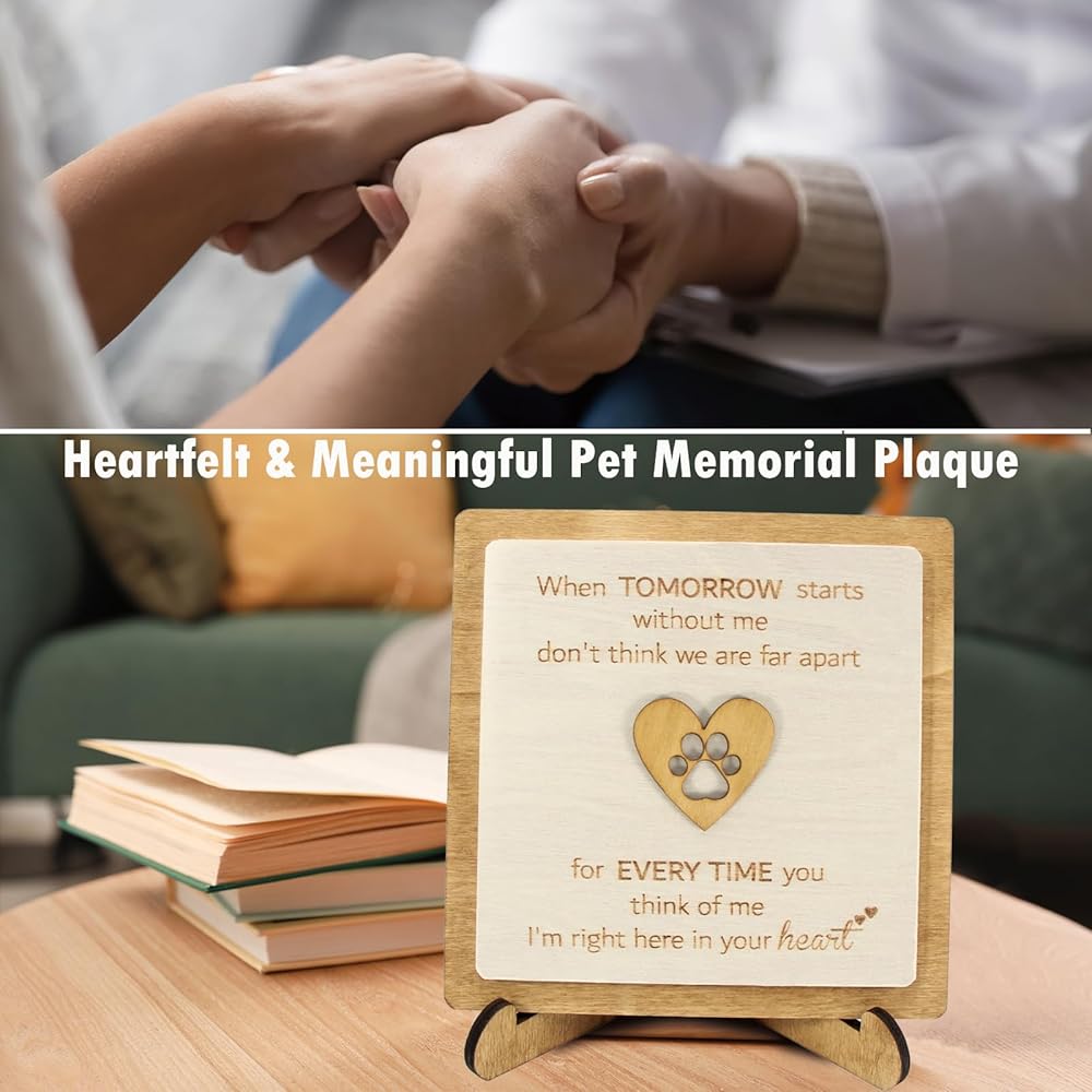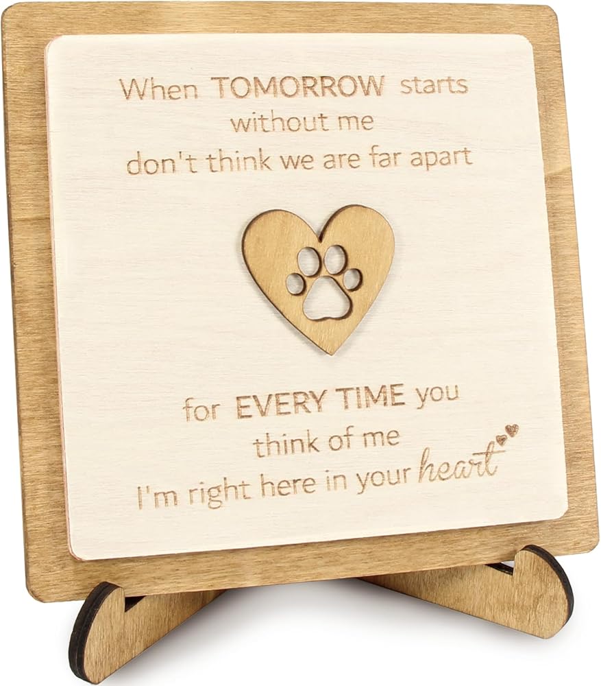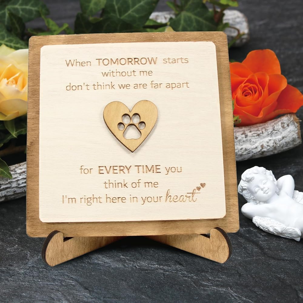Crafted with Love Pet Remembrance Gifts: Remember your beloved furry friend with this unique and sentimental pet memorial plaque. The laser-engraved message, "When tomorrow starts without me, don't think we are far apart, for every time you think of me, I'm right here in your heart," brings solace and comfort to those grieving the loss of their pet.