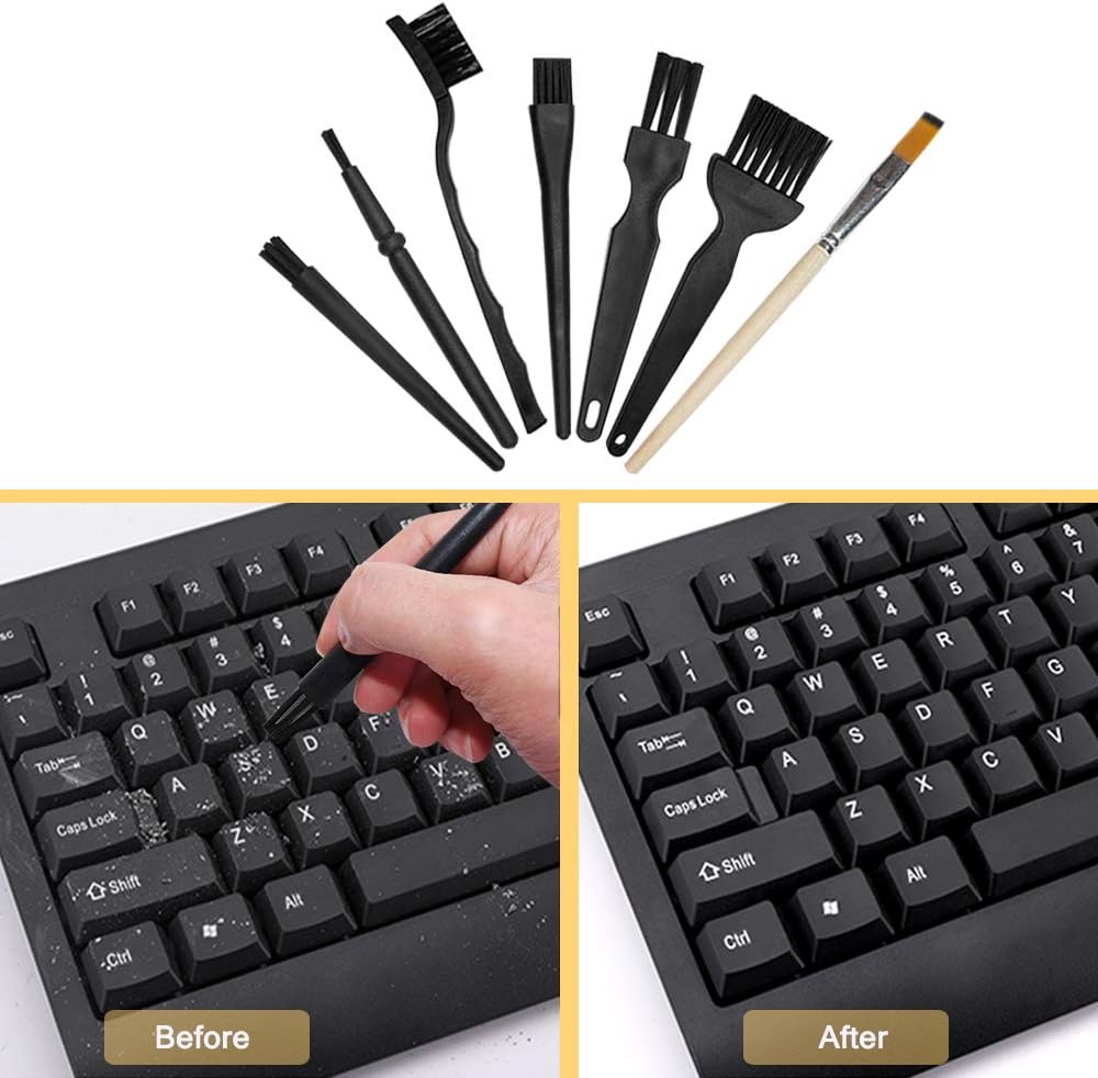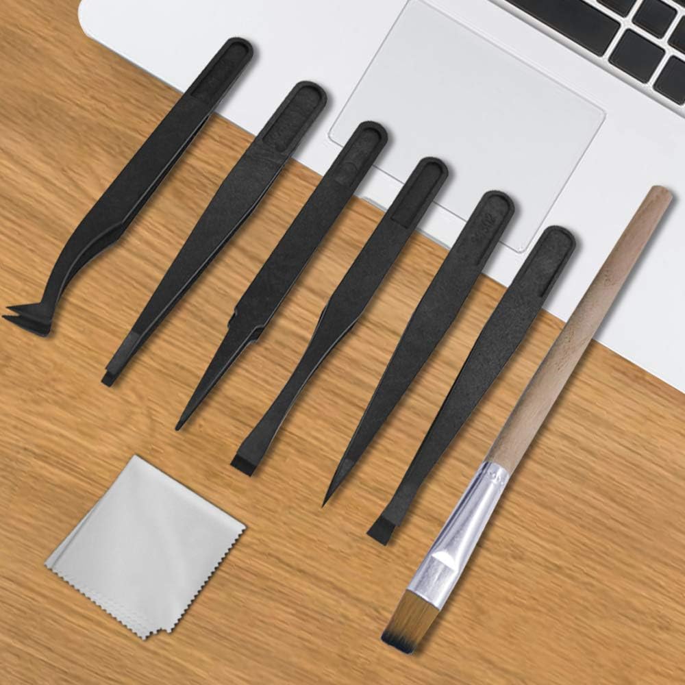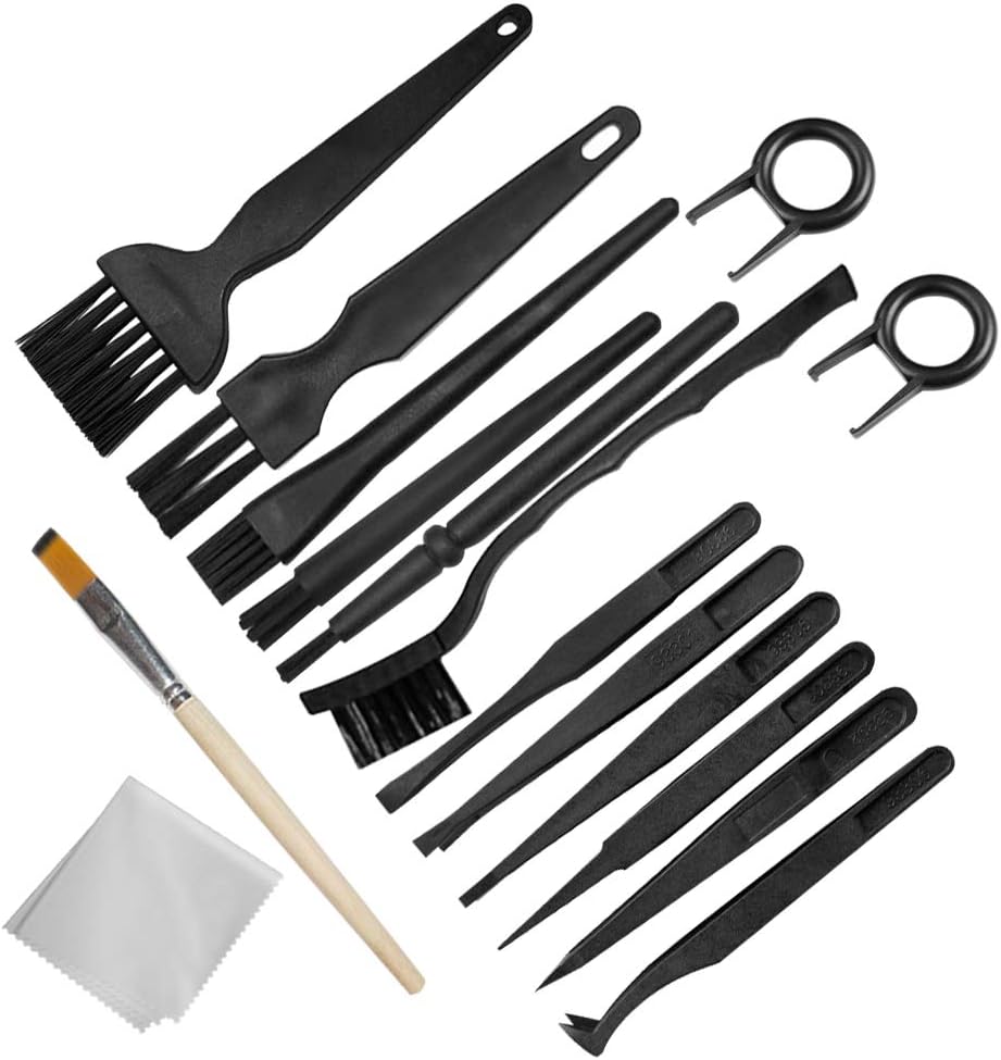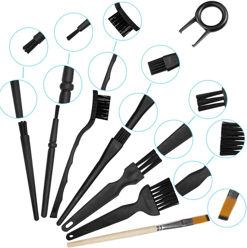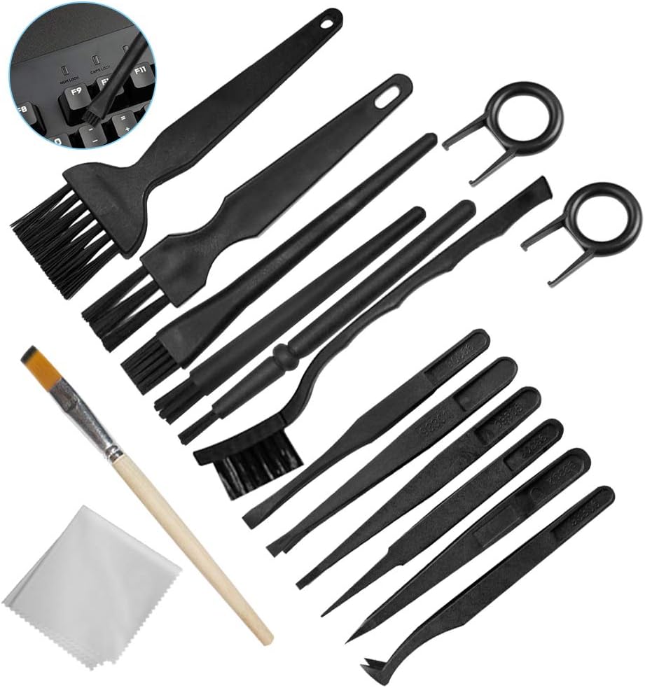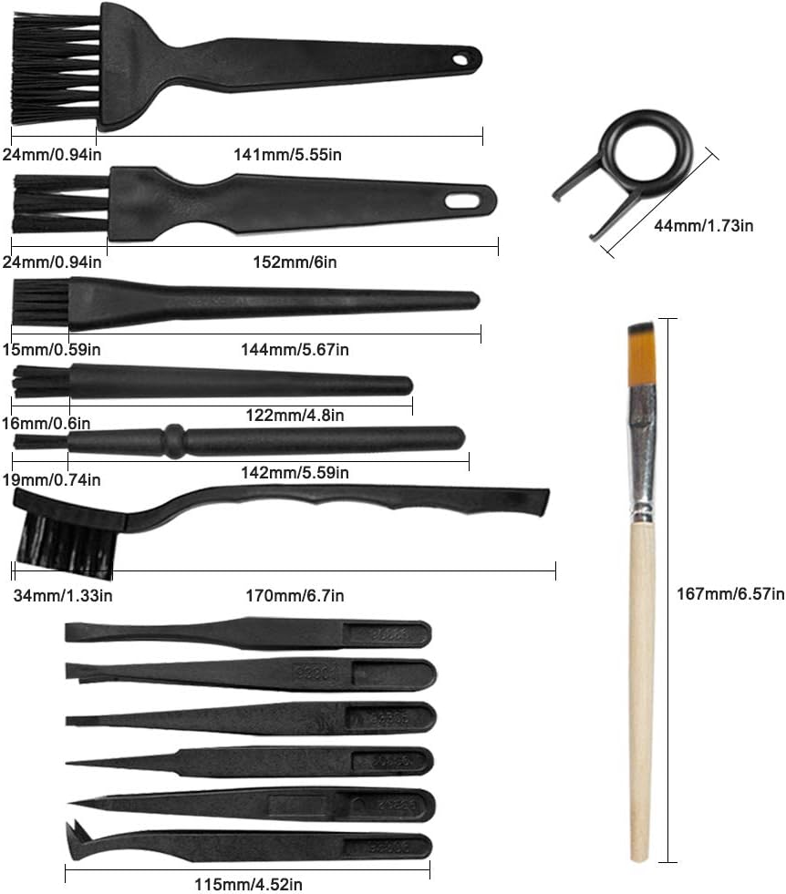 حزمة قيمة: تتضمن 6 قطع من الفرش المضادة للكهرباء الساكنة، و6 قطع من الملاقط المضادة للكهرباء الساكنة، وقطعتين من أدوات سحب لوحة المفاتيح، وقطعة واحدة من الفرشاة الخشبية، وقطعة واحدة من قماش المسح. مجموعة أدوات تنظيف عملية.