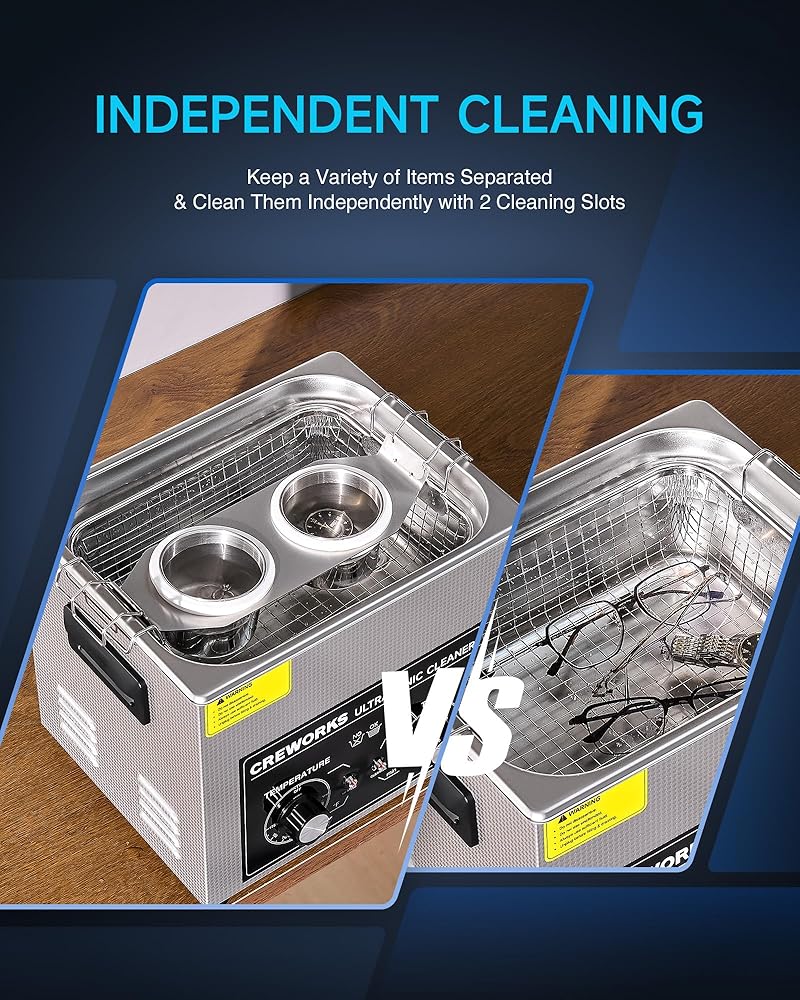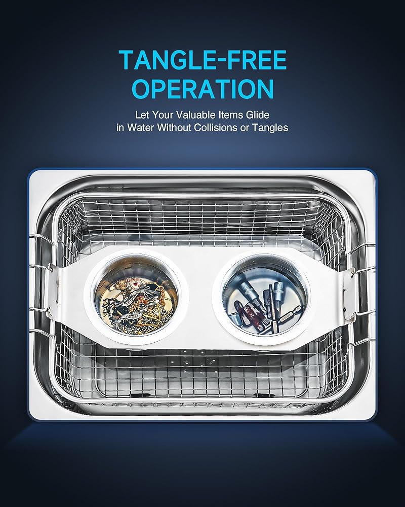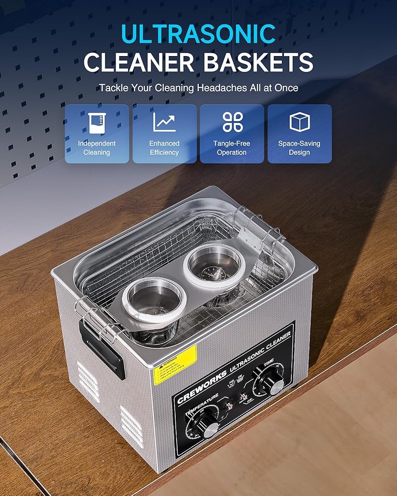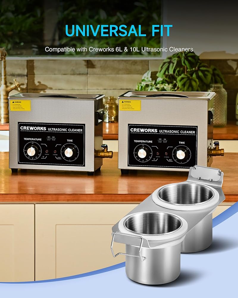 Say Goodbye to Cleaning Hassles: This 2-slot ultrasonic cleaner basket by Creworks provides safe and separate cleaning for your precious items, leaving them pristine and sparkling.