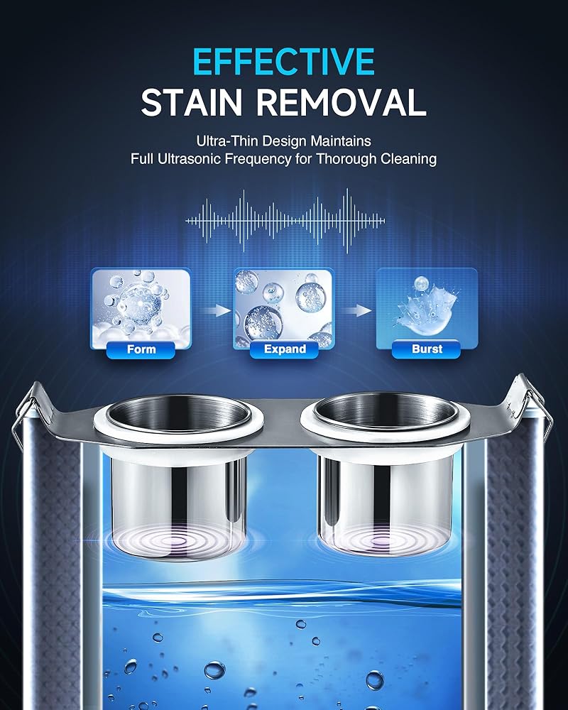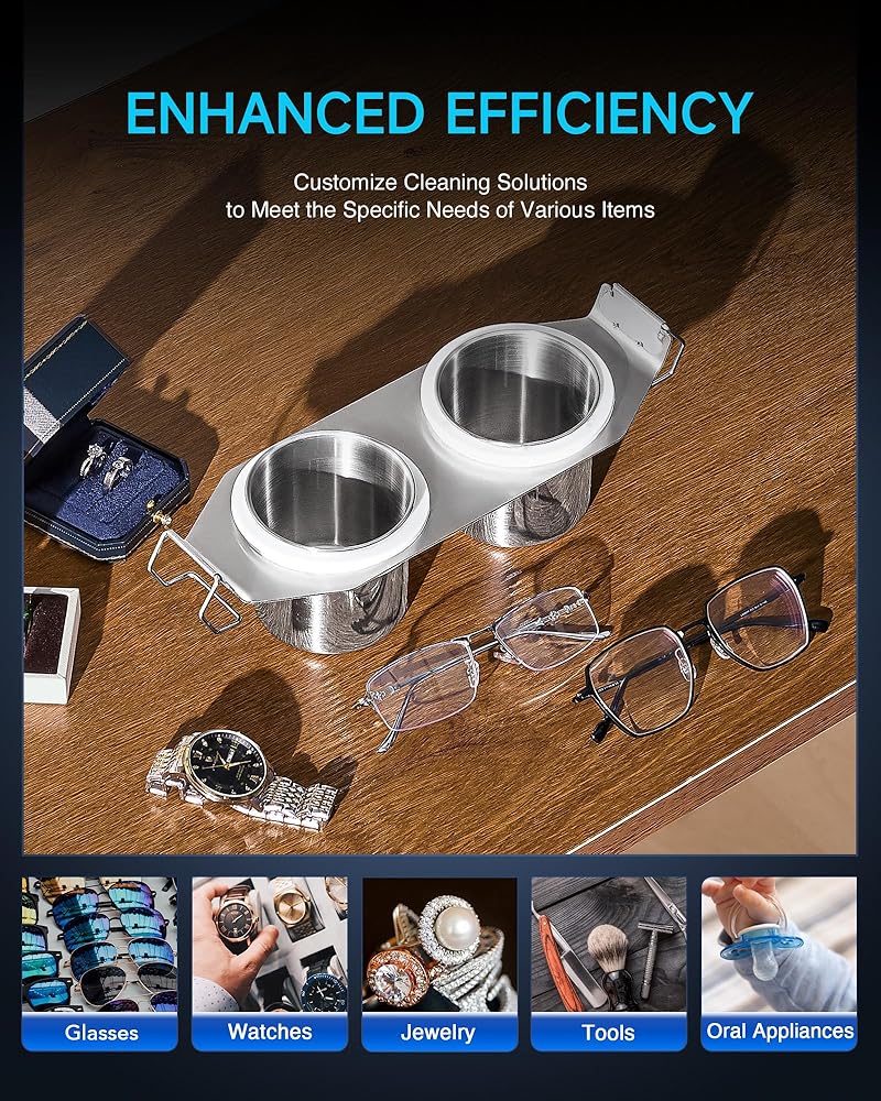 Boost Cleaning Efficiency: Bid farewell to time-consuming tasks. With two 300 mL slots, our ultrasonic cleaner basket tackles multiple items at once, saving you more time in each cleaning cycle.