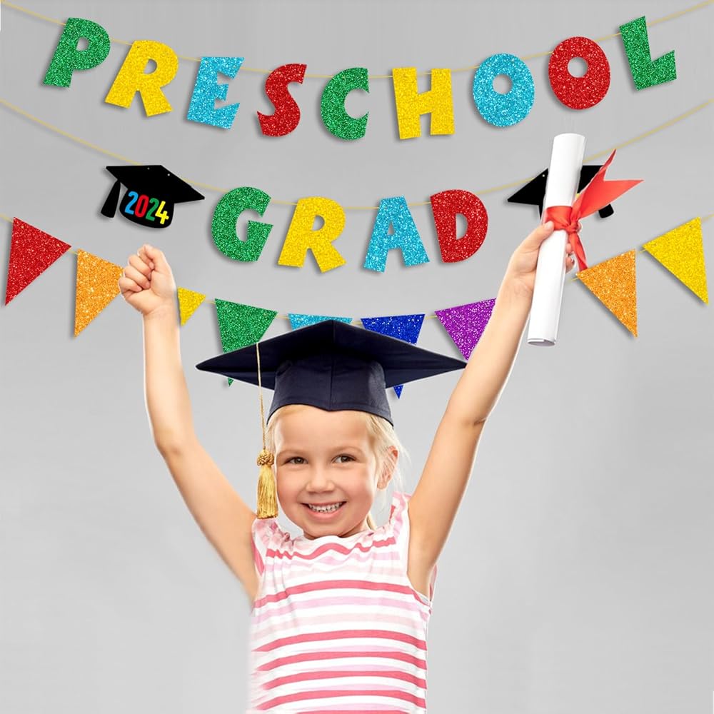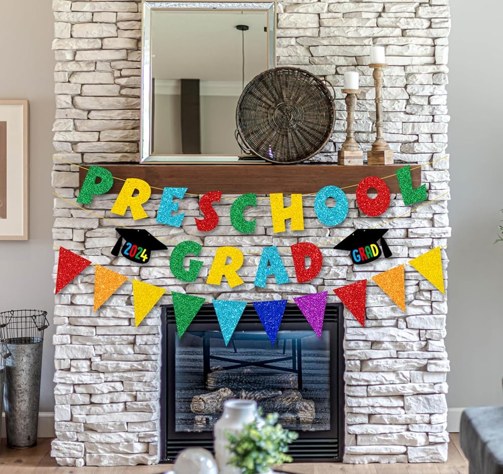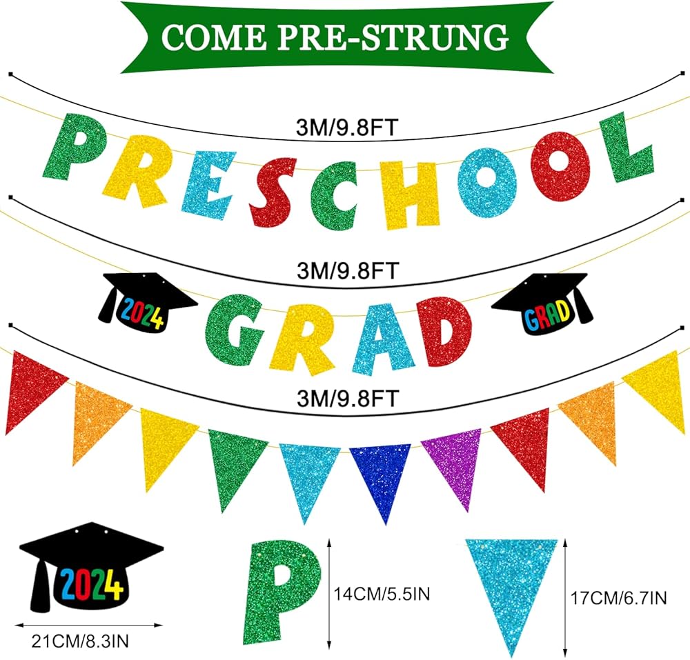 Wanting to have a cute 2022 preschool graduation party decorations? Glittery preschool grad banner with graduation cap signs and glittery pennant banner, a great banner set for school or home 2022 kids preschool graduation party decorations or kindergarten pre k congrats grad party decors, create cute atmosphere on your preschool grad party. The class of 2022 preschool graduate banner and pennant garland are beautifully crafted on a sturdy glitter paper. A perfect 2022 preschool graduation decorations banner purposely crafted for school or home preschool grad party. Features: - Colorful glittery card material, beautiful and durable. - Each letter length approx is 5.5 inch / 14 cm. Graduation cap length approx is 8.3 inch / 21 cm. Each pennant is 6.7 inch / 17 cm. The glittery preschool grad banner and glitter pennant garland are long enough (3 meters / 9.8 feet) - Colorful glittery "PRESCHOOL GRAD" words with graduation cap signs, and glittery pennant banner - “PRESCHOOL GRAD" banner and glittery pennant banner come pre-assembled, no DIY needed of buyer. Many Uses: - Preschool grad part, kindergarten pre-k graduation party, school kids preschool themed party and other any occasions. - Great Preschool congrats grad decorations to use on the school, living room, yard, garden, ceiling, in a doorway, window, and any other place, and used as photo booth backdrop EASY TO USE The preschool grad garland banner comes ready to hang, No DIY required, very convenient for you to hang on. You can adjust the gap between the flags freely, and the rope is long enough (3 meters / 9.8 feet long) for hanging it any where you want. Package Includes 1 x Colorful Glittery PRESCHOOL Banner (Come Pre-strung) 1 x Colorful Glittery GRAD Banner with 2022 Grad Graduation Cap Signs (Come Pre-strung) 1 x Colorful Glittery Pennant Garland Banner (Come Pre-strung)